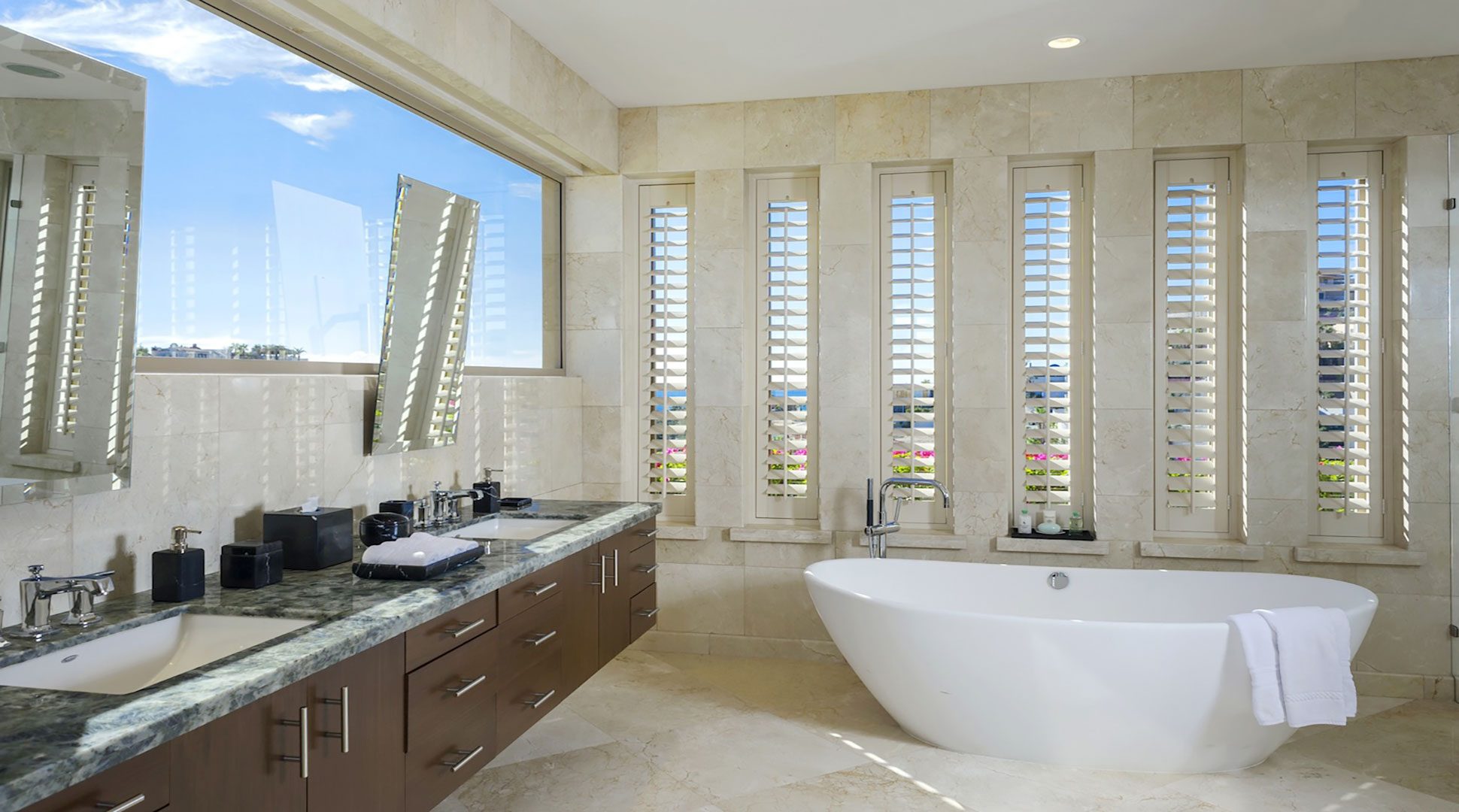 Spa-inspired bathrooms stocked with premium bath products and plush robes