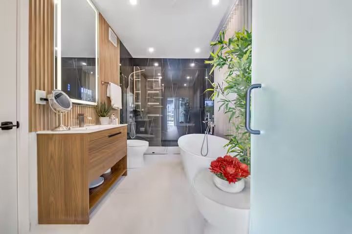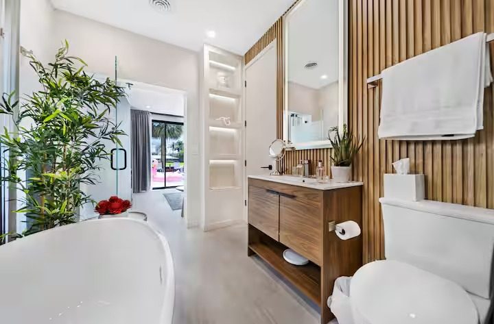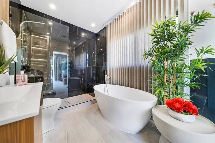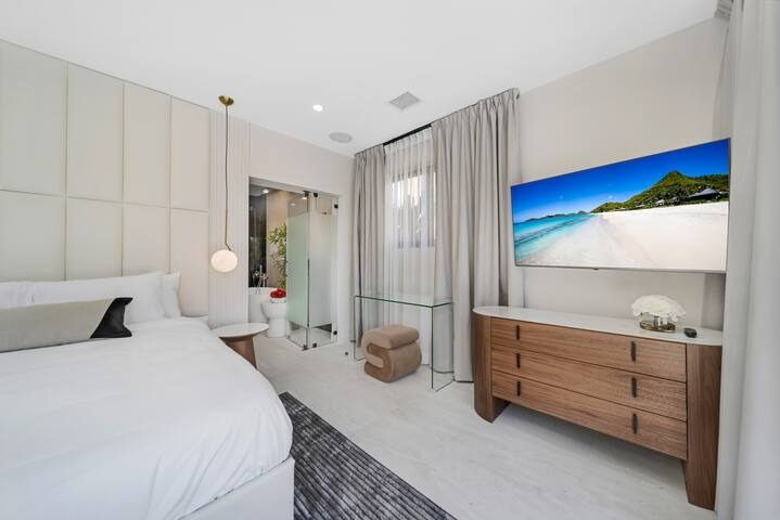 Bathrooms showcase contemporary finishes and thoughtfully selected fixtures, offering a spa-inspired experience that complements the villa’s elegant aesthetic.