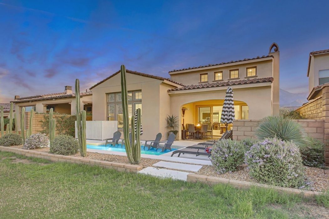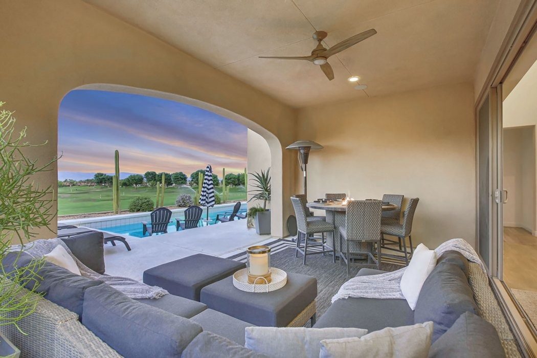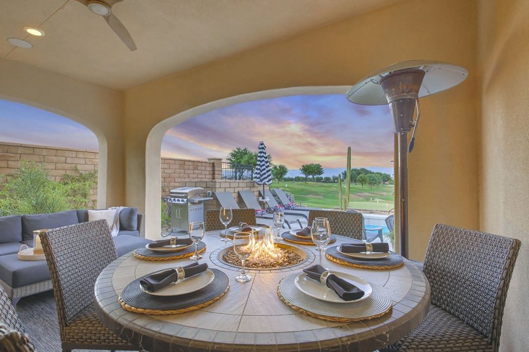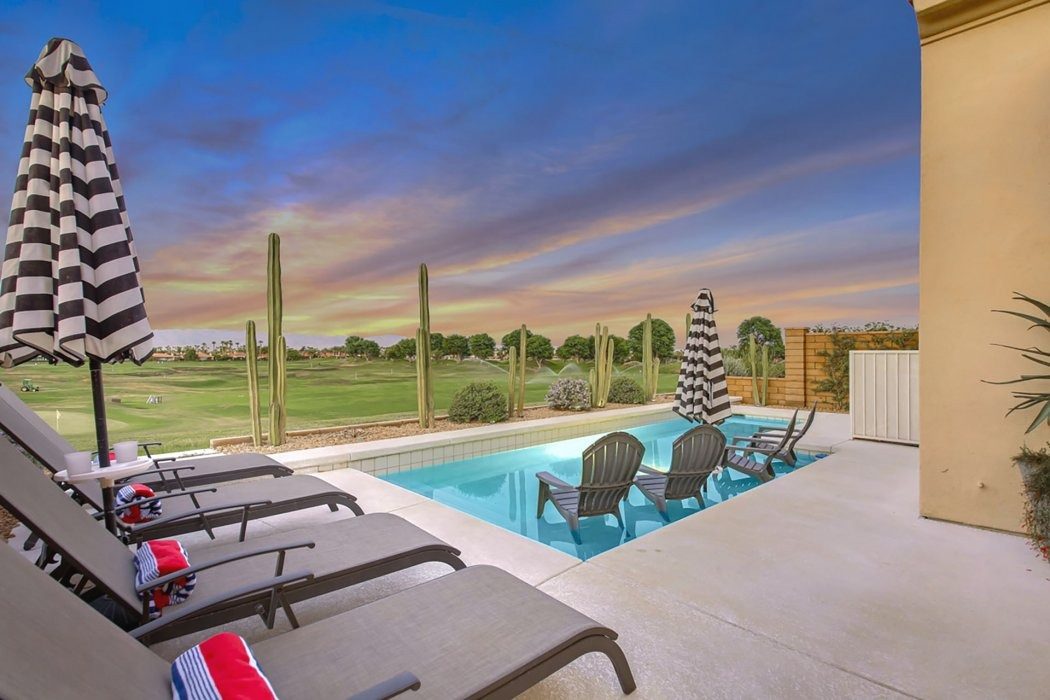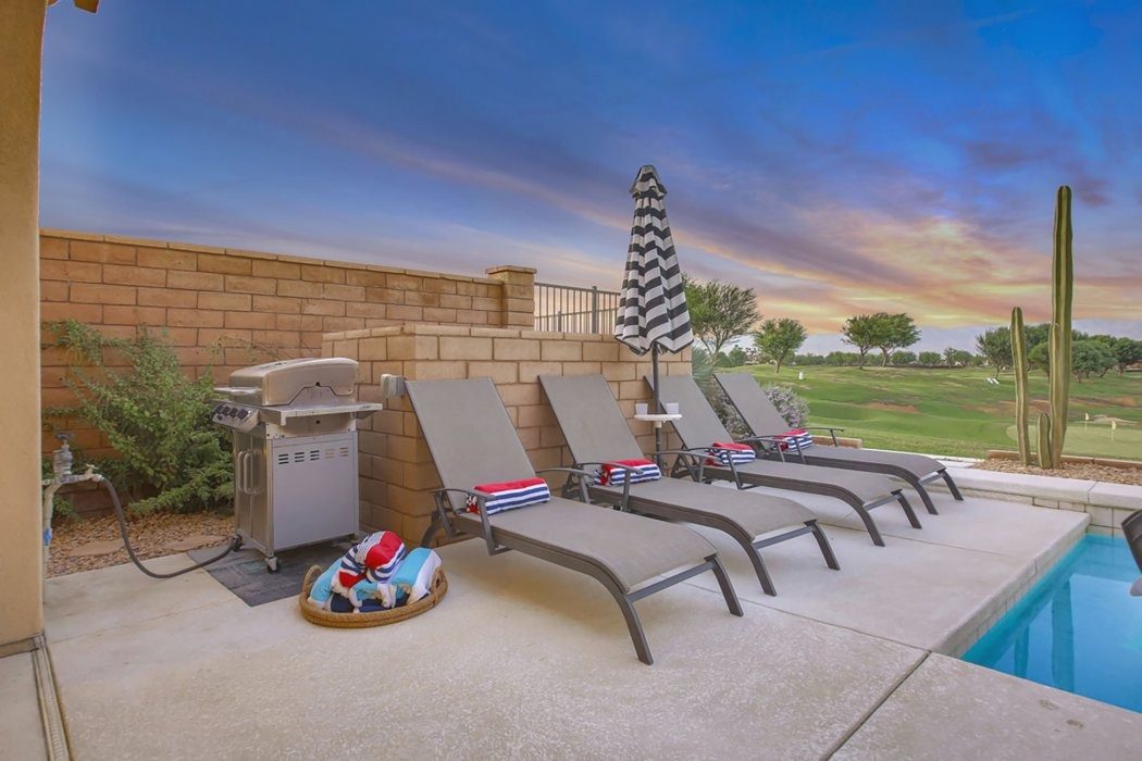 Step into your private backyard oasis featuring a sparkling pool with tanning shelf, surrounded by lounge chairs for sunbathing and relaxation. Take in breathtaking golf course and mountain views while gathering in the covered outdoor lounge or around the fire pit table. Enjoy alfresco meals at the backyard dining table or the charming courtyard dining area.