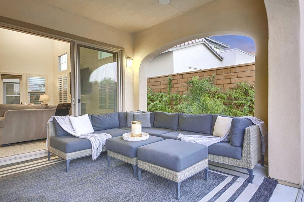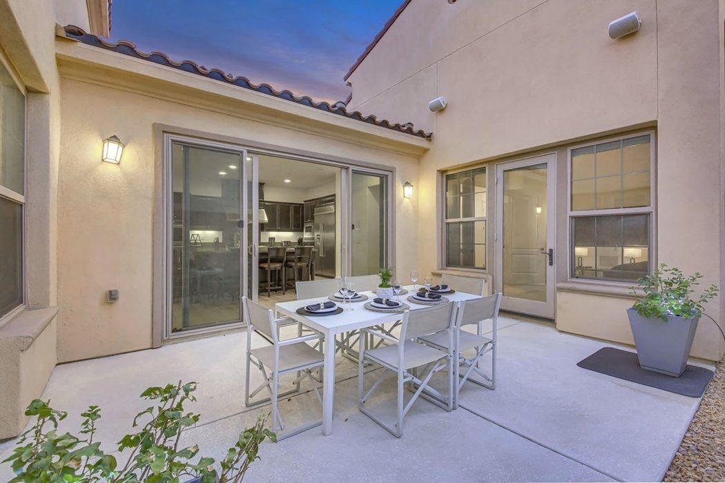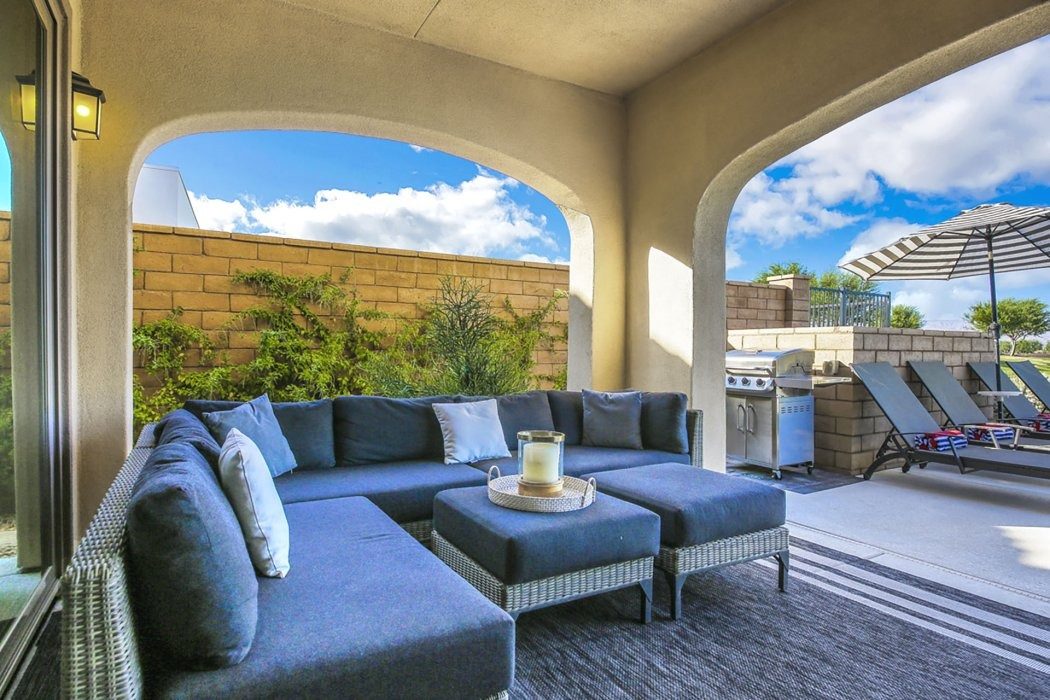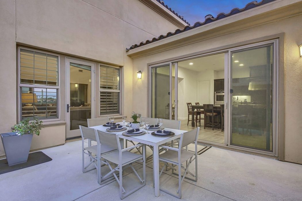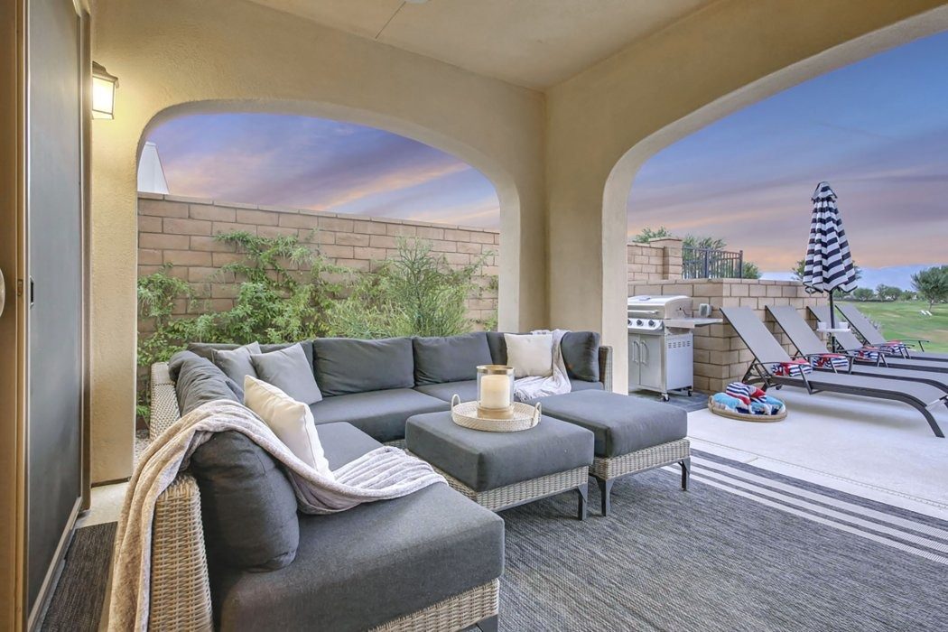 Step into your private backyard oasis featuring a sparkling pool with tanning shelf, surrounded by lounge chairs for sunbathing and relaxation. Take in breathtaking golf course and mountain views while gathering in the covered outdoor lounge or around the fire pit table. Enjoy alfresco meals at the backyard dining table or the charming courtyard dining area.
