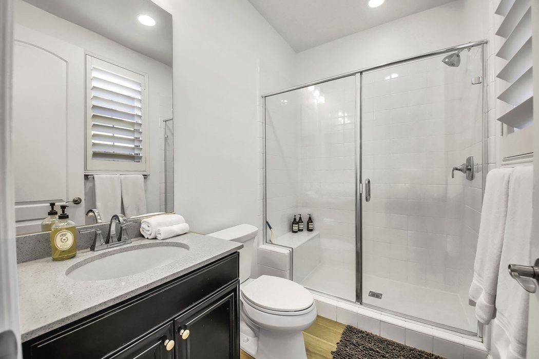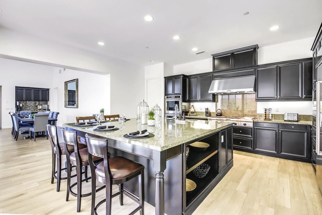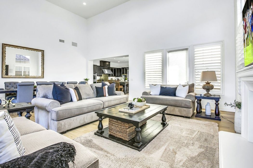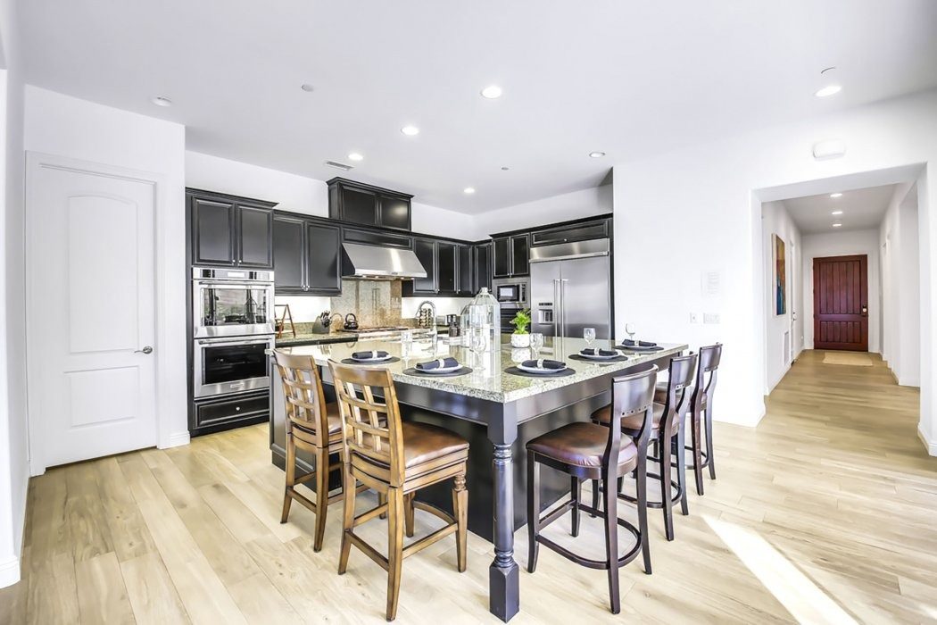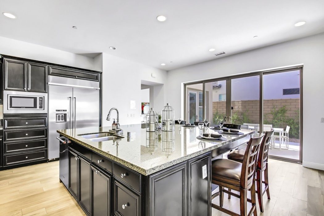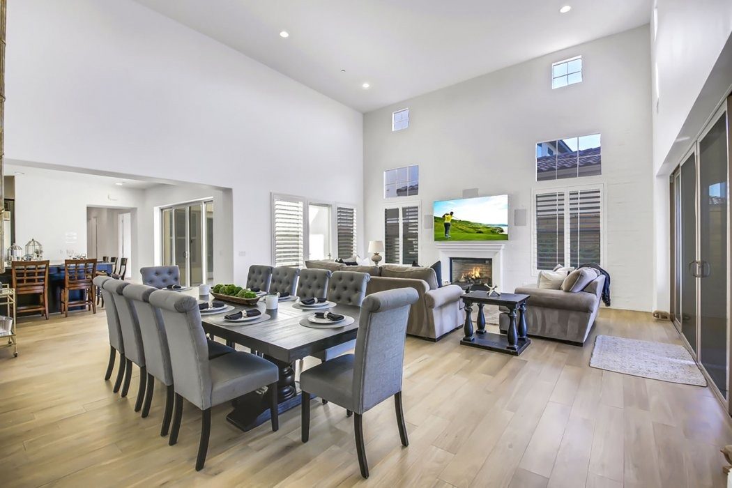 The open-concept design showcases a stylish great room with a sectional sofa, TV, gas fireplace, and walls of windows that connect seamlessly to the covered loggia. The formal dining table seats 10, with additional space for five at the large kitchen island. The gourmet kitchen comes fully equipped with top-of-the-line appliances, cookware, utensils, and glassware.