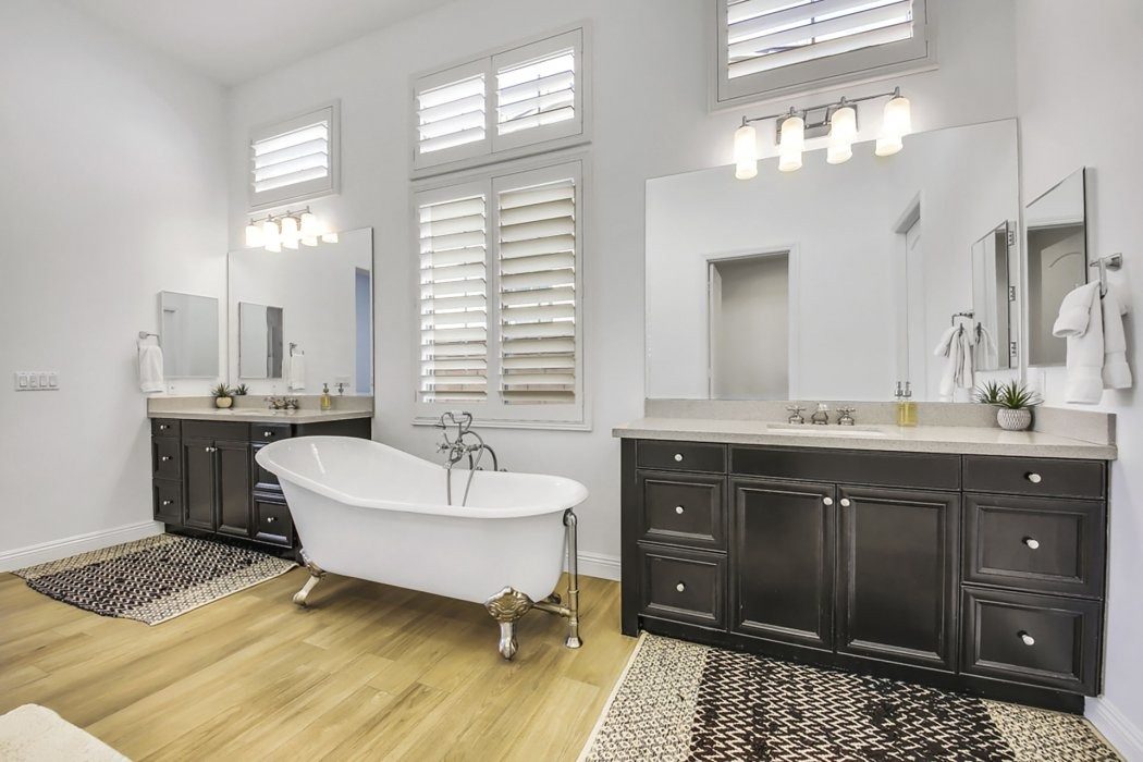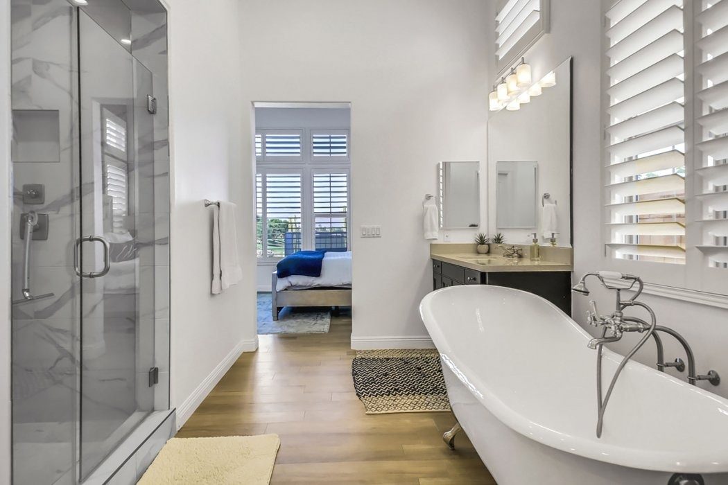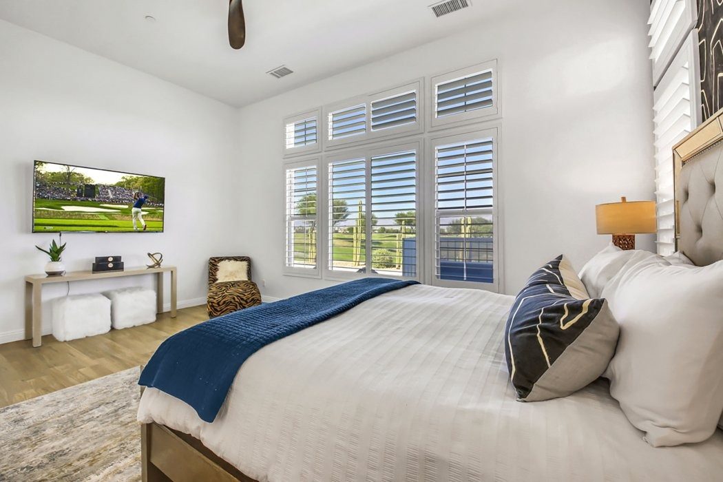 Primary Suite: King bed, golf course views, walk-in closet, spa-style en suite with dual vanities, soaking clawfoot tub, and walk-in shower.