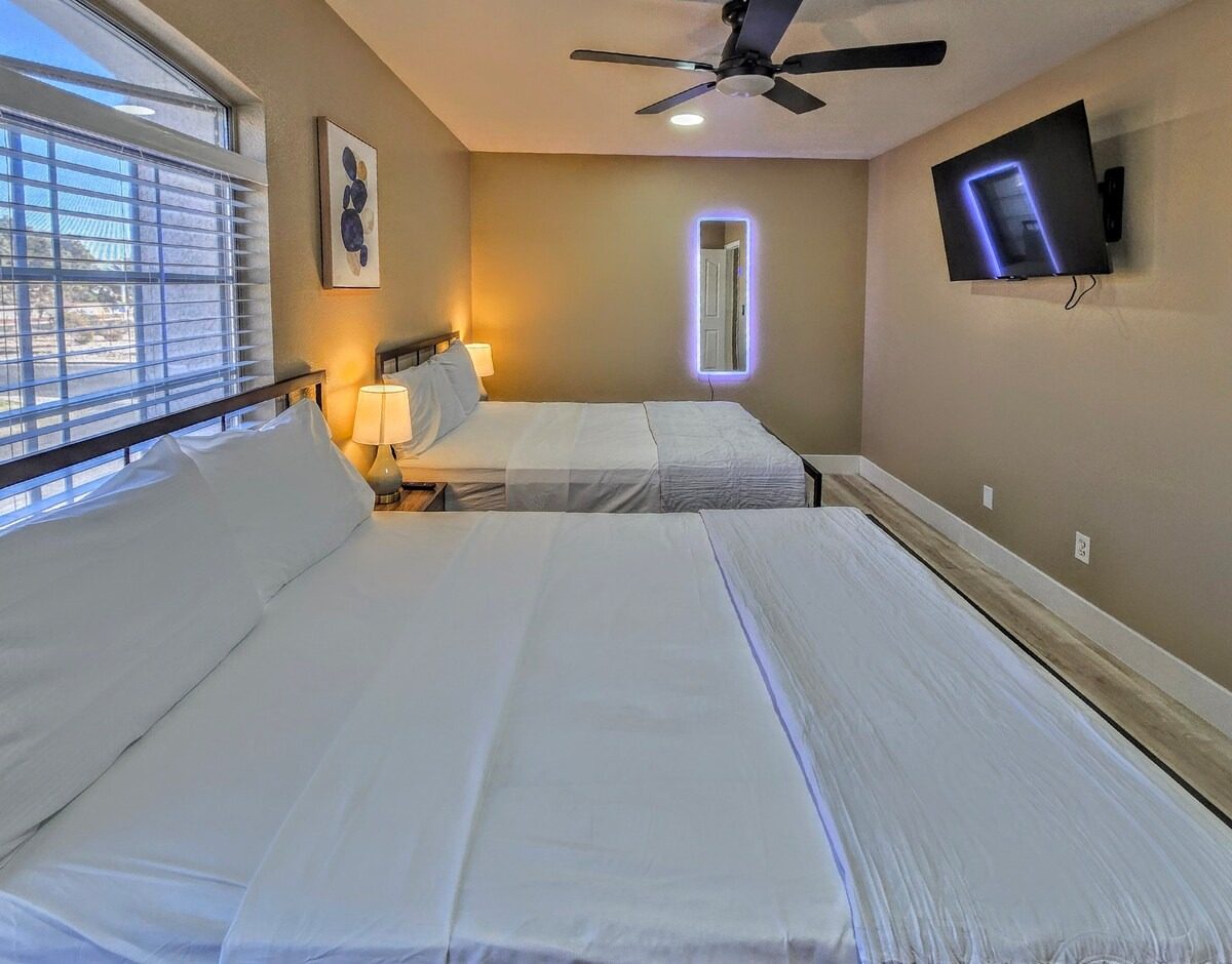 The home showcases an expansive open-plan living area with modern décor, smart TVs, and plush, comfortable seating. Ideal for group gatherings or downtime, the space is complemented by a fully equipped kitchen featuring updated appliances, ample cookware, and all essentials for preparing meals ranging from casual breakfasts to large dinner events.
