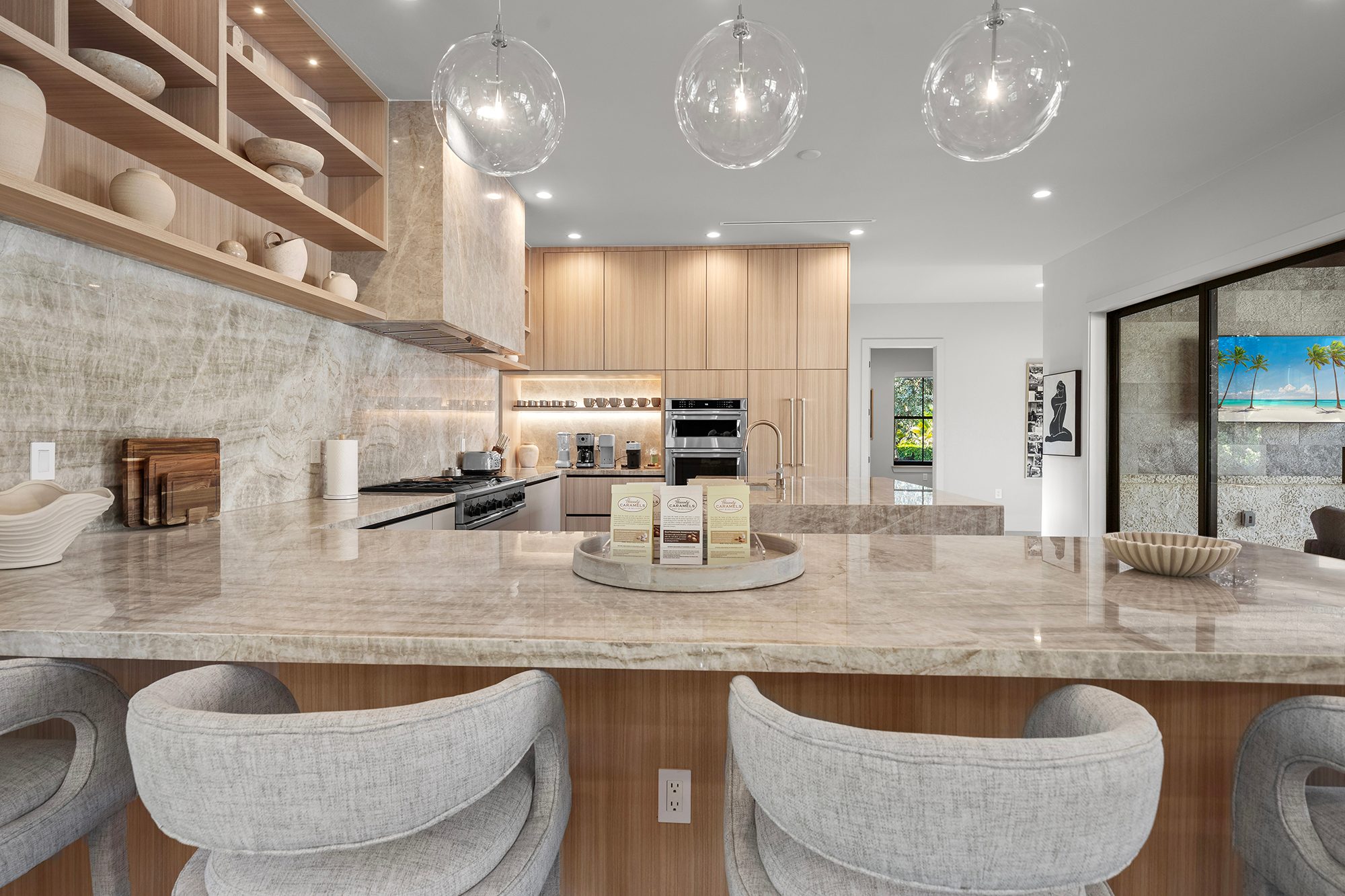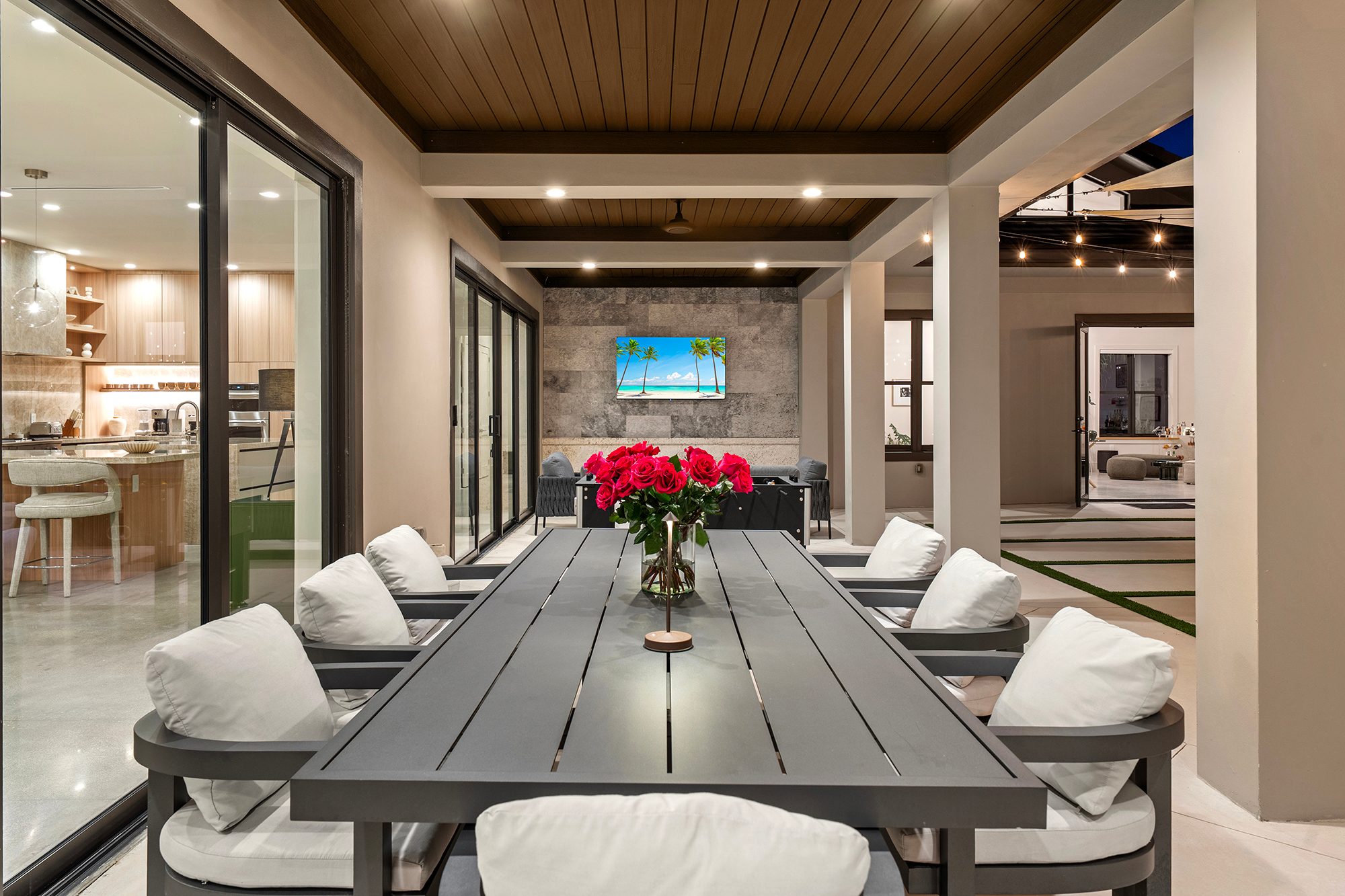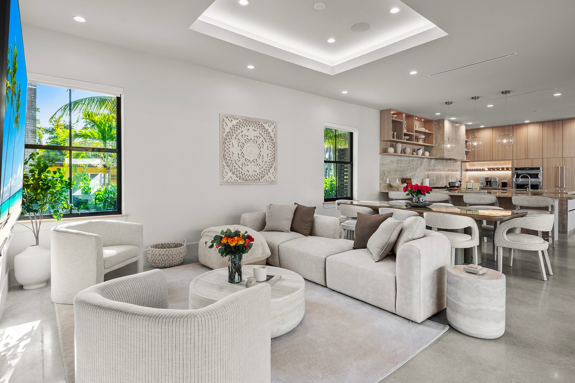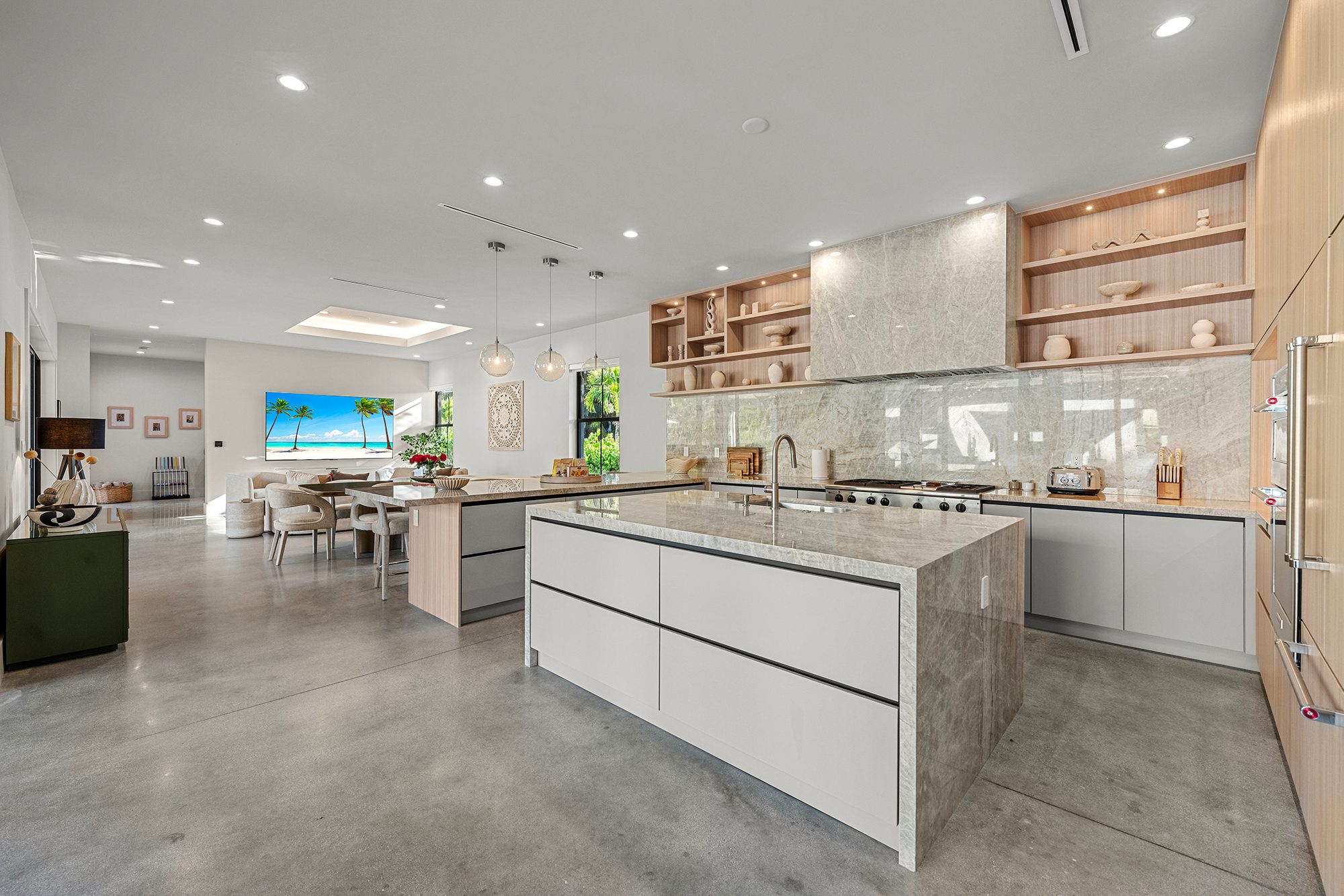 Inside, soaring ceilings and sleek, modern interiors create an airy, inviting atmosphere. The open-concept living room offers plush seating, a large Smart TV, and seamless views of the pool and gardens through walls of glass. The fully equipped gourmet kitchen is outfitted with high-end appliances, quartz countertops, and a spacious island with bar seating. The dining area comfortably accommodates group meals, while multiple lounge spaces provide plenty of room to gather or unwind.