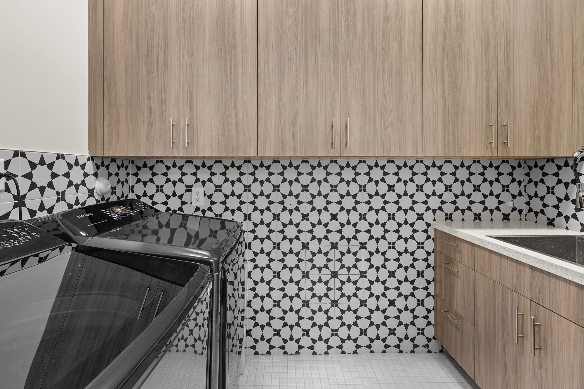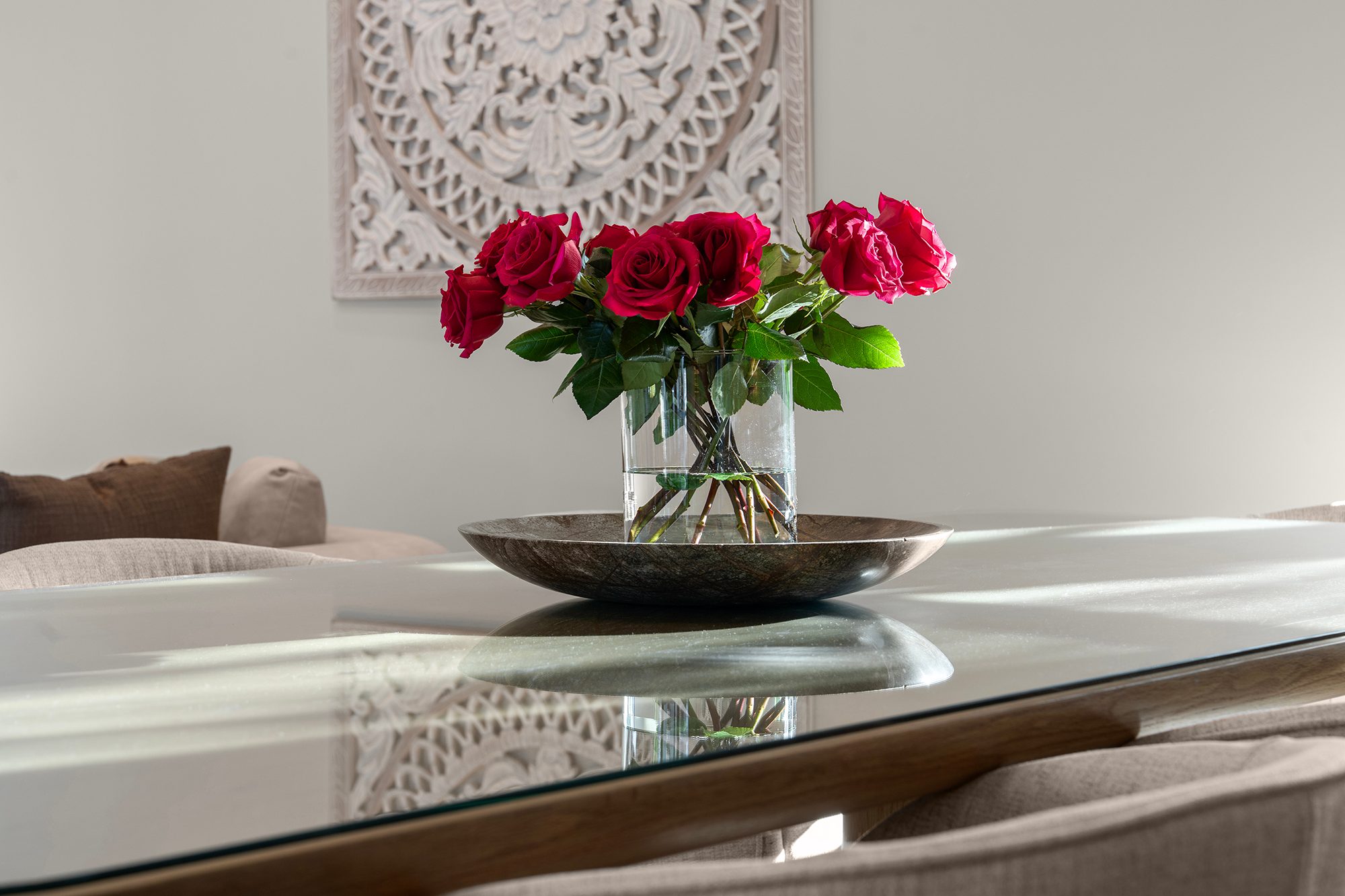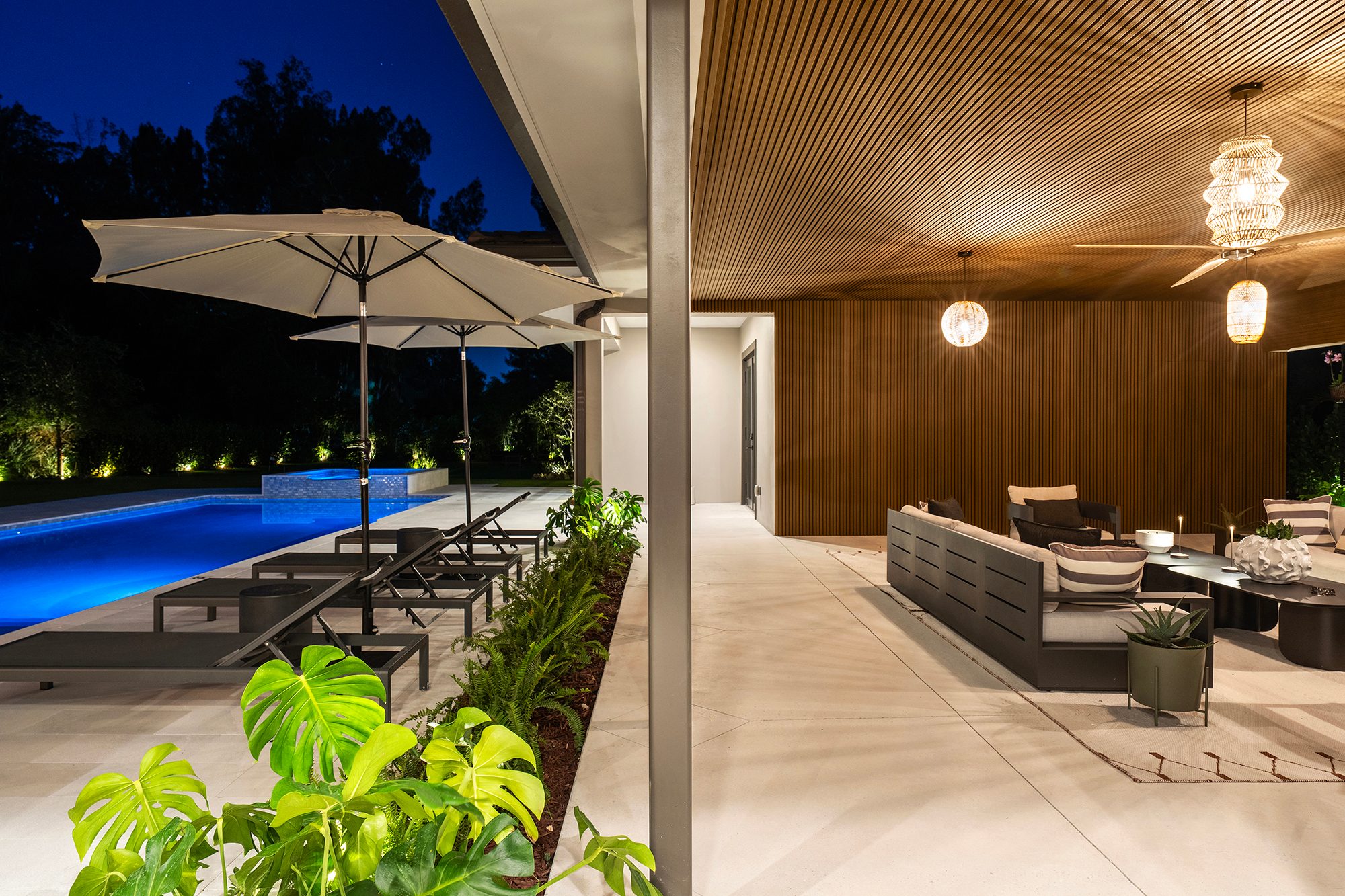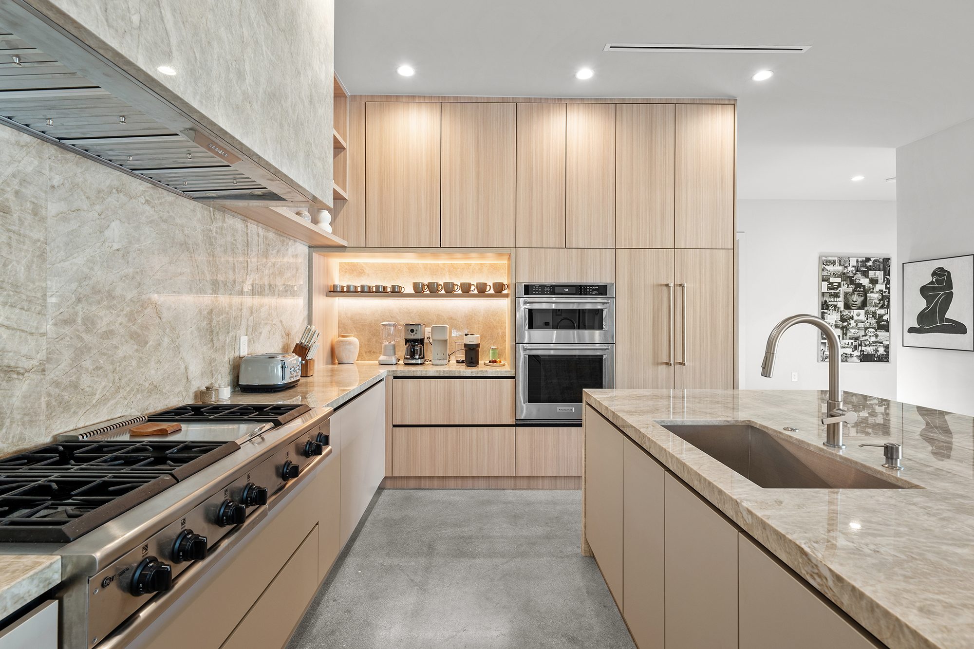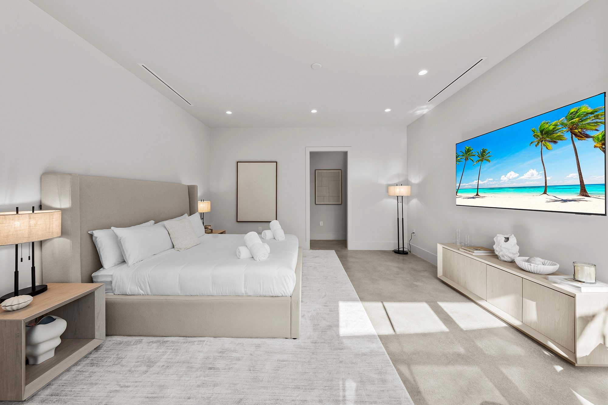 Inside, soaring ceilings and sleek, modern interiors create an airy, inviting atmosphere. The open-concept living room offers plush seating, a large Smart TV, and seamless views of the pool and gardens through walls of glass. The fully equipped gourmet kitchen is outfitted with high-end appliances, quartz countertops, and a spacious island with bar seating. The dining area comfortably accommodates group meals, while multiple lounge spaces provide plenty of room to gather or unwind.