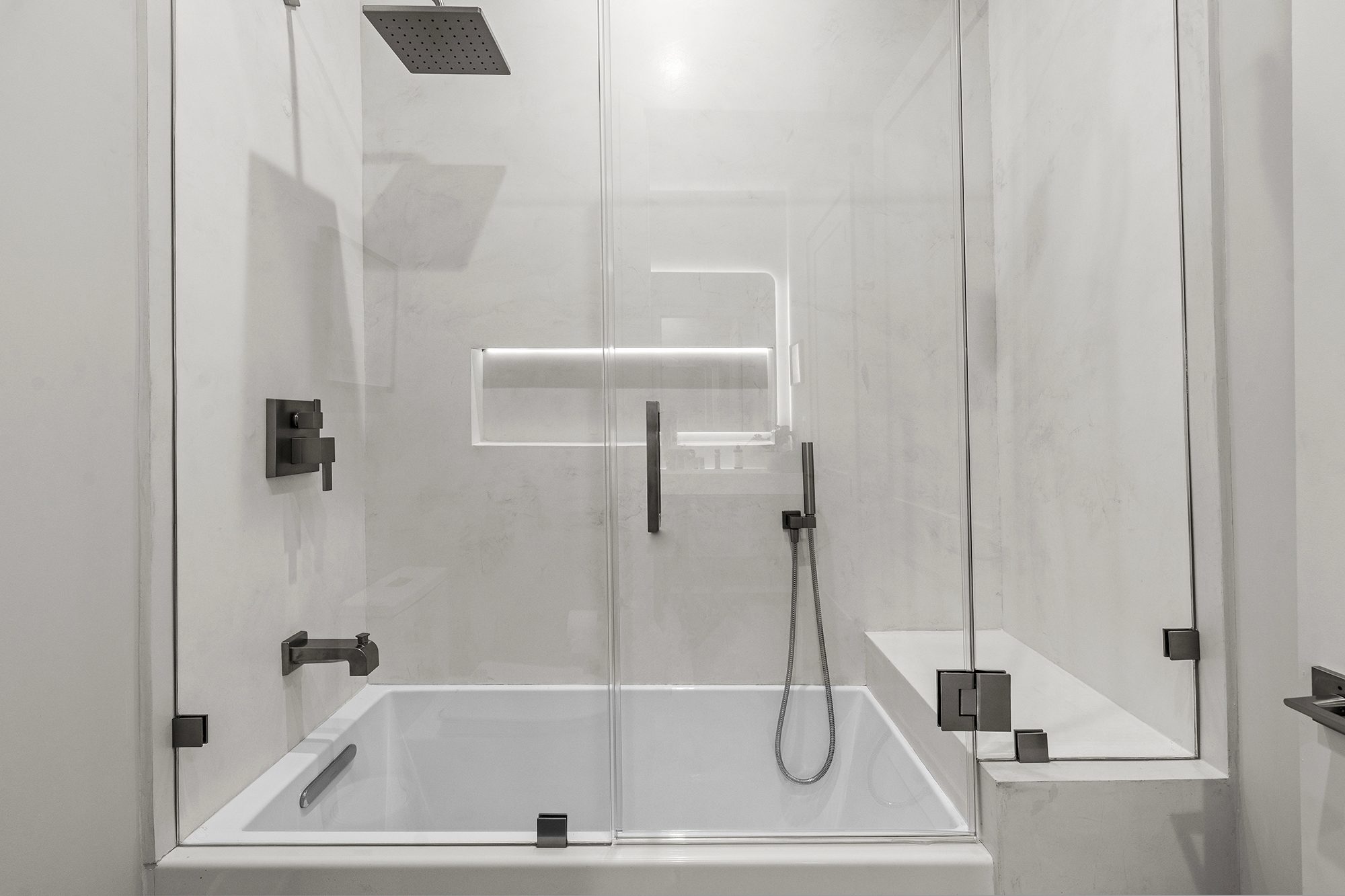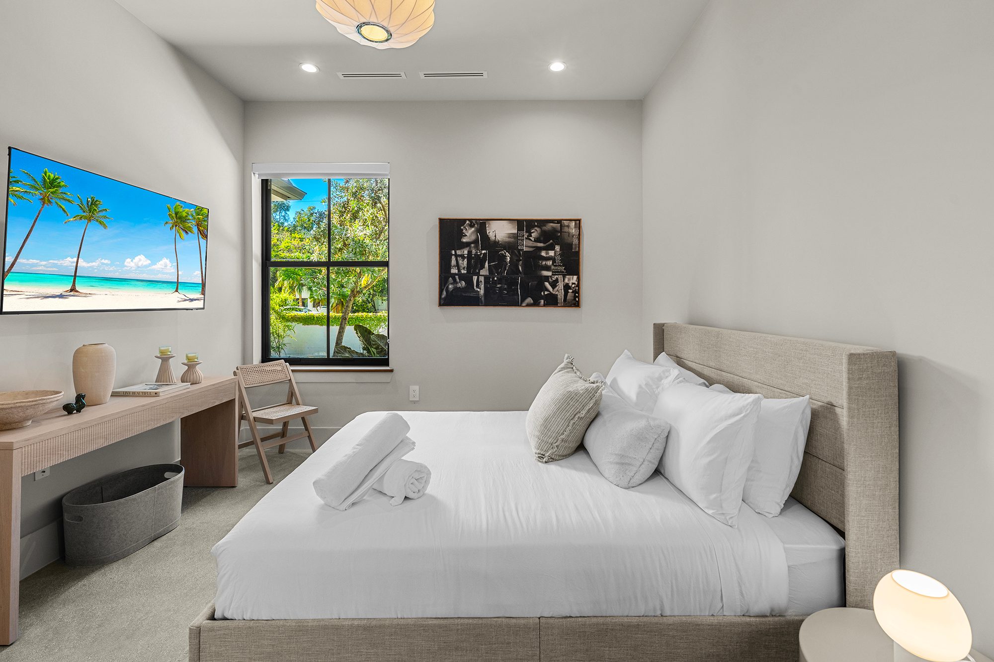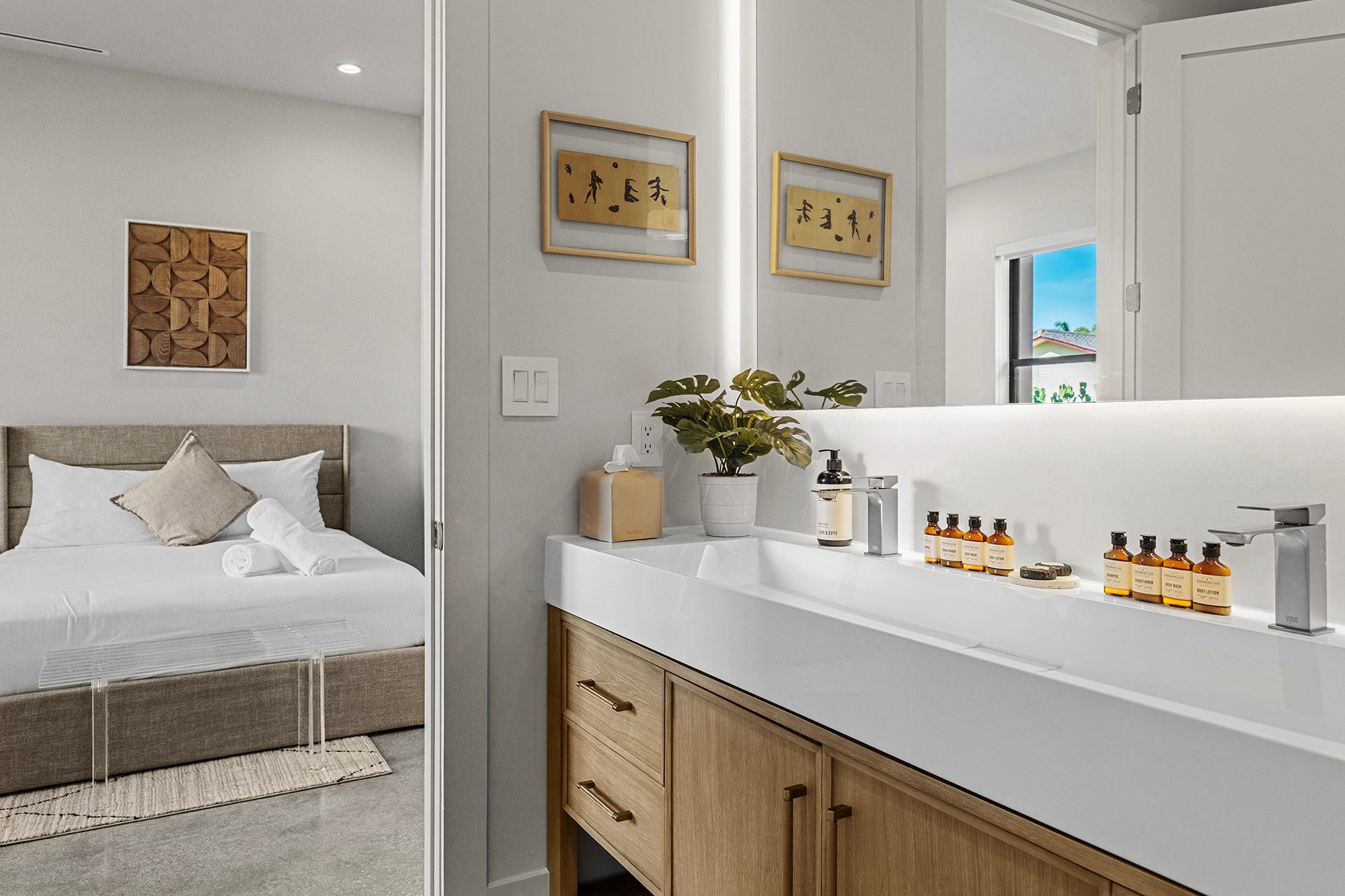 Primary Suite: King bed, walk-in closet, spa-style bathroom with soaking tub and rainfall shower, private access to the pool.