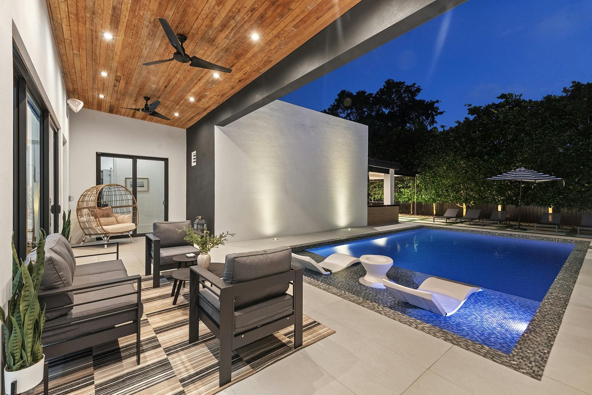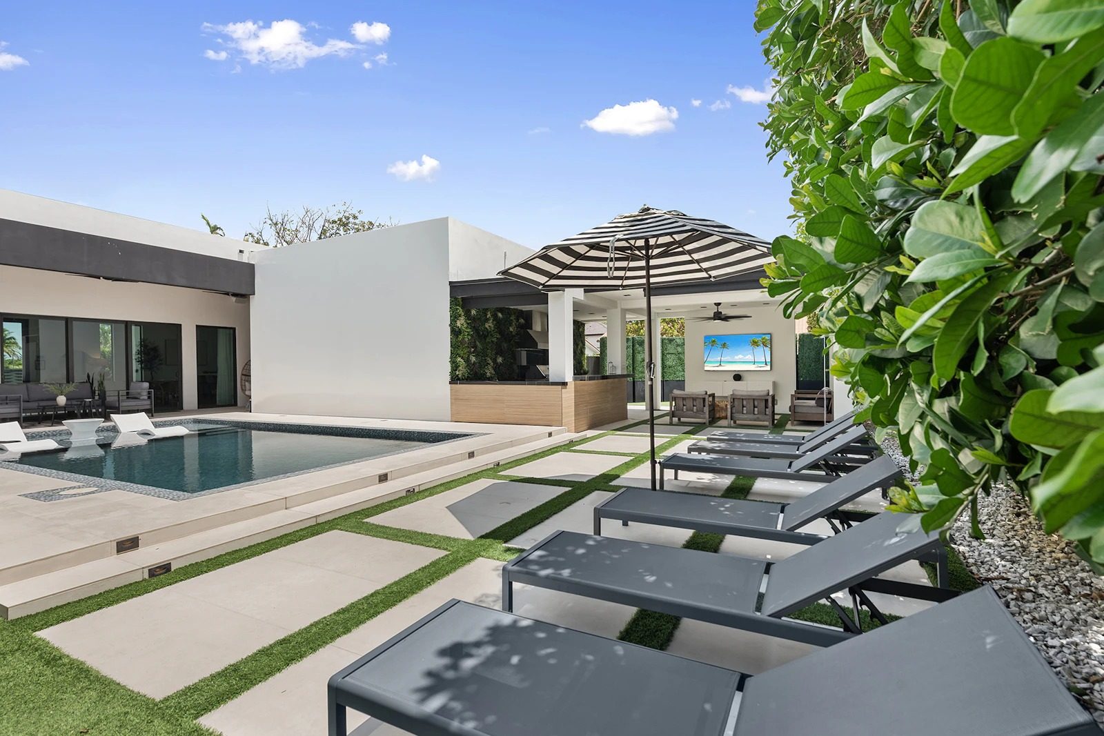 Step outside to discover your own resort-style backyard: a sparkling pool with sun loungers, a bubbling jacuzzi hot tub, and an outdoor kitchen with bar seating and a covered lounge area complete with a flat-screen TV—ideal for hosting, dining, or simply unwinding day or night. For active guests, enjoy a private basketball area, ping pong table, and plenty of open-air space to gather with family and friends.