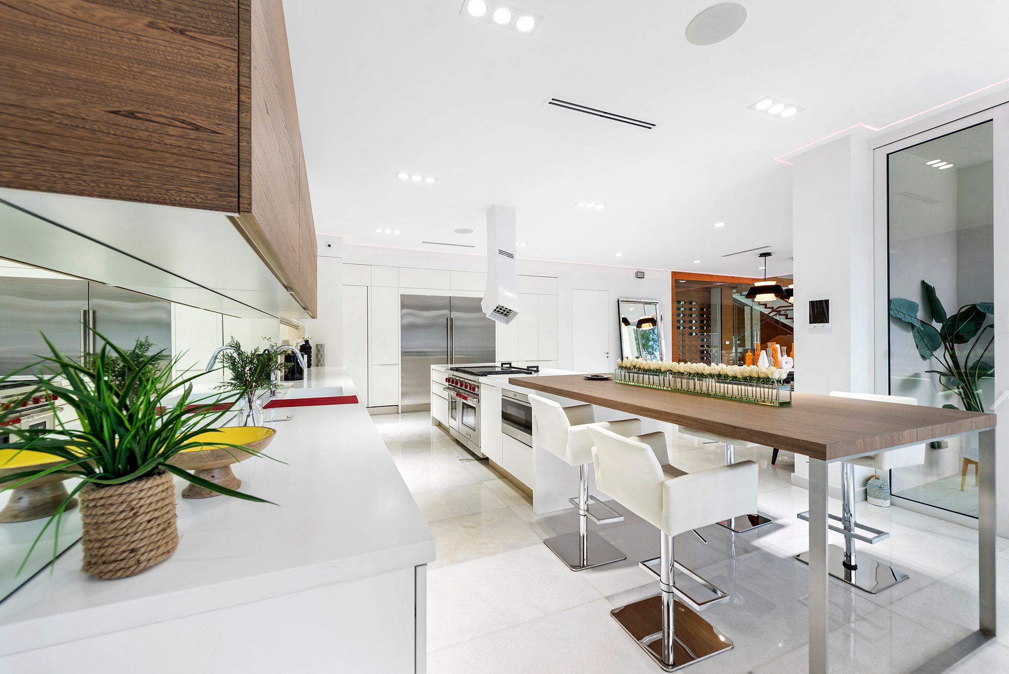 Inside, the home is outfitted with the latest smart home technology and designer finishes throughout. The stunning Dada Italian kitchen, equipped with Wolf and SubZero appliances, is a chef’s dream, while additional spaces include a state-of-the-art media room, fully equipped fitness center, and dual driveways for convenience.