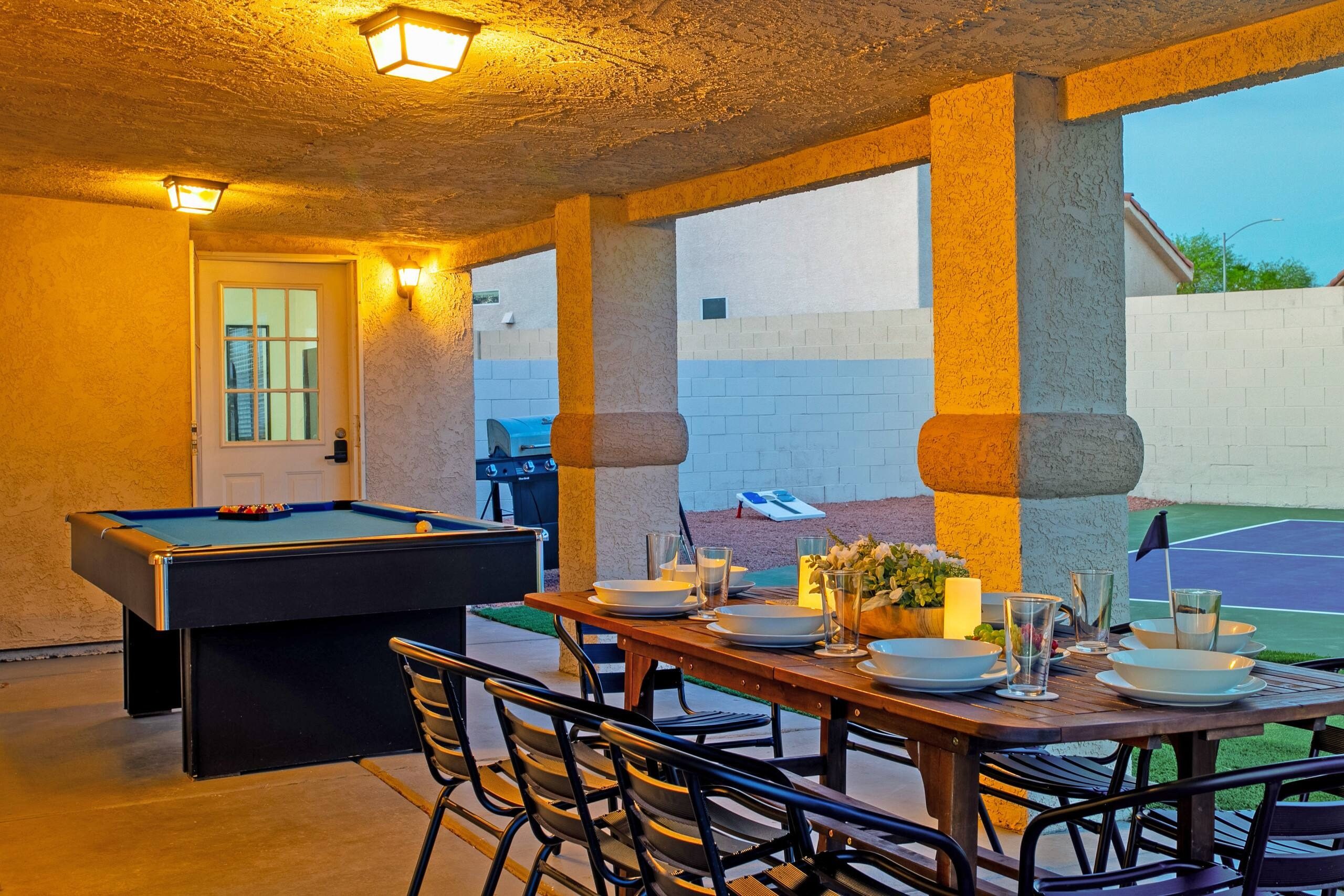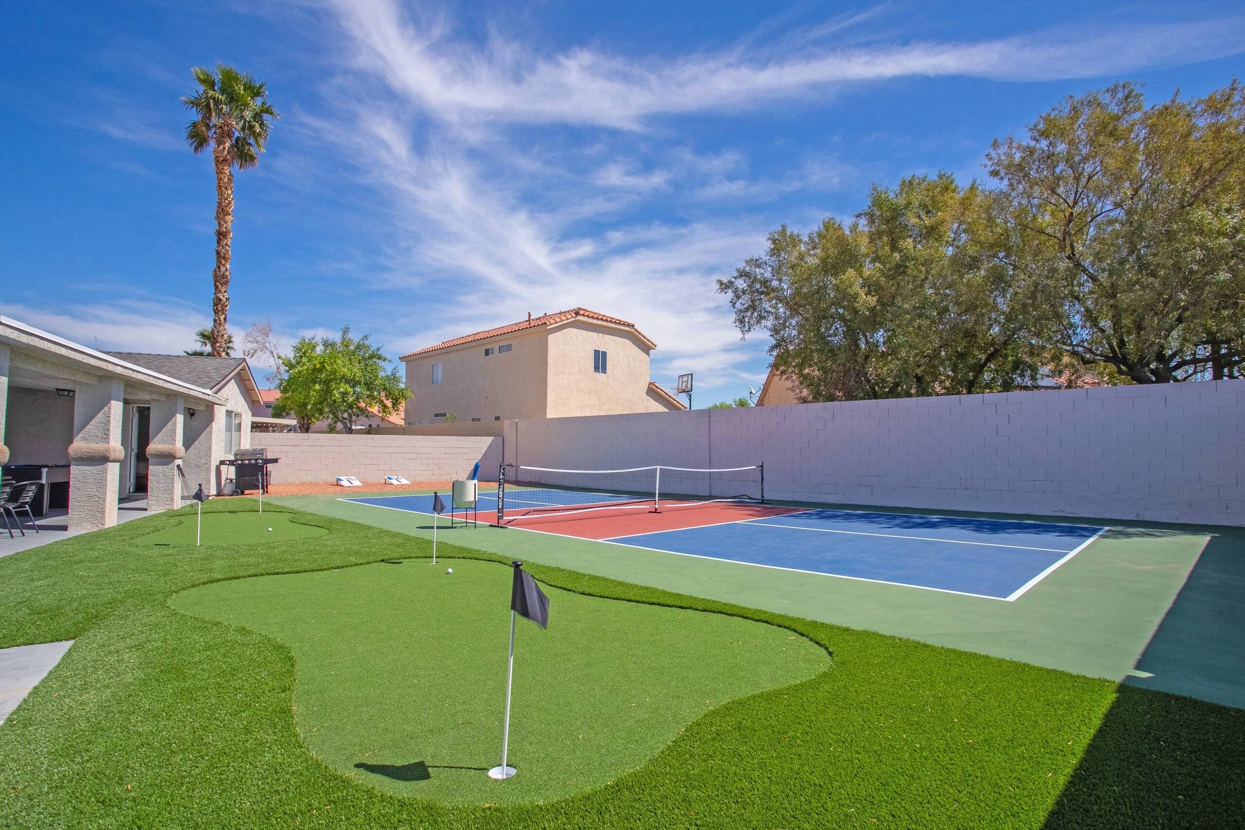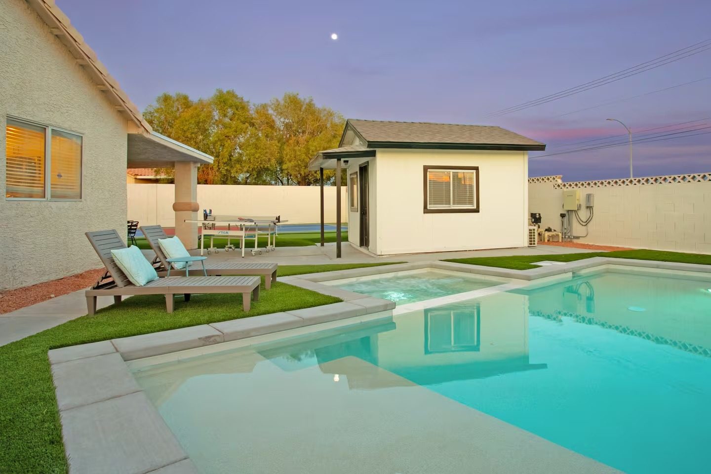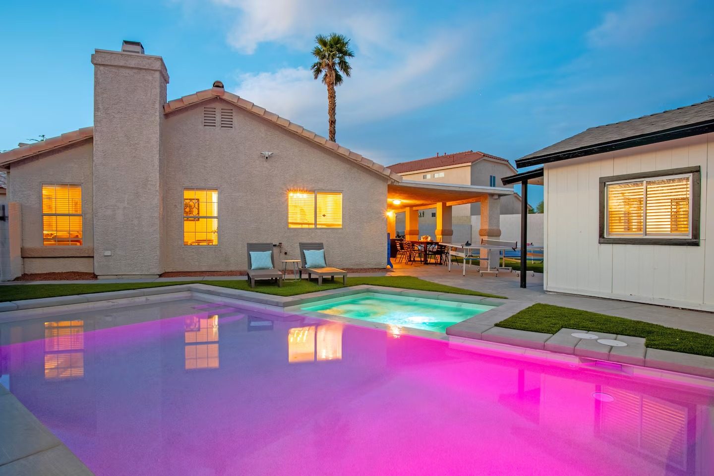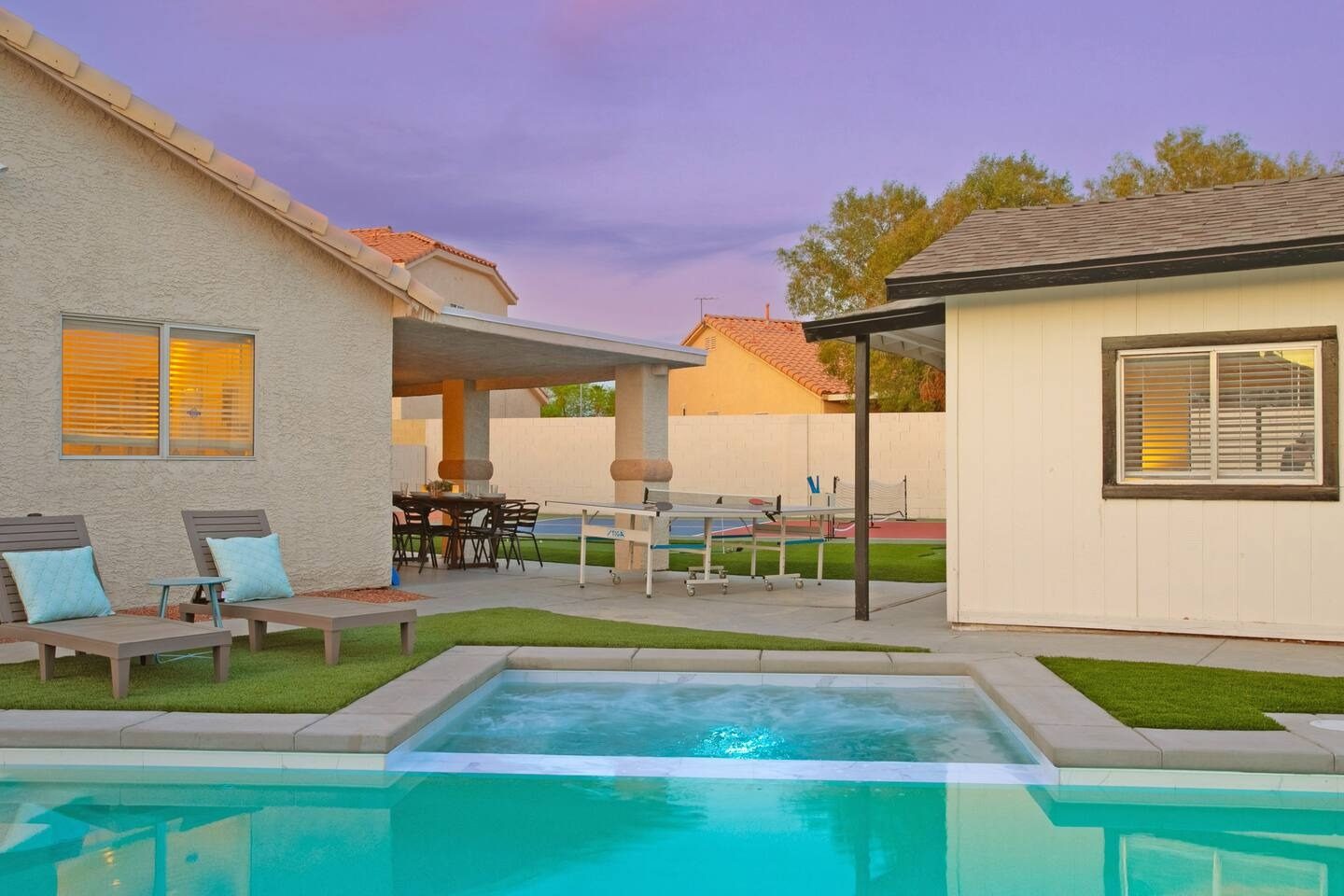 Villa Palmora House is an expansive and fun-filled vacation retreat designed to deliver both relaxation and entertainment for families or groups of up to 14 guests. This beautifully appointed six-bedroom villa blends generous indoor living spaces with exciting recreational features that make it much more than just a place to sleep. Inside, you’ll find a fully equipped kitchen, comfortable communal areas, and thoughtful amenities that cater to large groups, including a dedicated movie room for cozy nights in and game-friendly spaces like a pickleball court, arcade machines, pool table, ping pong and other backyard games that keep everyone entertained. Step outside to your private outdoor oasis — where a sparkling pool and spa offer the perfect setting for soaking up the Nevada sun by day or unwinding under the stars at night. Each bedroom provides a comfortable resting spot after a day of adventure, whether you’re exploring the Las Vegas Strip’s world-class dining and entertainment or enjoying local attractions closer to home. Located in a quiet North Las Vegas neighborhood just a short drive from the Strip and other major points of interest, Villa Palmora House combines convenience with comfort, making it an ideal choice for celebratory trips, golf vacations, family reunions, or any group getaway where memorable moments and shared experiences matter.