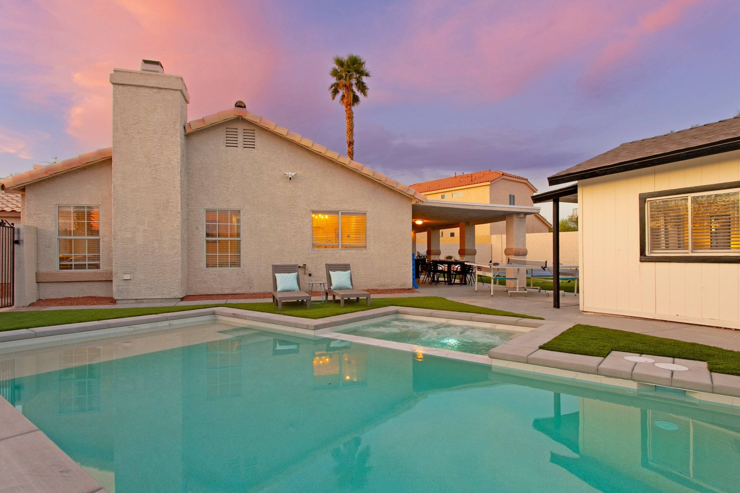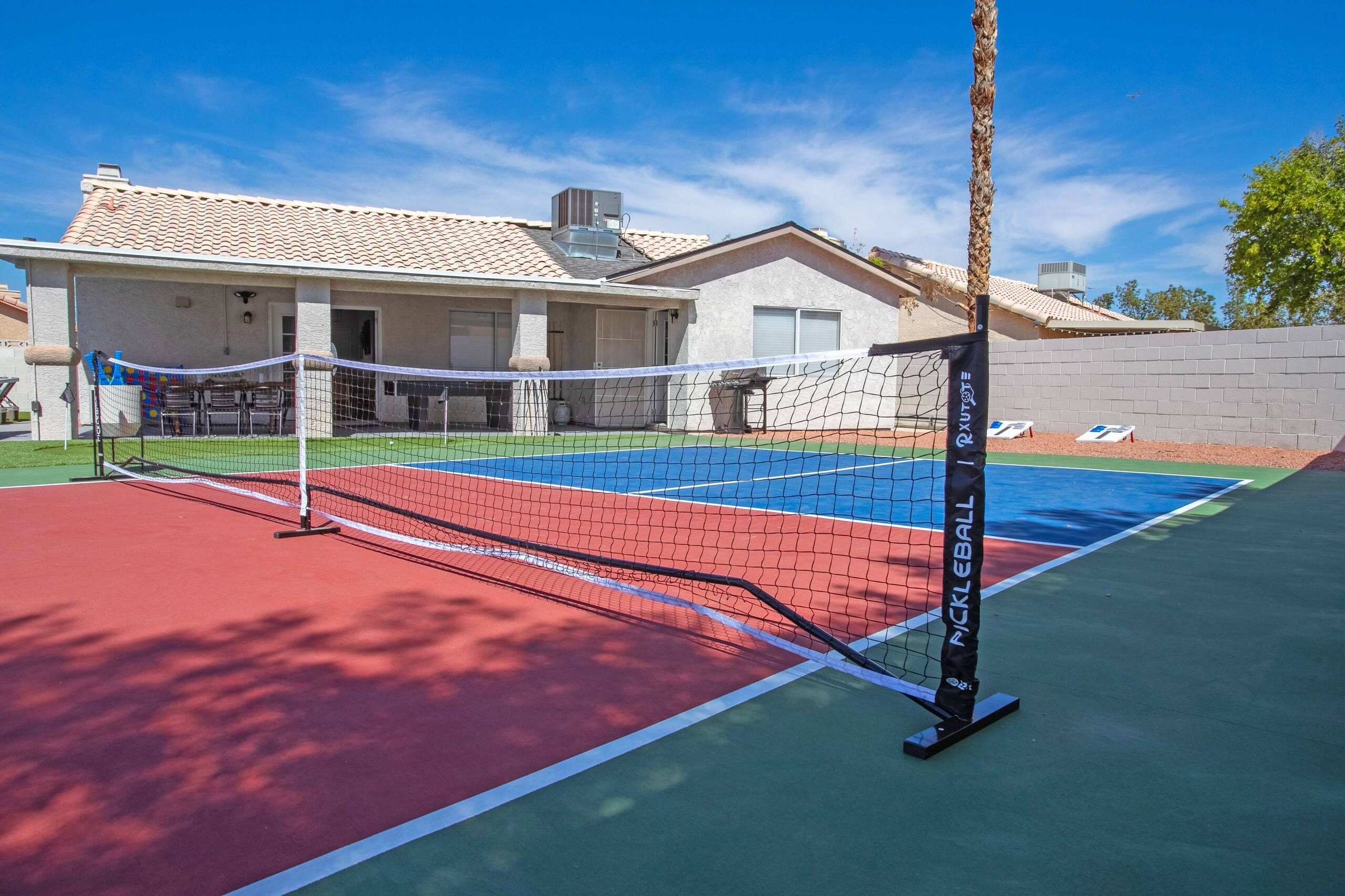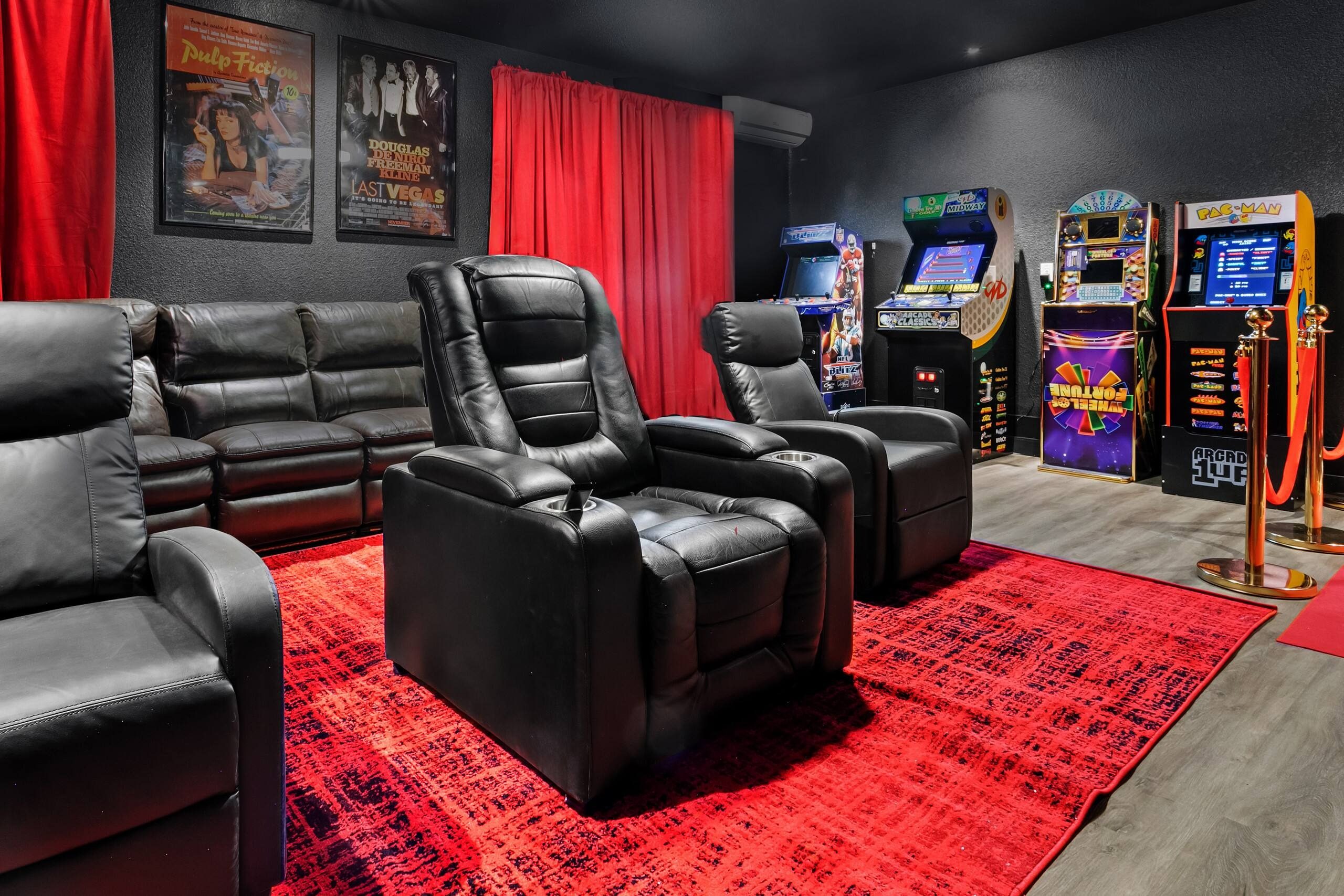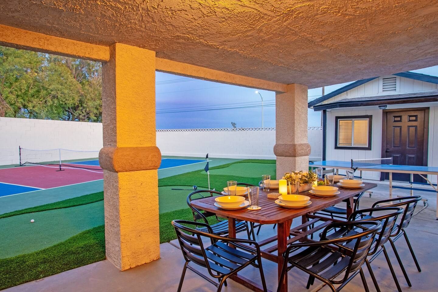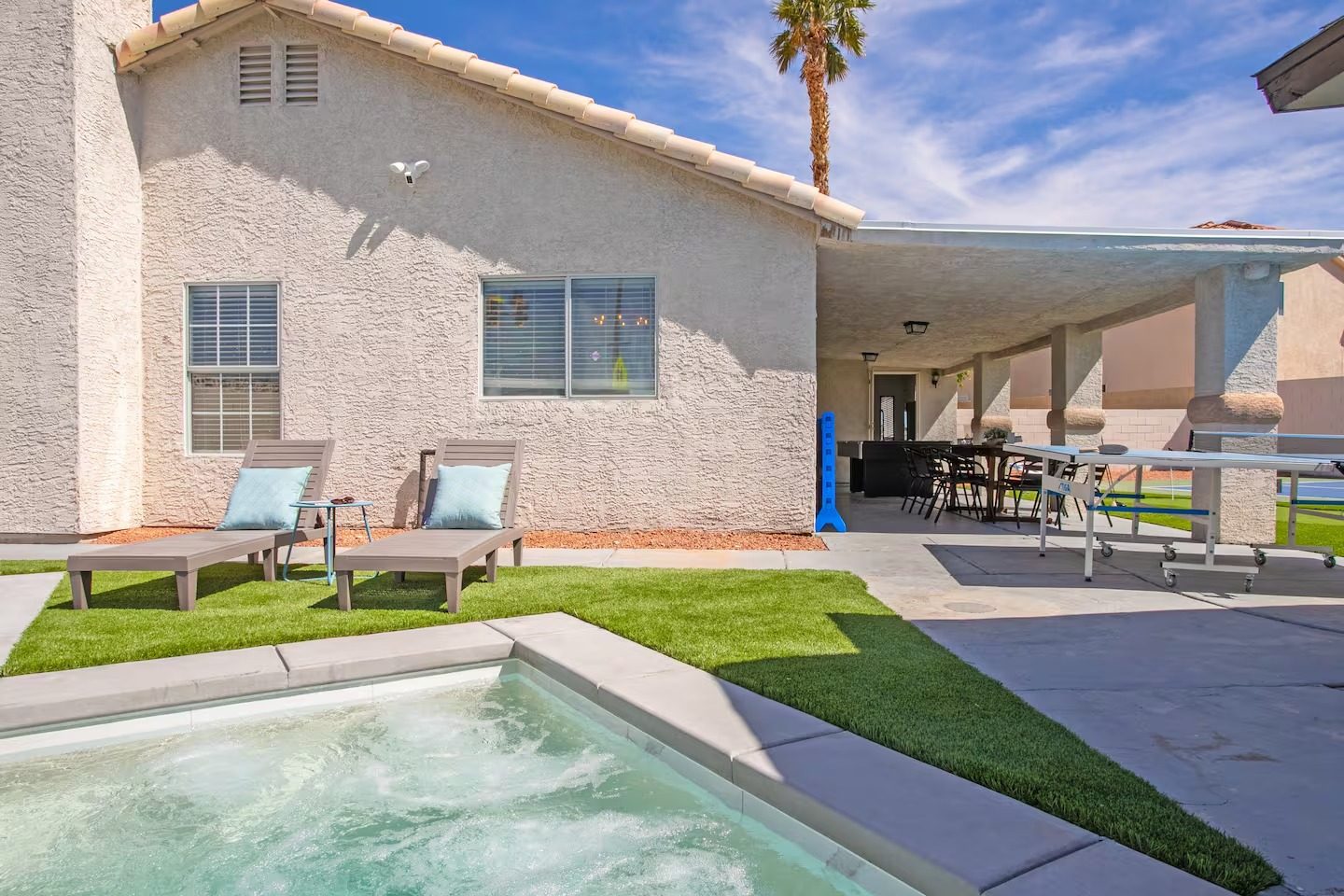 Villa Palmora House is an expansive and fun-filled vacation retreat designed to deliver both relaxation and entertainment for families or groups of up to 14 guests. This beautifully appointed six-bedroom villa blends generous indoor living spaces with exciting recreational features that make it much more than just a place to sleep. Inside, you’ll find a fully equipped kitchen, comfortable communal areas, and thoughtful amenities that cater to large groups, including a dedicated movie room for cozy nights in and game-friendly spaces like a pickleball court, arcade machines, pool table, ping pong and other backyard games that keep everyone entertained. Step outside to your private outdoor oasis — where a sparkling pool and spa offer the perfect setting for soaking up the Nevada sun by day or unwinding under the stars at night. Each bedroom provides a comfortable resting spot after a day of adventure, whether you’re exploring the Las Vegas Strip’s world-class dining and entertainment or enjoying local attractions closer to home. Located in a quiet North Las Vegas neighborhood just a short drive from the Strip and other major points of interest, Villa Palmora House combines convenience with comfort, making it an ideal choice for celebratory trips, golf vacations, family reunions, or any group getaway where memorable moments and shared experiences matter.