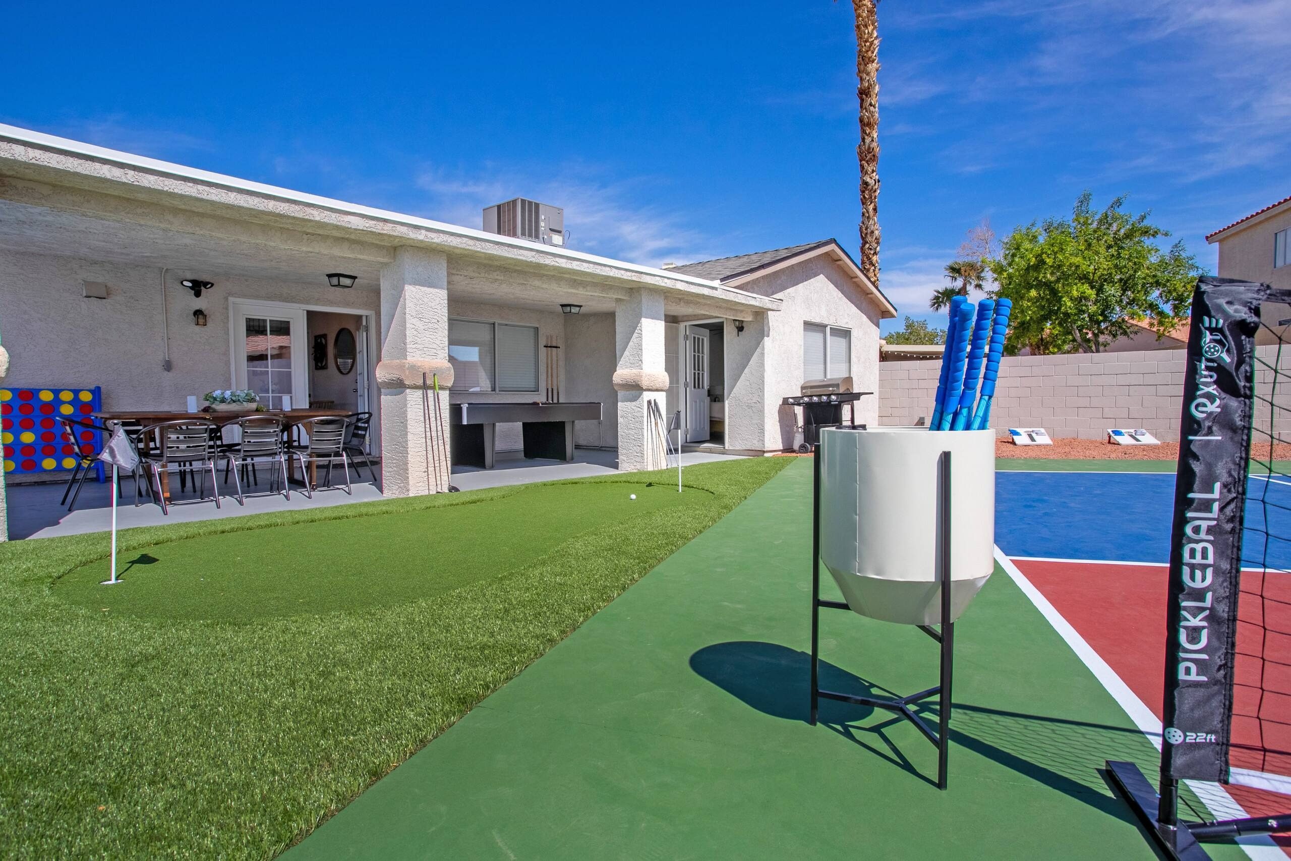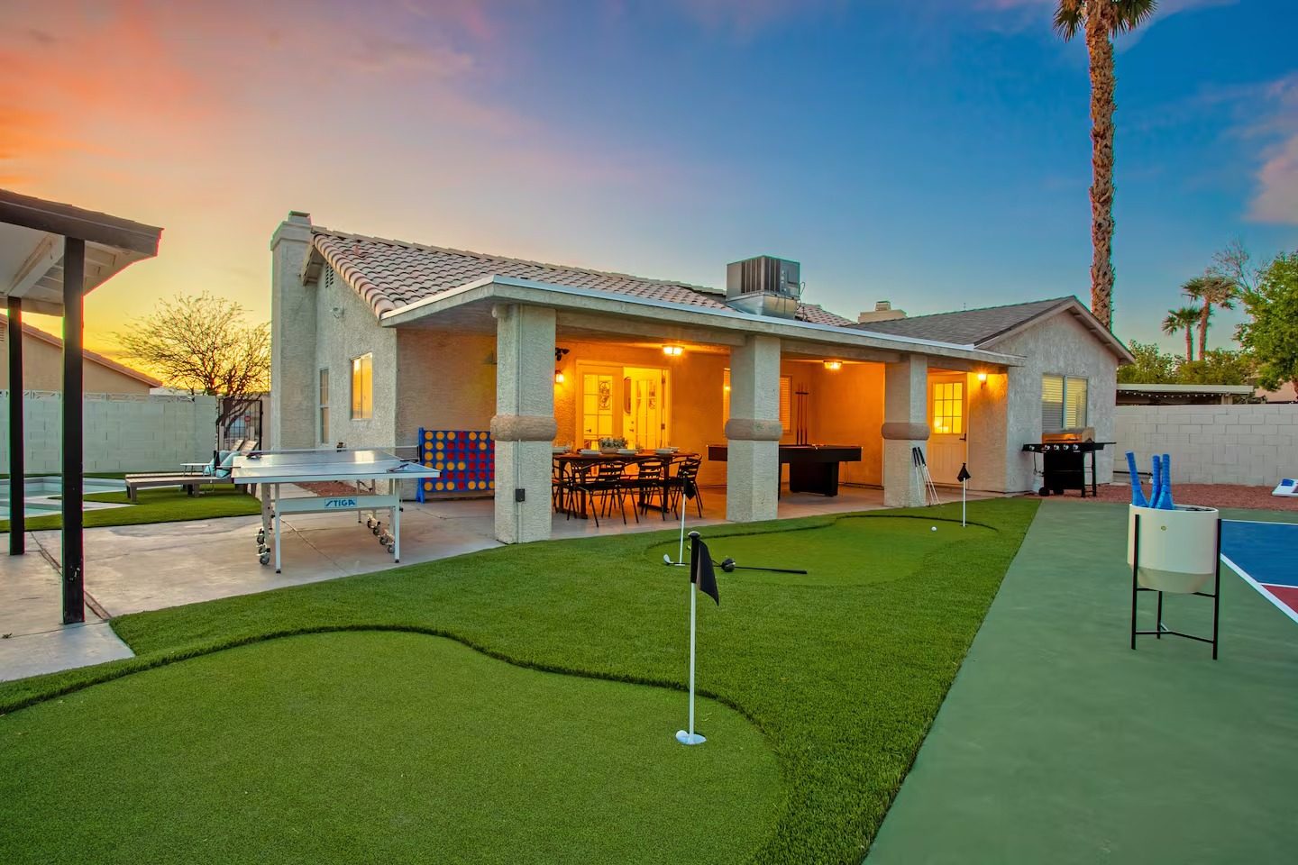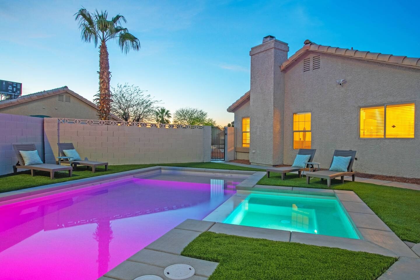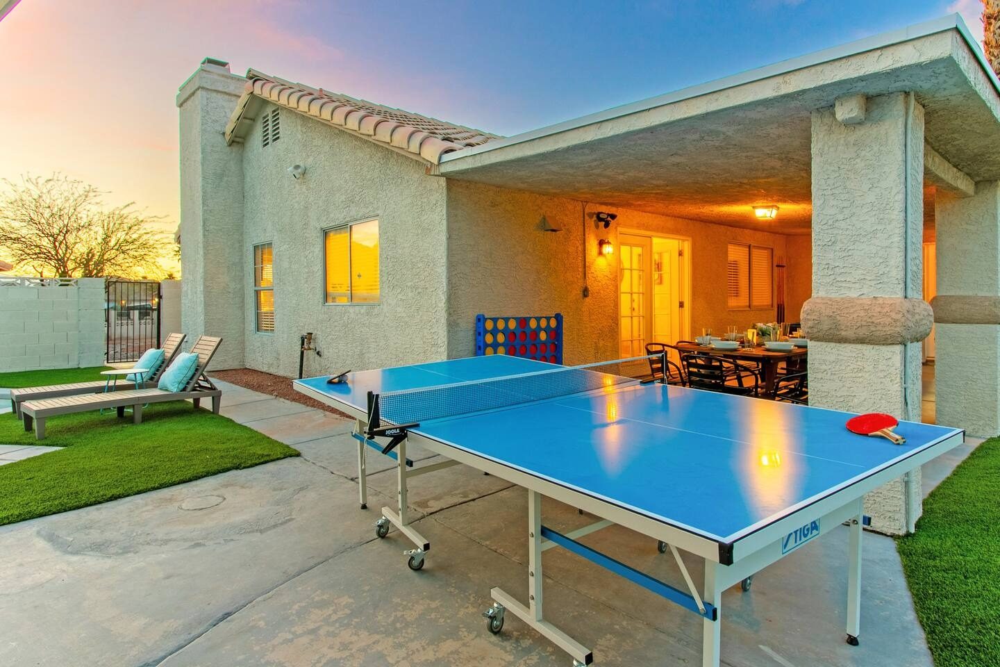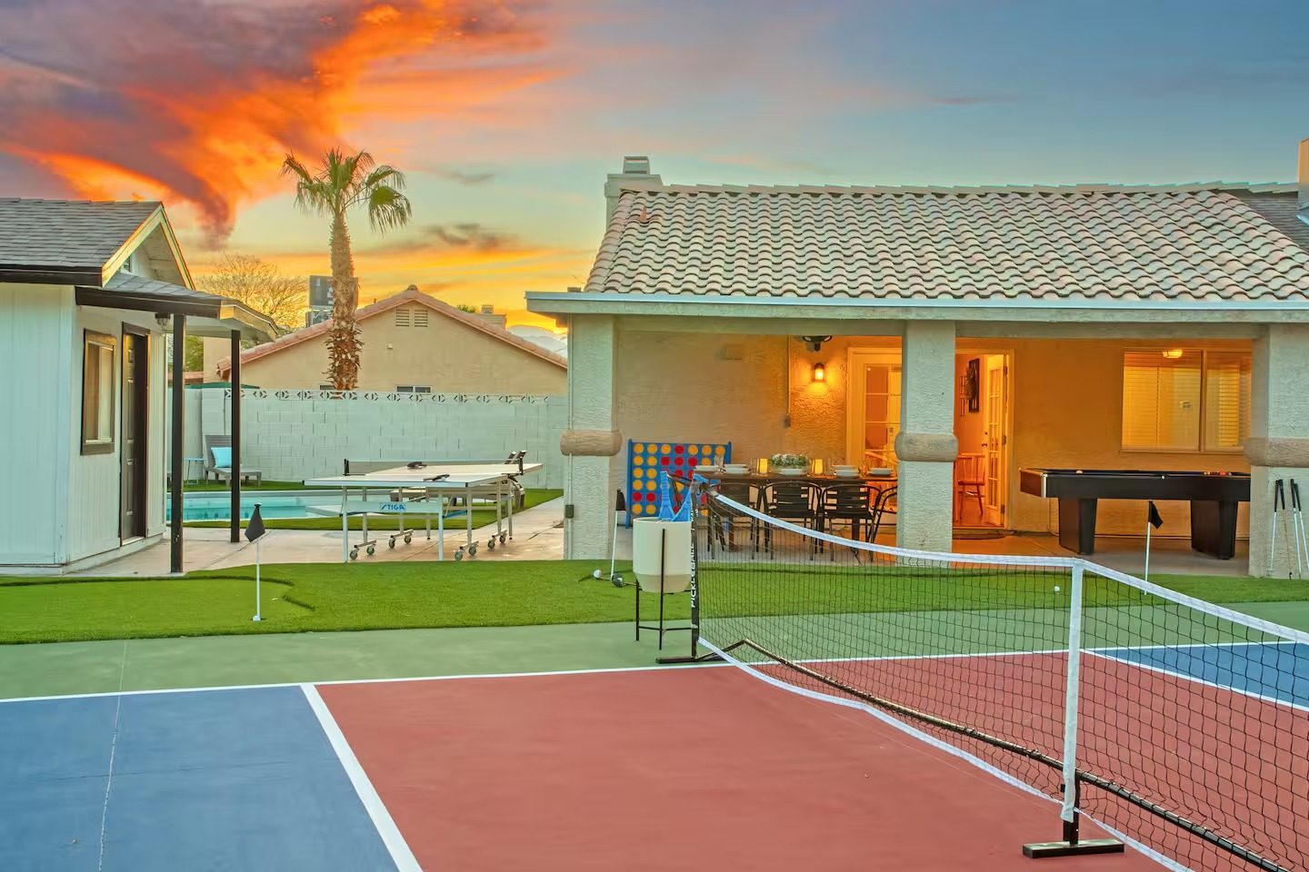 Villa Palmora House is an expansive and fun-filled vacation retreat designed to deliver both relaxation and entertainment for families or groups of up to 14 guests. This beautifully appointed six-bedroom villa blends generous indoor living spaces with exciting recreational features that make it much more than just a place to sleep. Inside, you’ll find a fully equipped kitchen, comfortable communal areas, and thoughtful amenities that cater to large groups, including a dedicated movie room for cozy nights in and game-friendly spaces like a pickleball court, arcade machines, pool table, ping pong and other backyard games that keep everyone entertained. Step outside to your private outdoor oasis — where a sparkling pool and spa offer the perfect setting for soaking up the Nevada sun by day or unwinding under the stars at night. Each bedroom provides a comfortable resting spot after a day of adventure, whether you’re exploring the Las Vegas Strip’s world-class dining and entertainment or enjoying local attractions closer to home. Located in a quiet North Las Vegas neighborhood just a short drive from the Strip and other major points of interest, Villa Palmora House combines convenience with comfort, making it an ideal choice for celebratory trips, golf vacations, family reunions, or any group getaway where memorable moments and shared experiences matter.