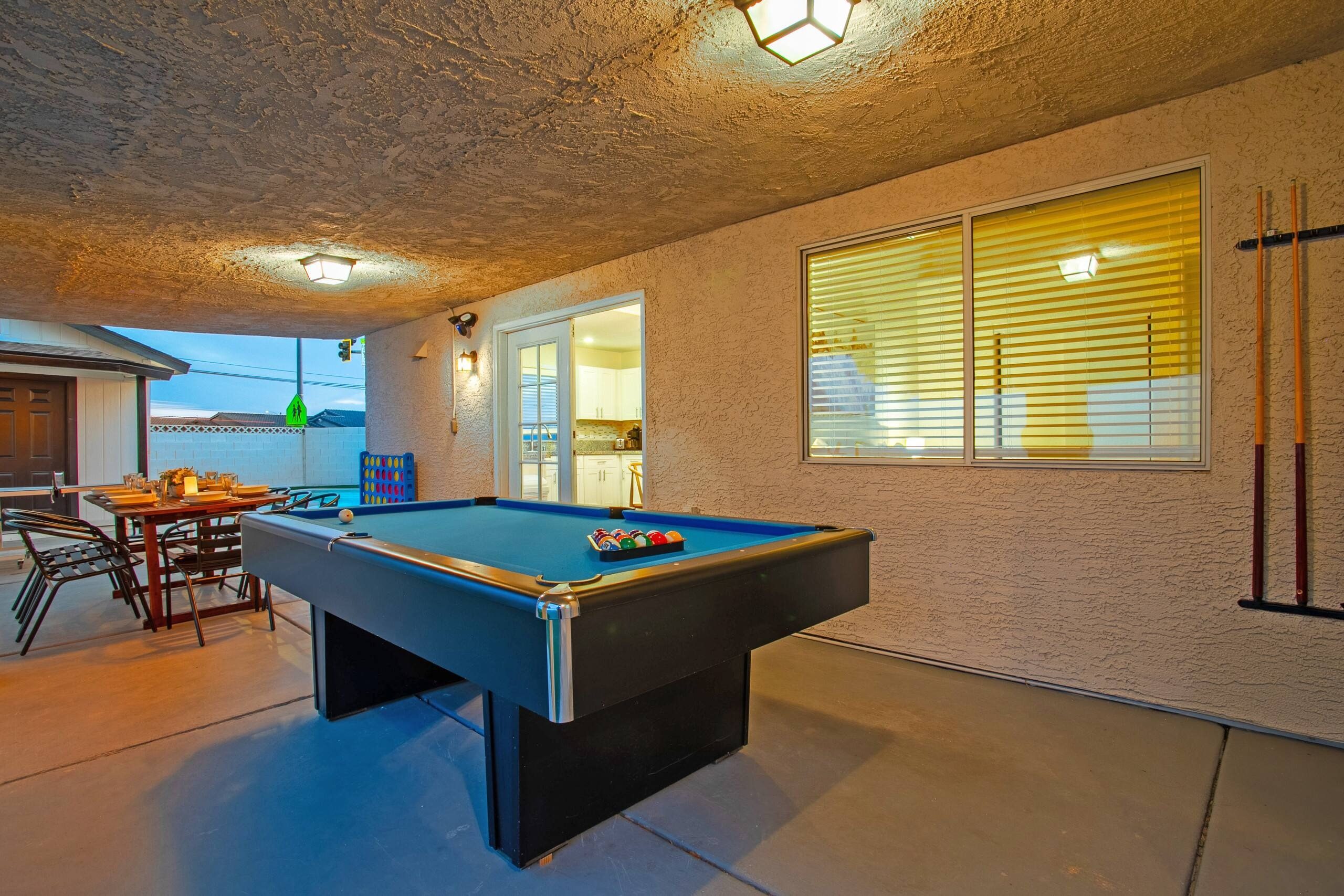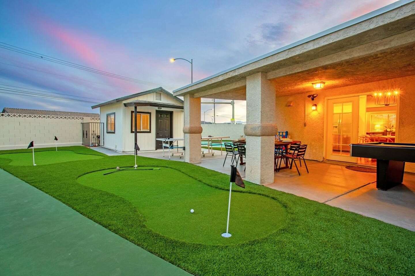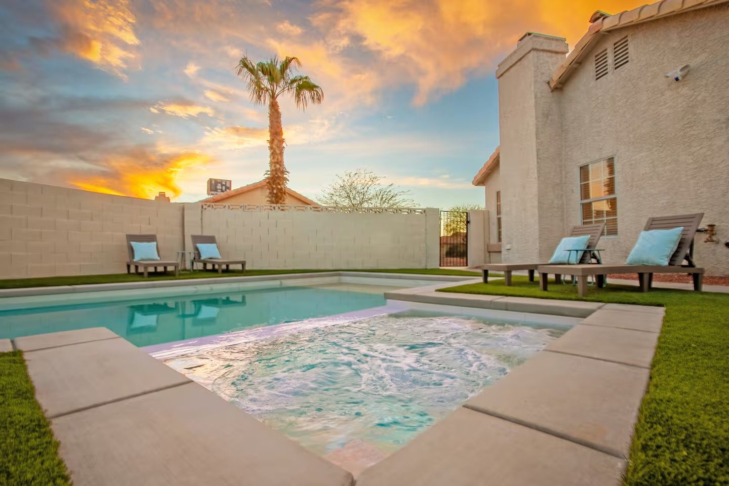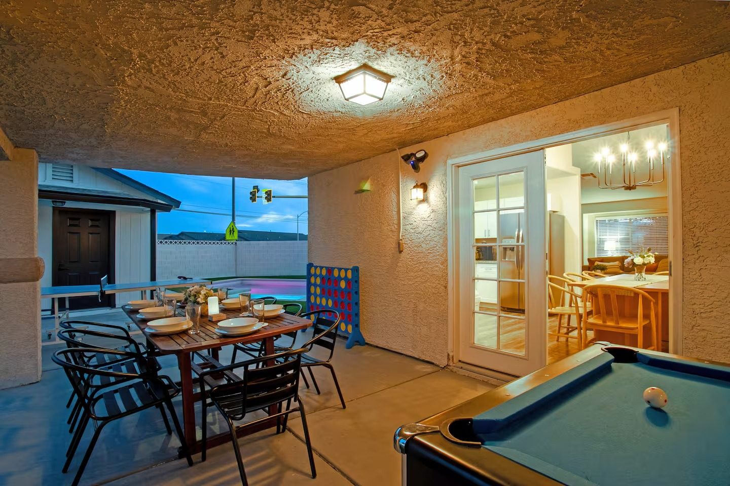 Villa Palmora House is an expansive and fun-filled vacation retreat designed to deliver both relaxation and entertainment for families or groups of up to 14 guests. This beautifully appointed six-bedroom villa blends generous indoor living spaces with exciting recreational features that make it much more than just a place to sleep. Inside, you’ll find a fully equipped kitchen, comfortable communal areas, and thoughtful amenities that cater to large groups, including a dedicated movie room for cozy nights in and game-friendly spaces like a pickleball court, arcade machines, pool table, ping pong and other backyard games that keep everyone entertained. Step outside to your private outdoor oasis — where a sparkling pool and spa offer the perfect setting for soaking up the Nevada sun by day or unwinding under the stars at night. Each bedroom provides a comfortable resting spot after a day of adventure, whether you’re exploring the Las Vegas Strip’s world-class dining and entertainment or enjoying local attractions closer to home. Located in a quiet North Las Vegas neighborhood just a short drive from the Strip and other major points of interest, Villa Palmora House combines convenience with comfort, making it an ideal choice for celebratory trips, golf vacations, family reunions, or any group getaway where memorable moments and shared experiences matter.