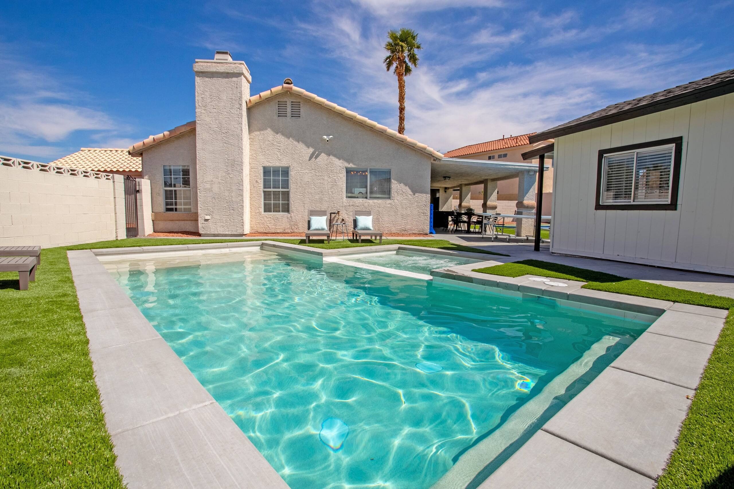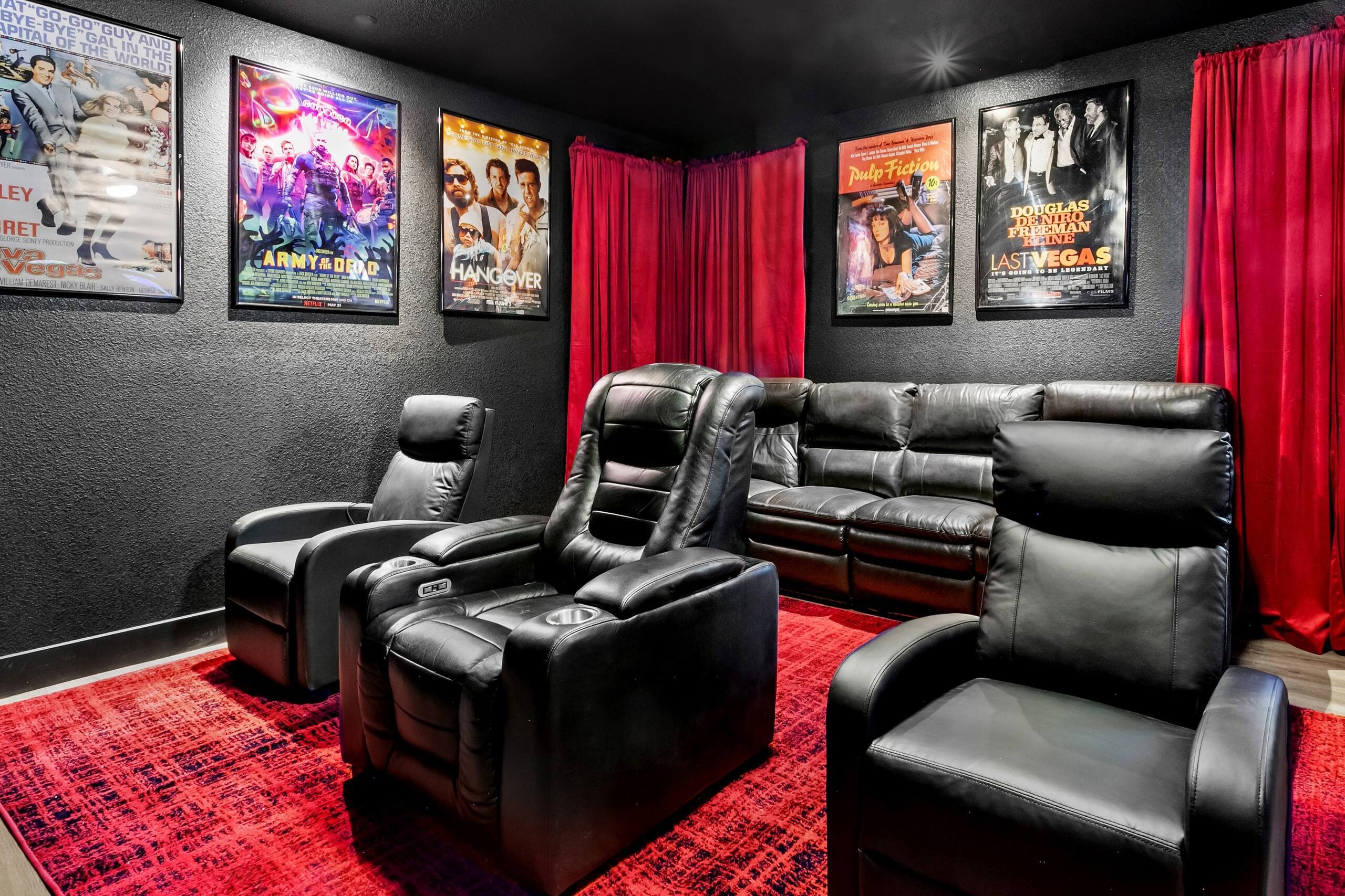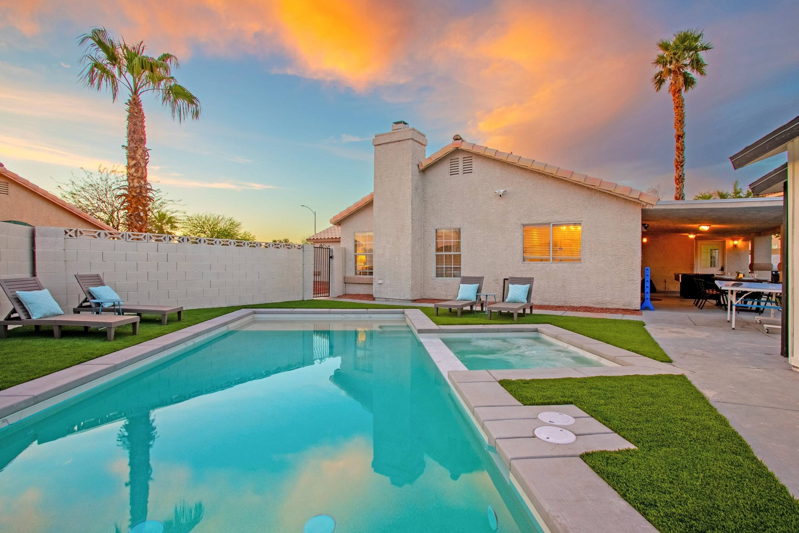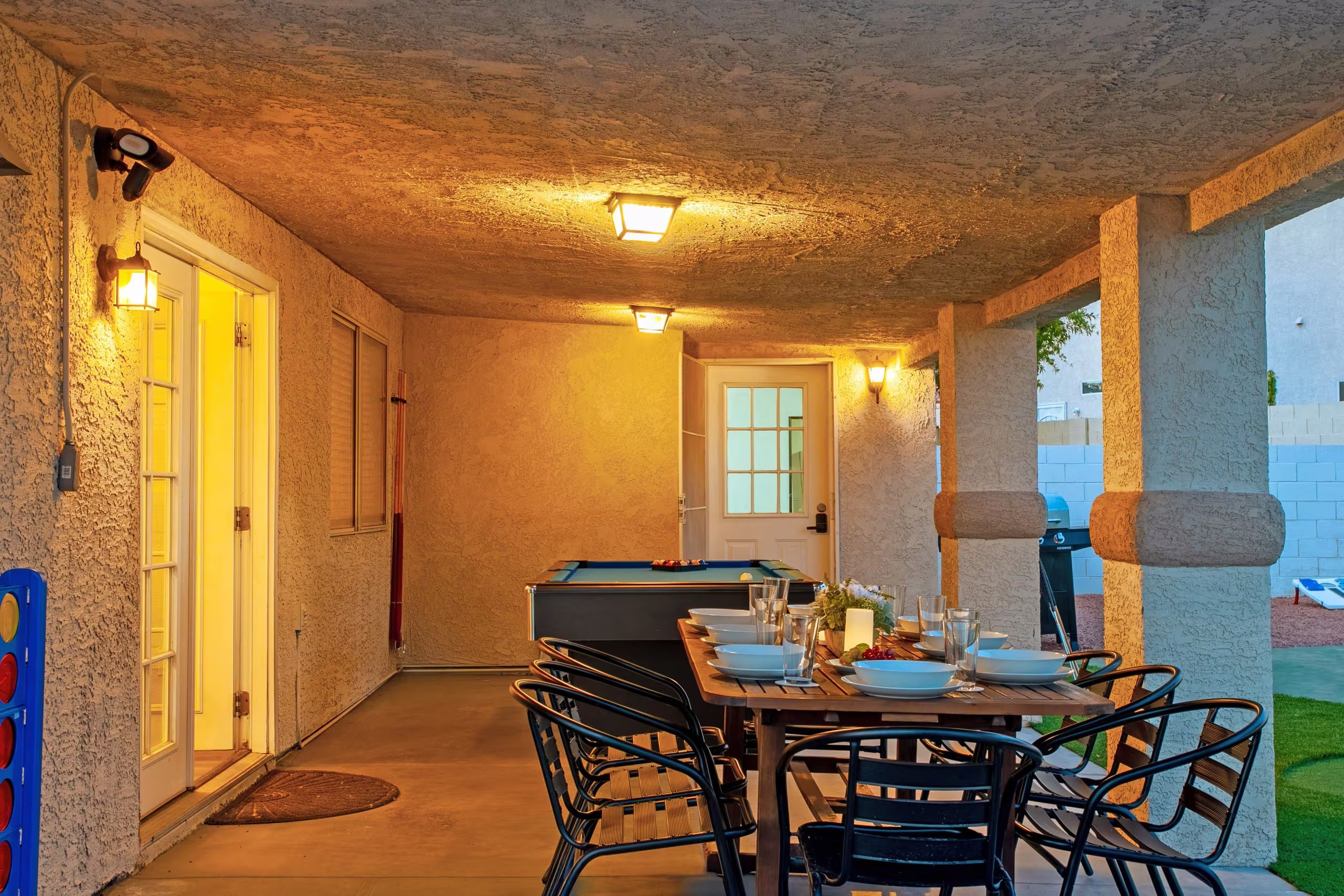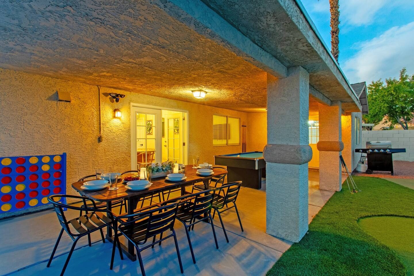 Villa Palmora House is an expansive and fun-filled vacation retreat designed to deliver both relaxation and entertainment for families or groups of up to 14 guests. This beautifully appointed six-bedroom villa blends generous indoor living spaces with exciting recreational features that make it much more than just a place to sleep. Inside, you’ll find a fully equipped kitchen, comfortable communal areas, and thoughtful amenities that cater to large groups, including a dedicated movie room for cozy nights in and game-friendly spaces like a pickleball court, arcade machines, pool table, ping pong and other backyard games that keep everyone entertained. Step outside to your private outdoor oasis — where a sparkling pool and spa offer the perfect setting for soaking up the Nevada sun by day or unwinding under the stars at night. Each bedroom provides a comfortable resting spot after a day of adventure, whether you’re exploring the Las Vegas Strip’s world-class dining and entertainment or enjoying local attractions closer to home. Located in a quiet North Las Vegas neighborhood just a short drive from the Strip and other major points of interest, Villa Palmora House combines convenience with comfort, making it an ideal choice for celebratory trips, golf vacations, family reunions, or any group getaway where memorable moments and shared experiences matter.