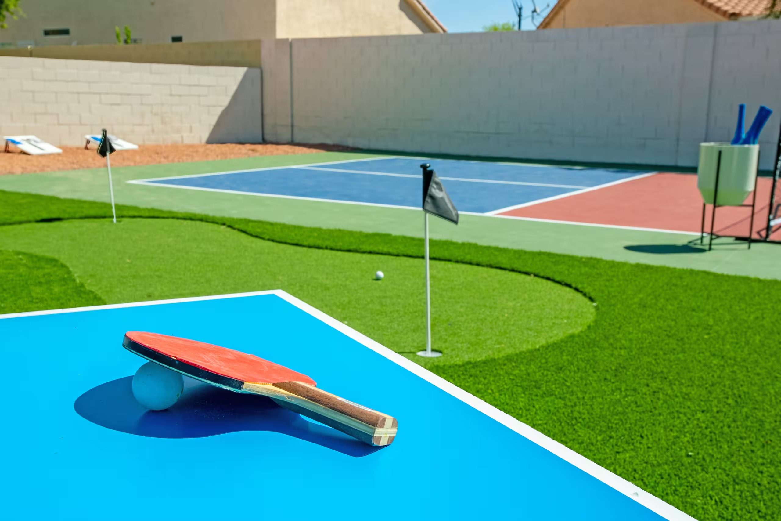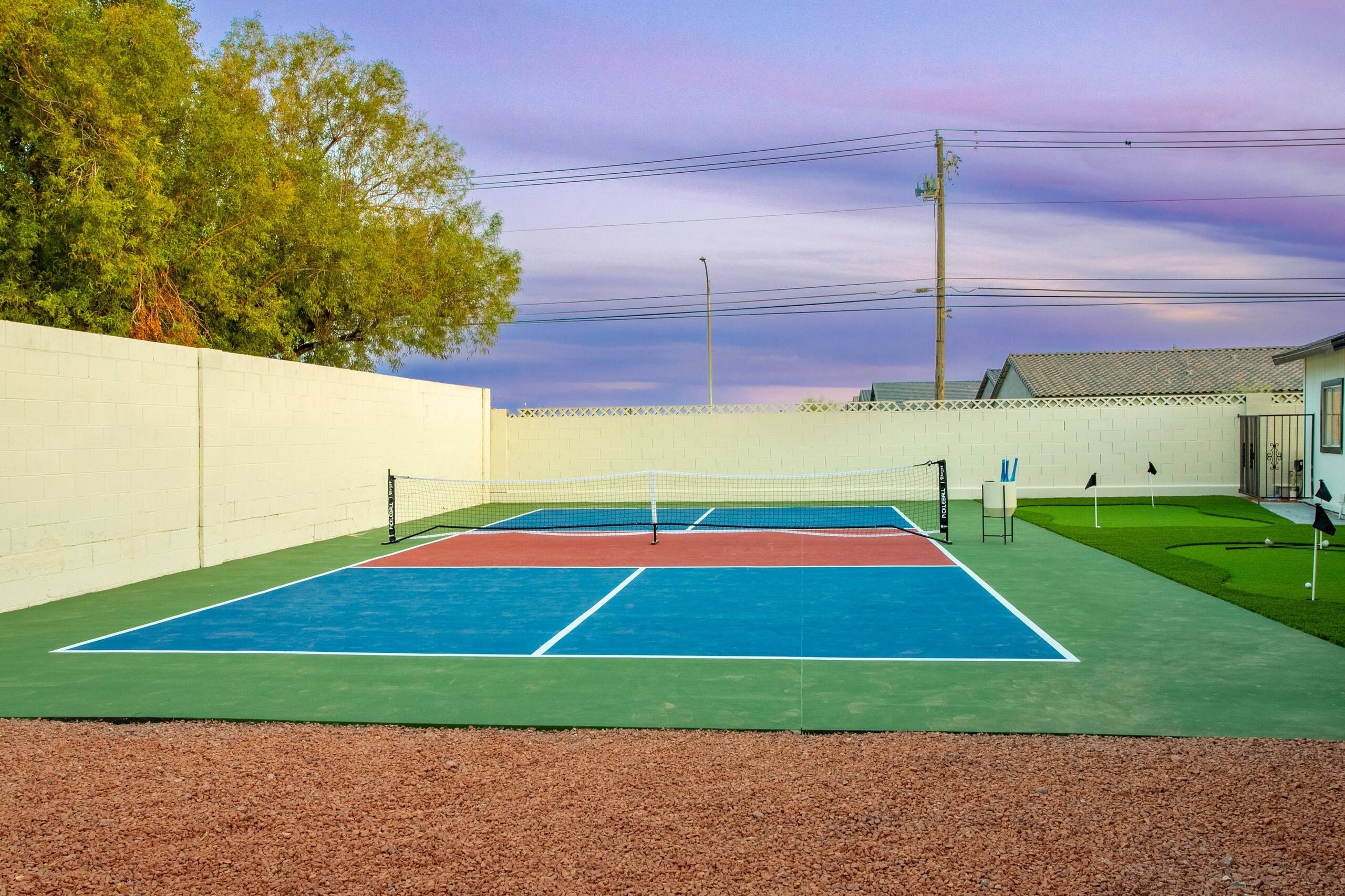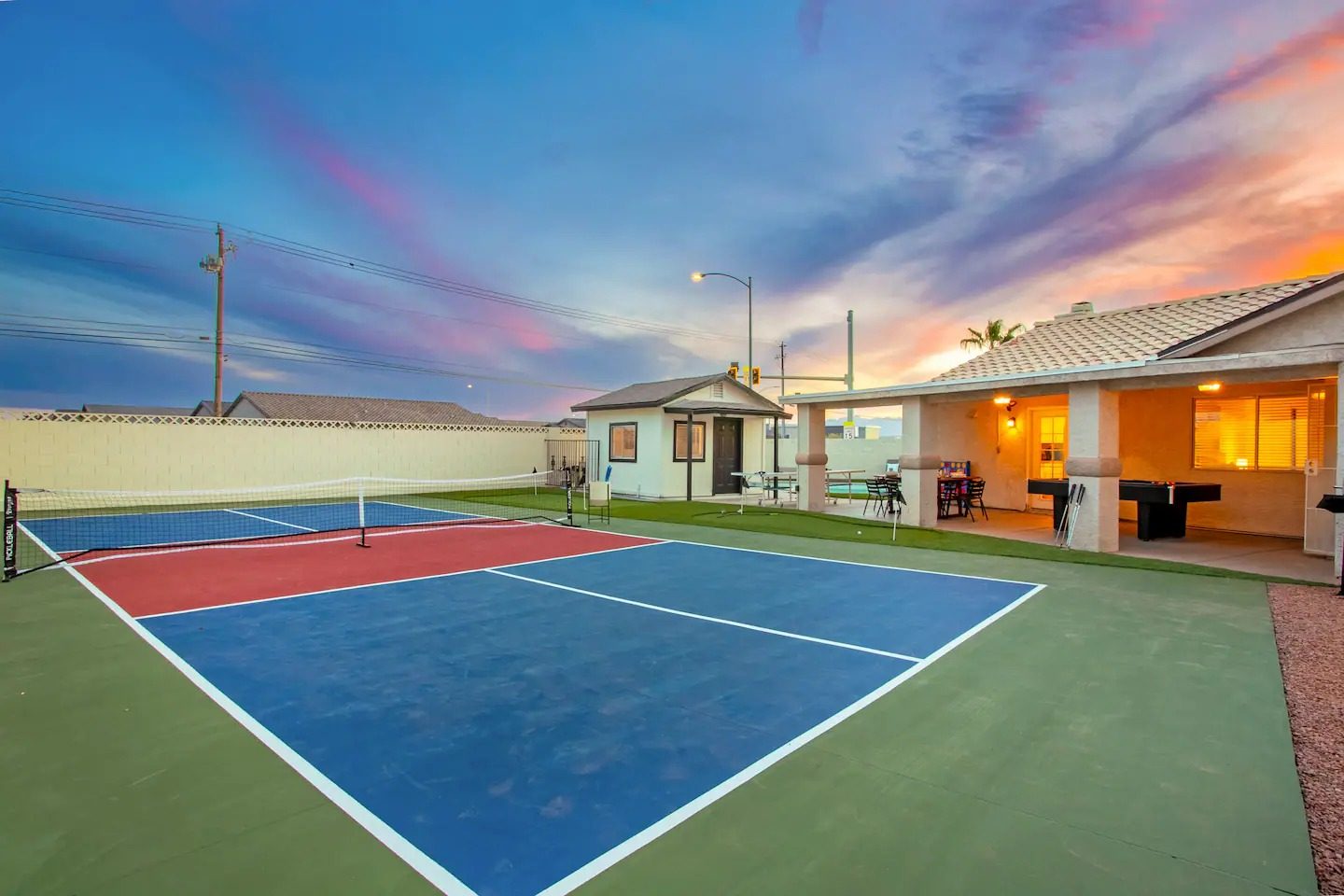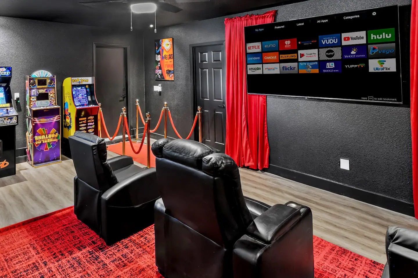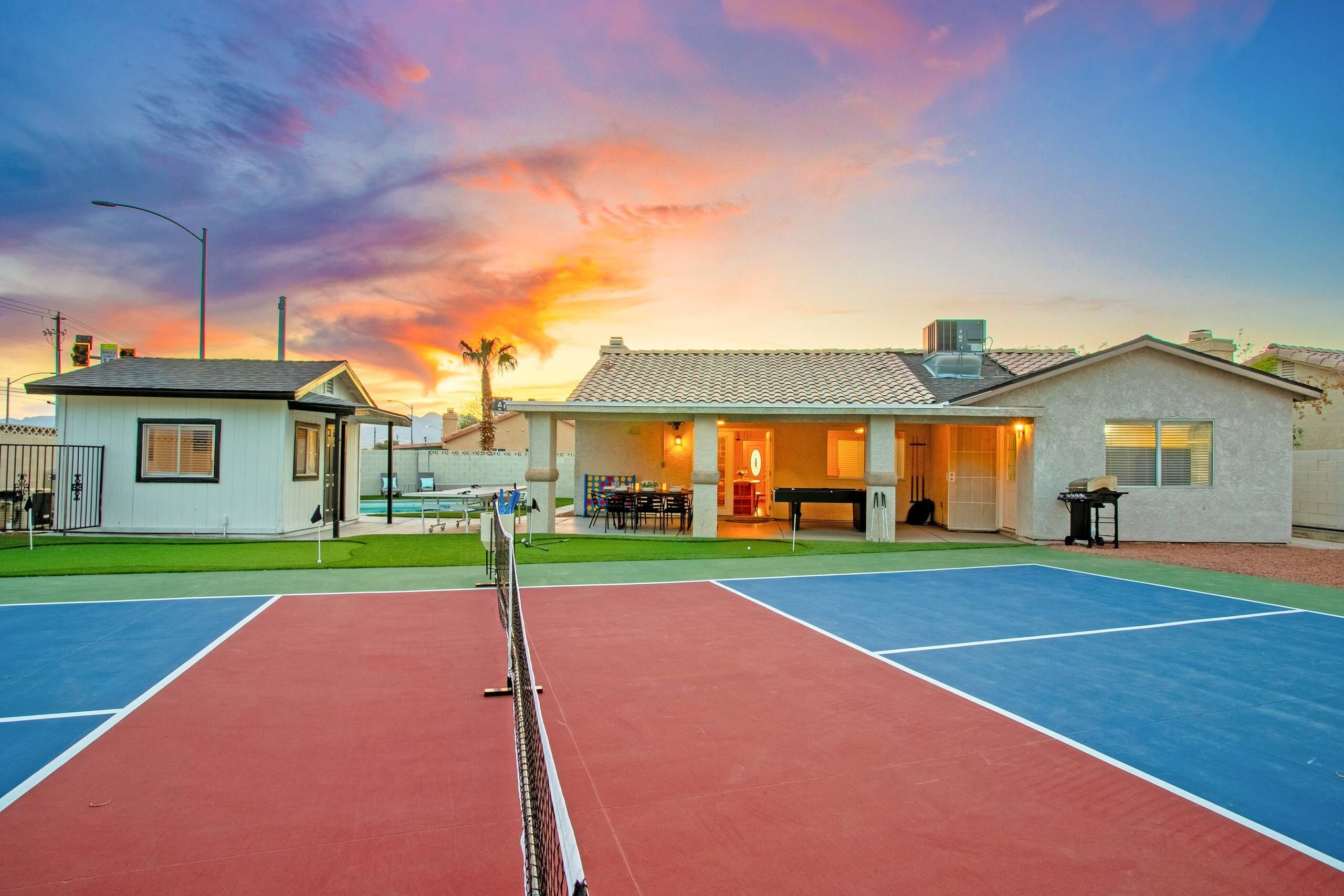 Villa Palmora House is an expansive and fun-filled vacation retreat designed to deliver both relaxation and entertainment for families or groups of up to 14 guests. This beautifully appointed six-bedroom villa blends generous indoor living spaces with exciting recreational features that make it much more than just a place to sleep. Inside, you’ll find a fully equipped kitchen, comfortable communal areas, and thoughtful amenities that cater to large groups, including a dedicated movie room for cozy nights in and game-friendly spaces like a pickleball court, arcade machines, pool table, ping pong and other backyard games that keep everyone entertained. Step outside to your private outdoor oasis — where a sparkling pool and spa offer the perfect setting for soaking up the Nevada sun by day or unwinding under the stars at night. Each bedroom provides a comfortable resting spot after a day of adventure, whether you’re exploring the Las Vegas Strip’s world-class dining and entertainment or enjoying local attractions closer to home. Located in a quiet North Las Vegas neighborhood just a short drive from the Strip and other major points of interest, Villa Palmora House combines convenience with comfort, making it an ideal choice for celebratory trips, golf vacations, family reunions, or any group getaway where memorable moments and shared experiences matter.