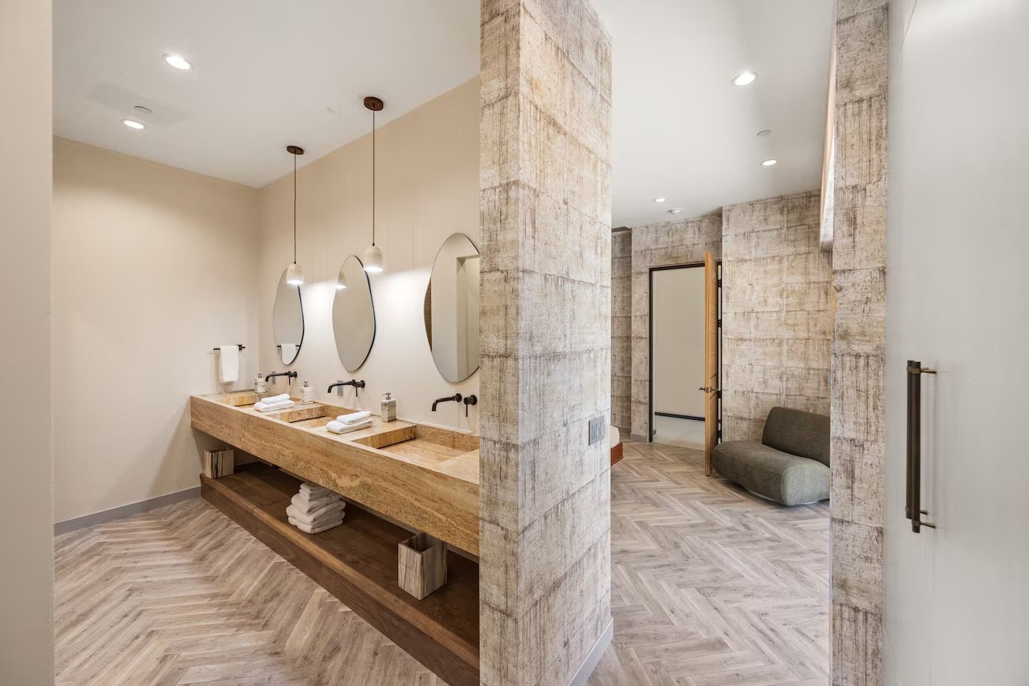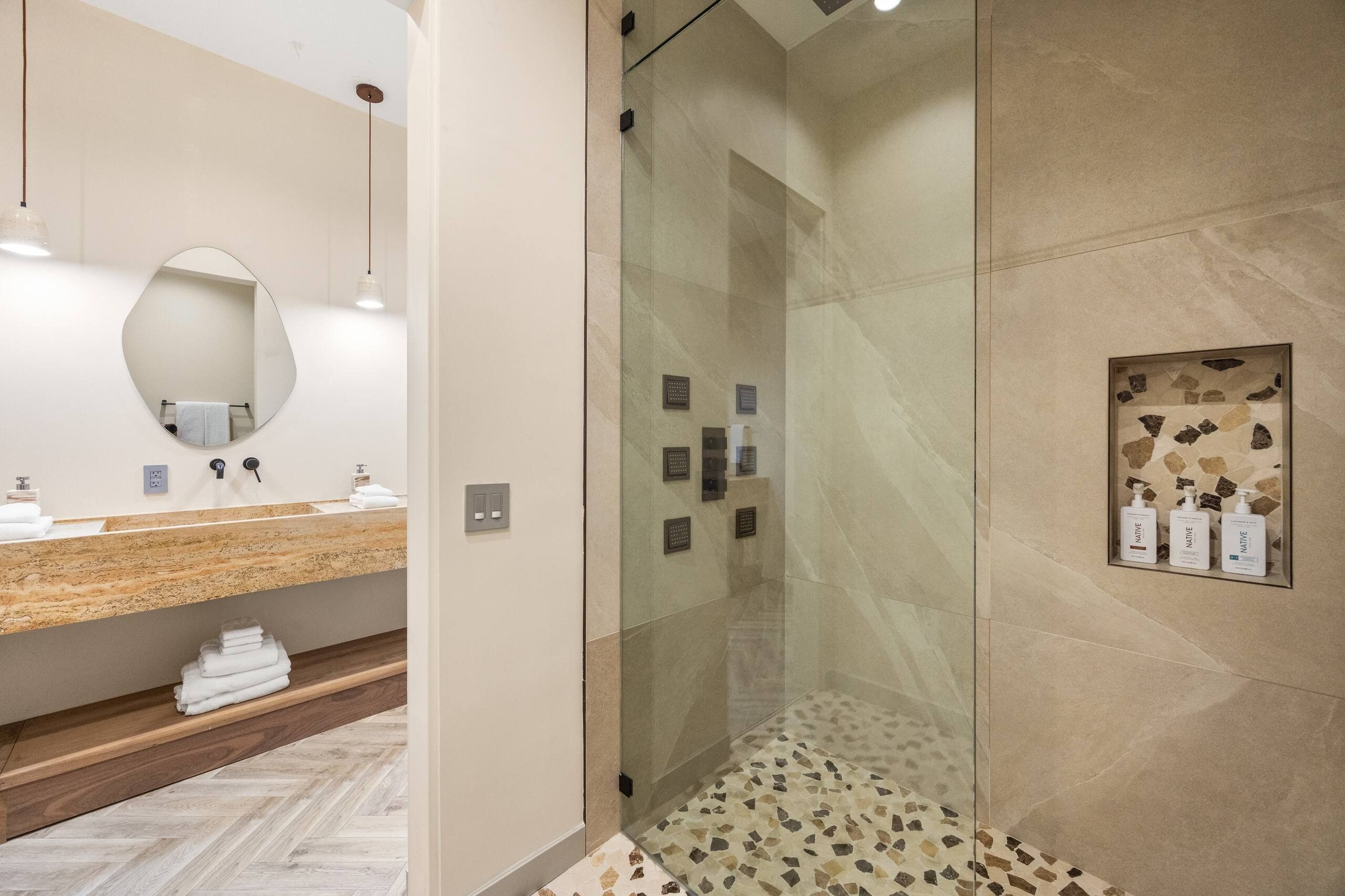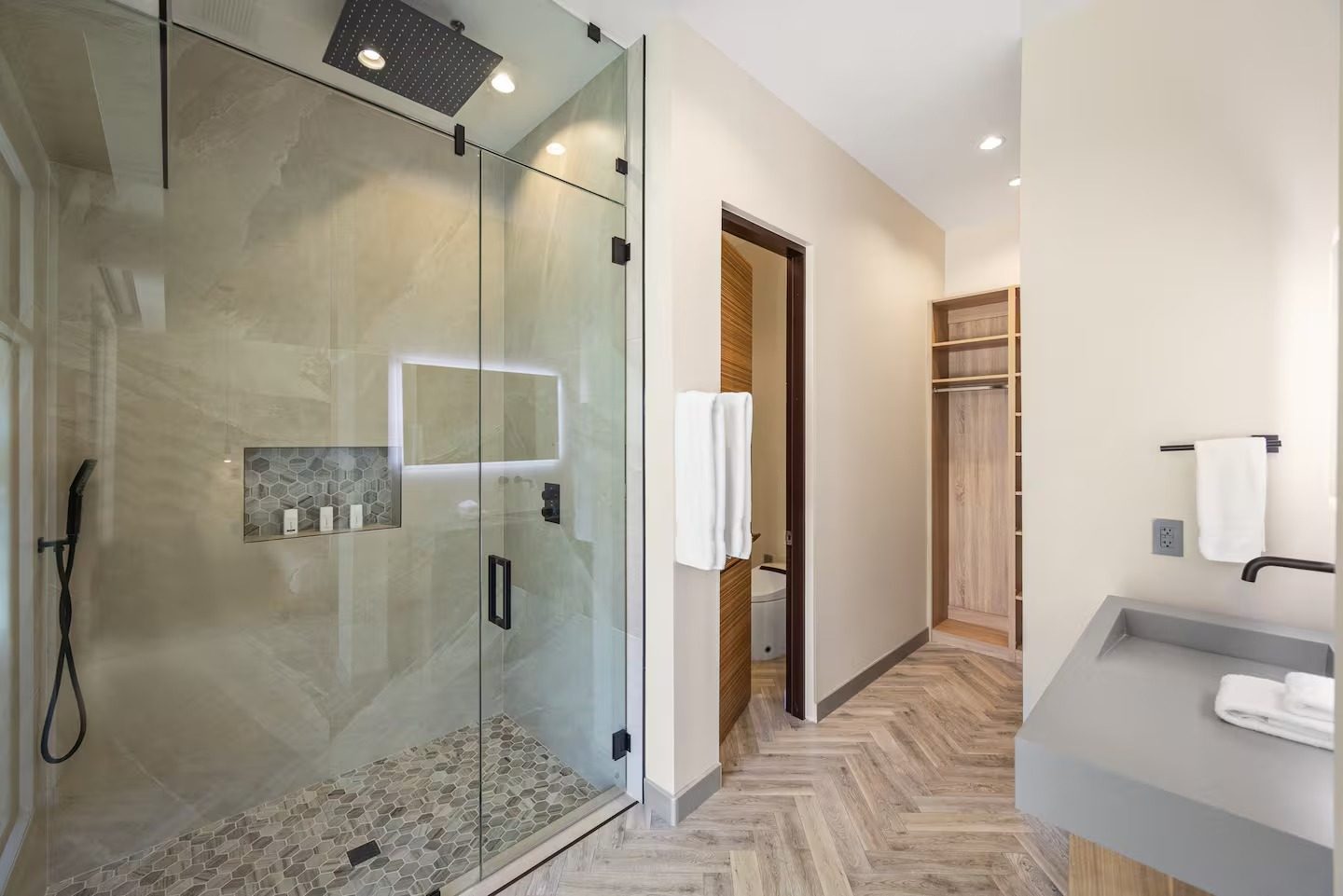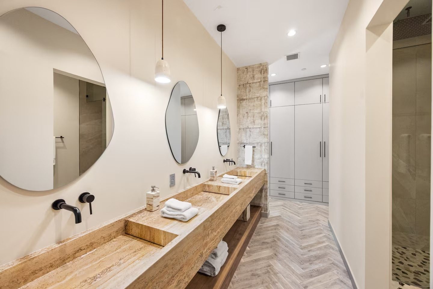 Six modern bathrooms featuring updated vanities, walk-in showers, and clean, minimalist finishes.