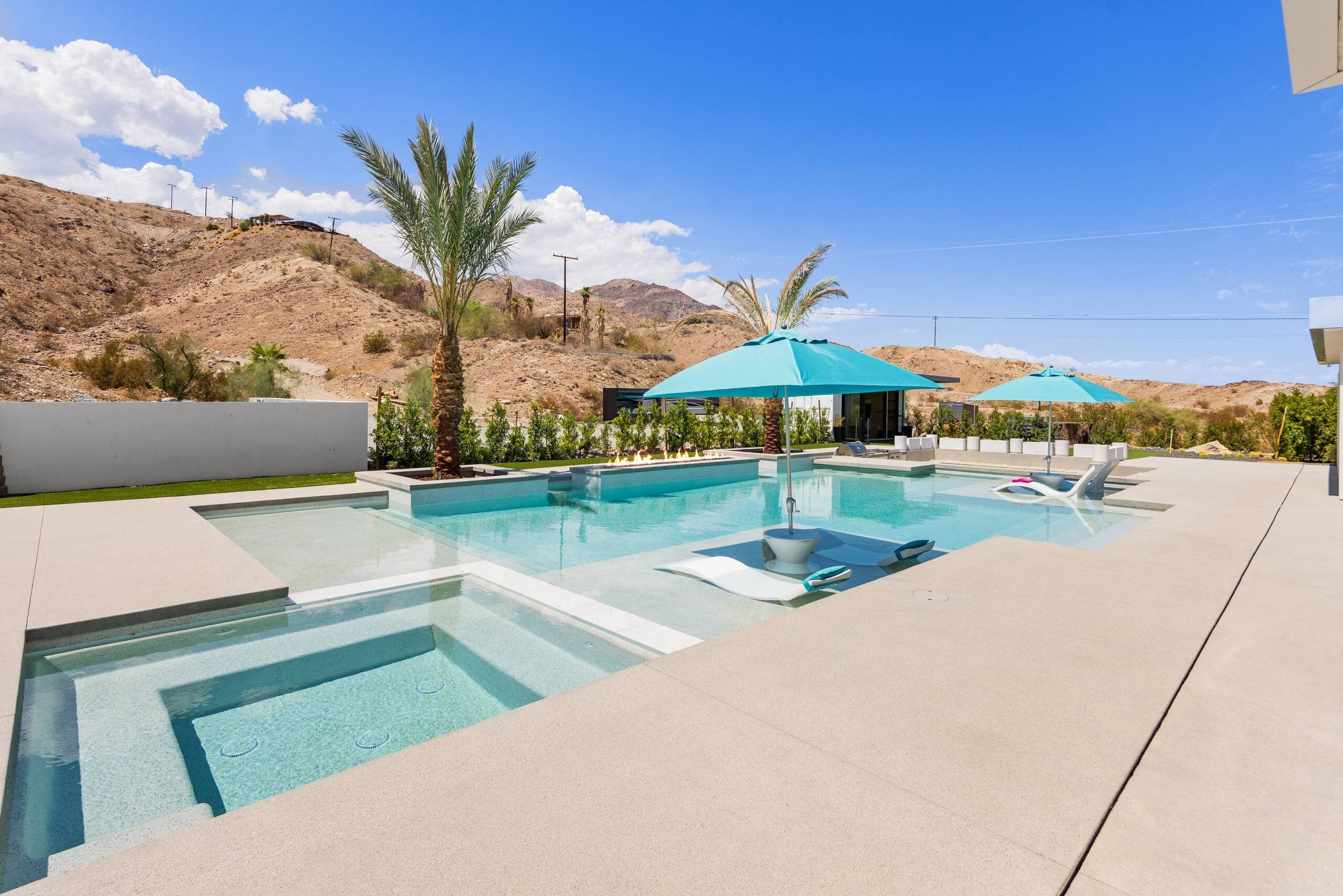 Private swimming pool surrounded by palm trees, sun loungers, and lounge areas engineered for relaxation and entertainment.