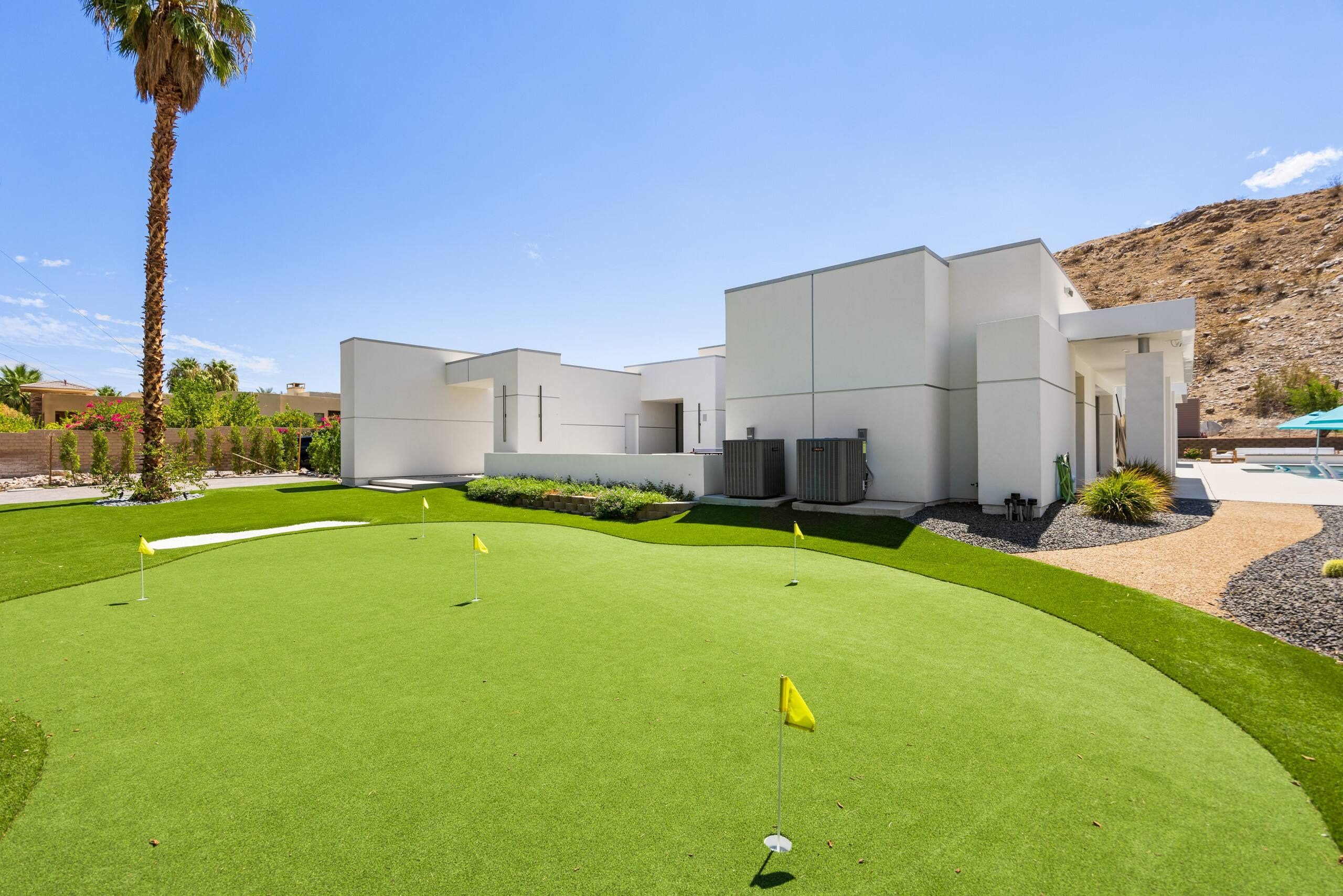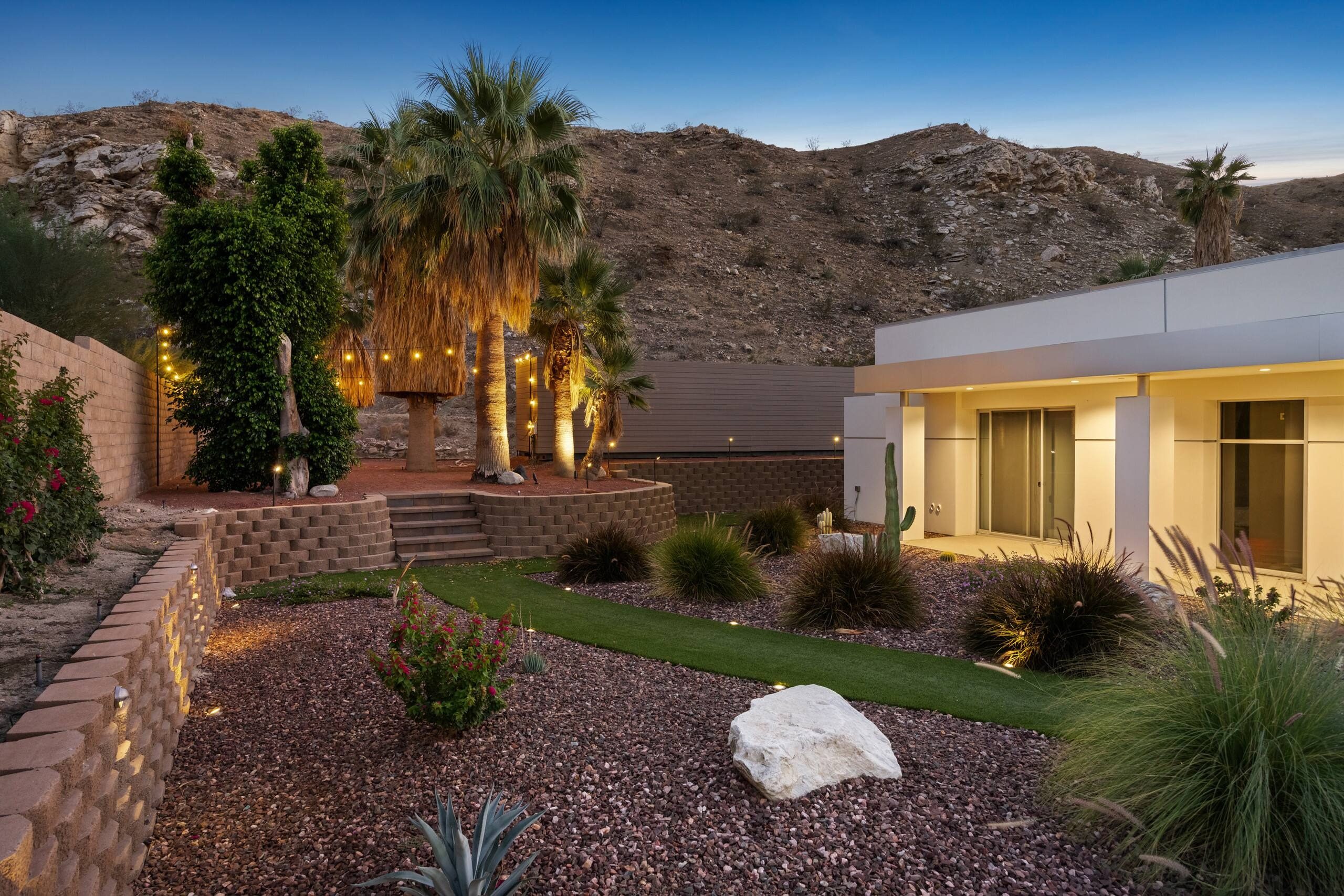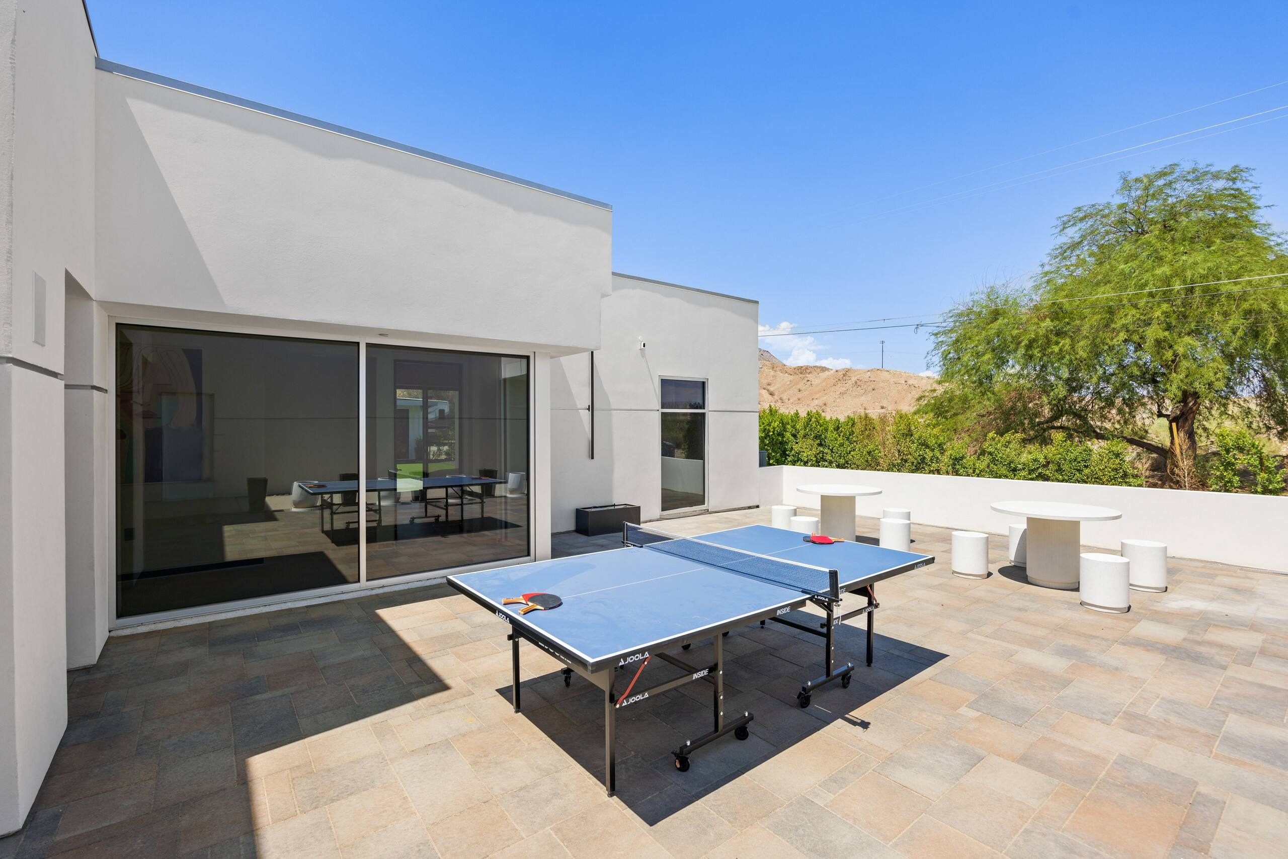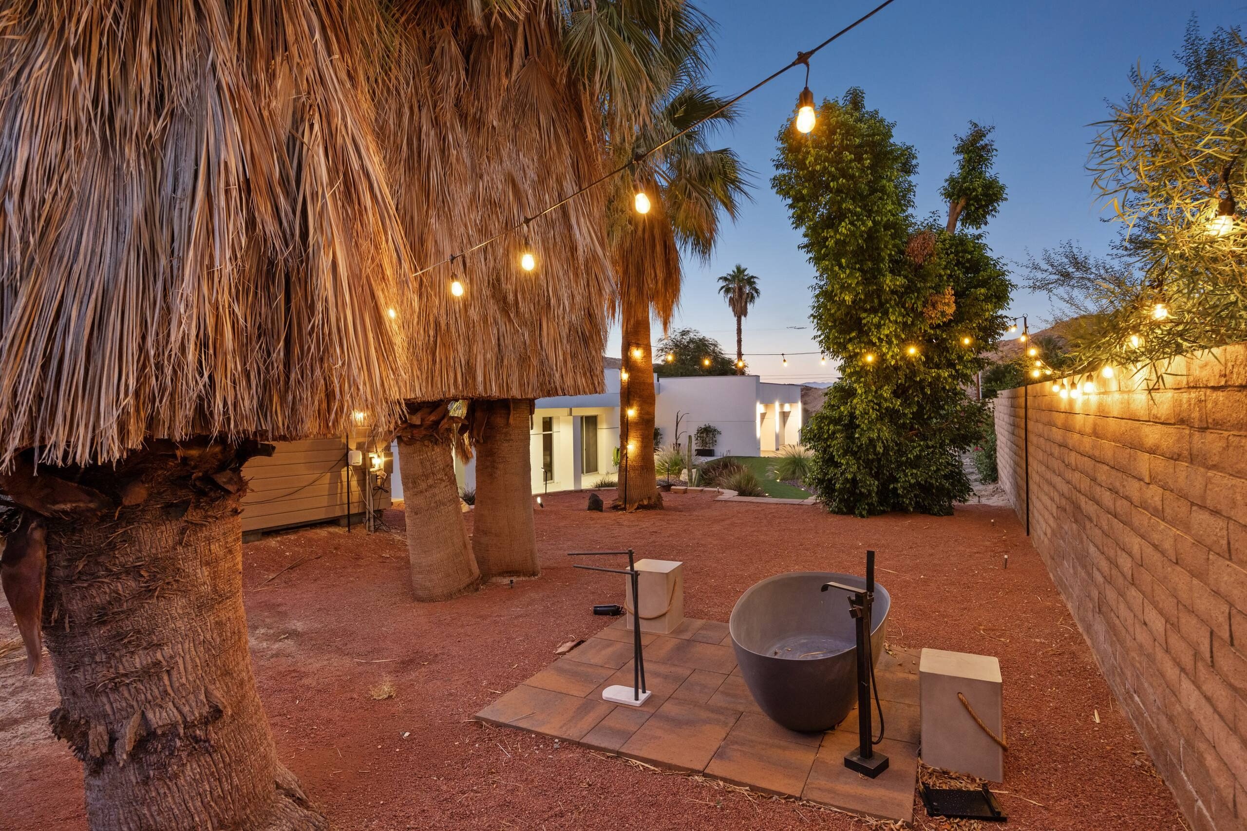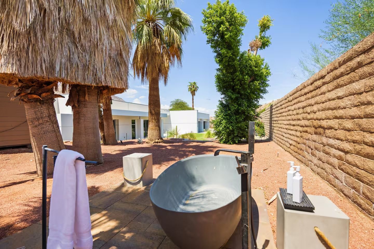 Outdoor gathering zones including shaded seating, dining areas, and recreational spaces ideal for daytime leisure or evening conversations under the desert sky.