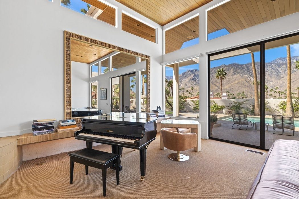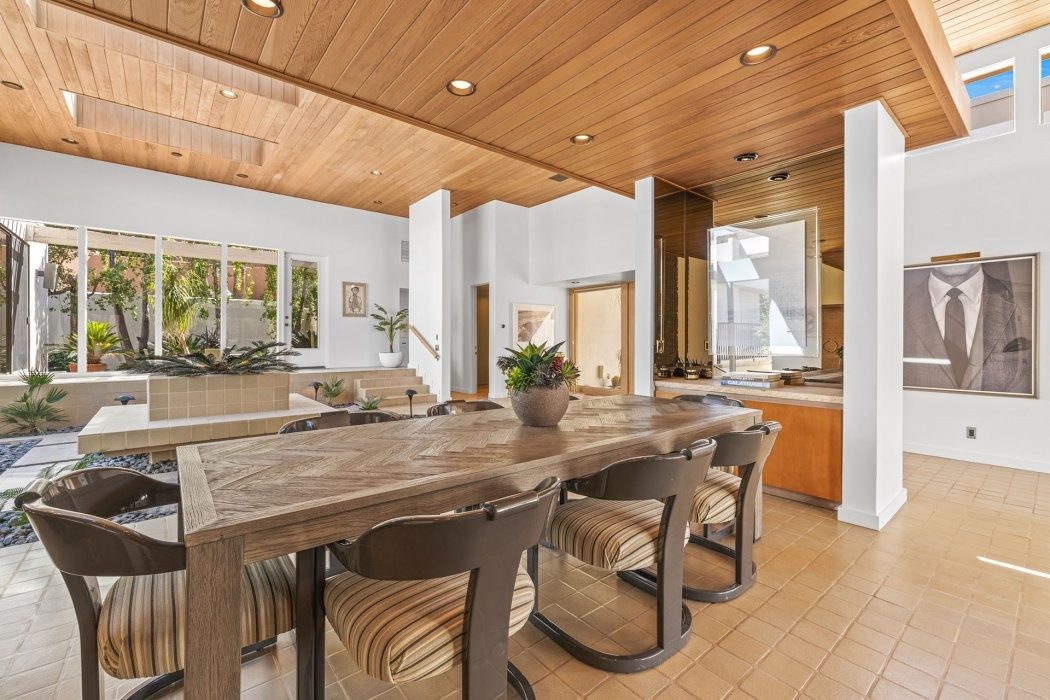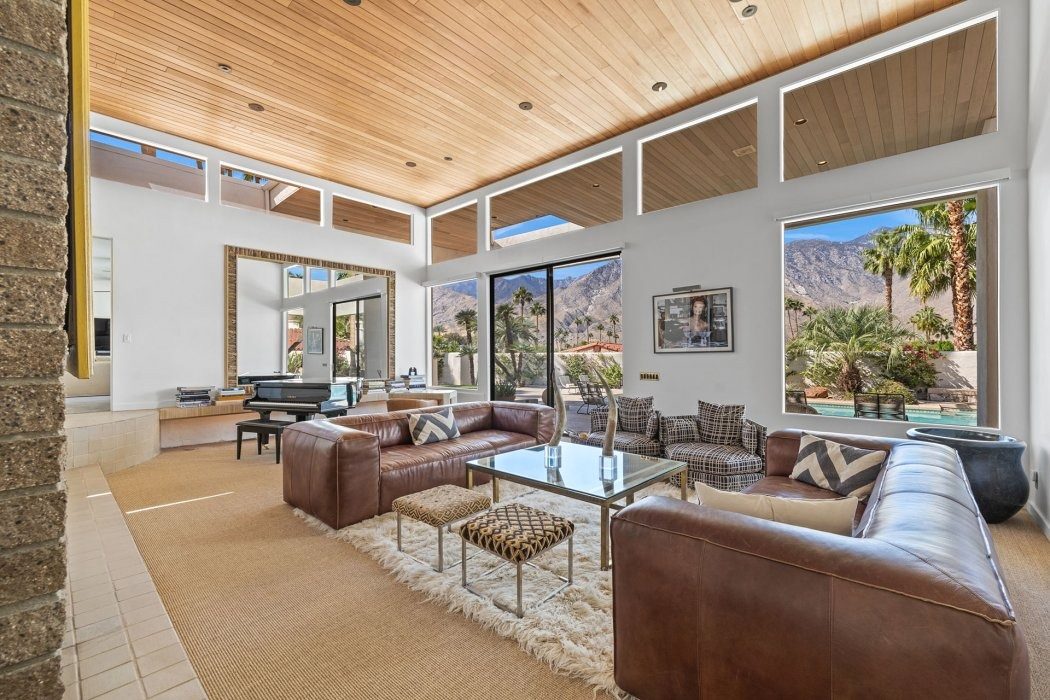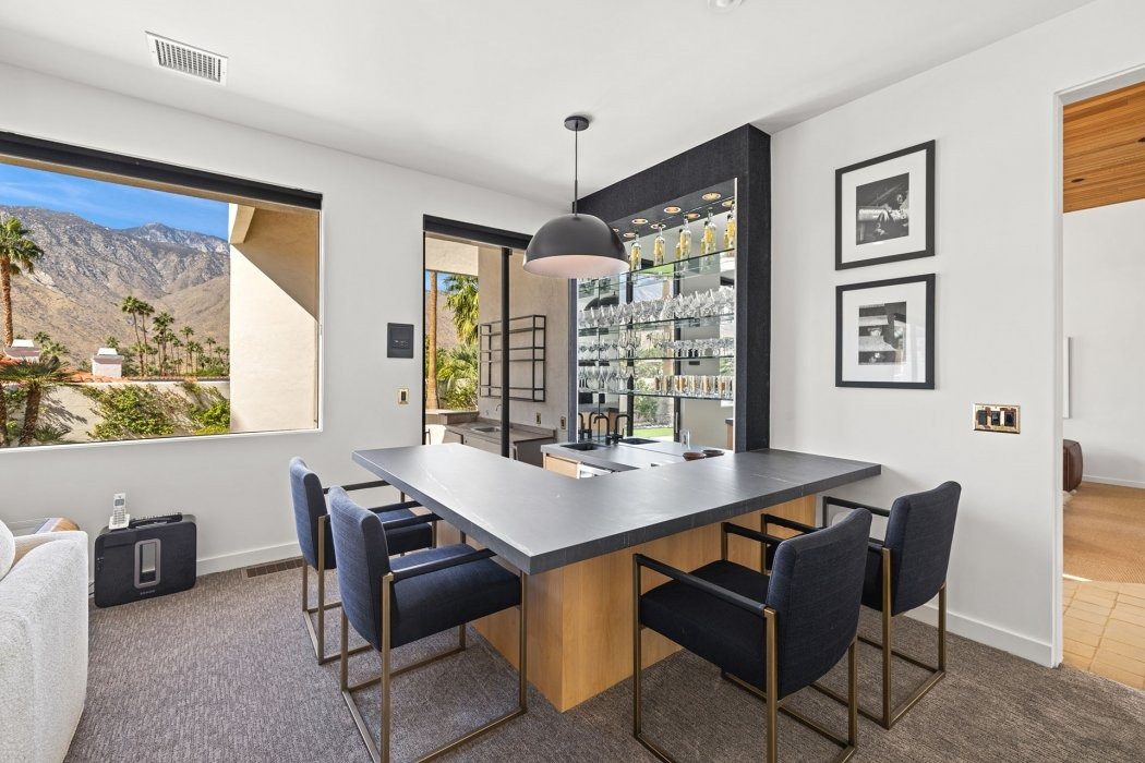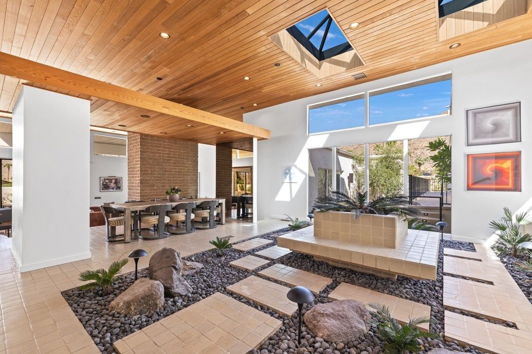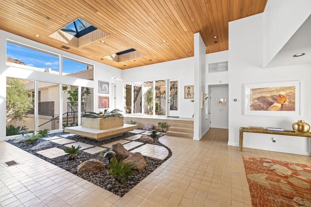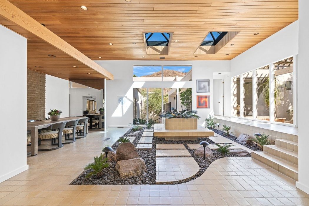 Walls of glass, vaulted ceilings, skylights, and even indoor planters bring the desert’s natural beauty inside. The spacious living areas include a posh sunken lounge with grand piano and statement fireplace, an elevated formal dining room for 8, a media room with large-screen TV and wet bar, and a chef’s kitchen with granite countertops, high-end appliances, and casual dining space.