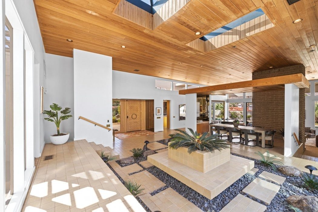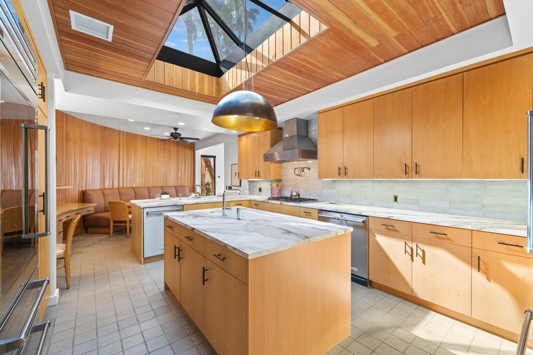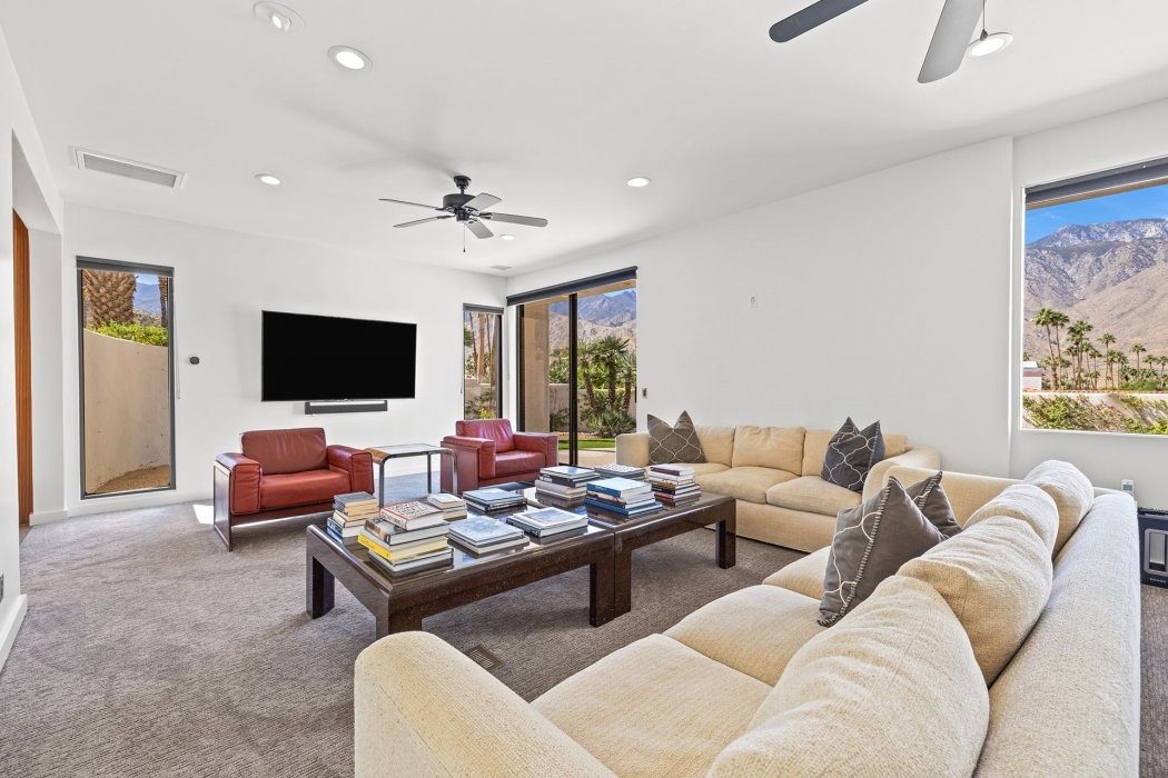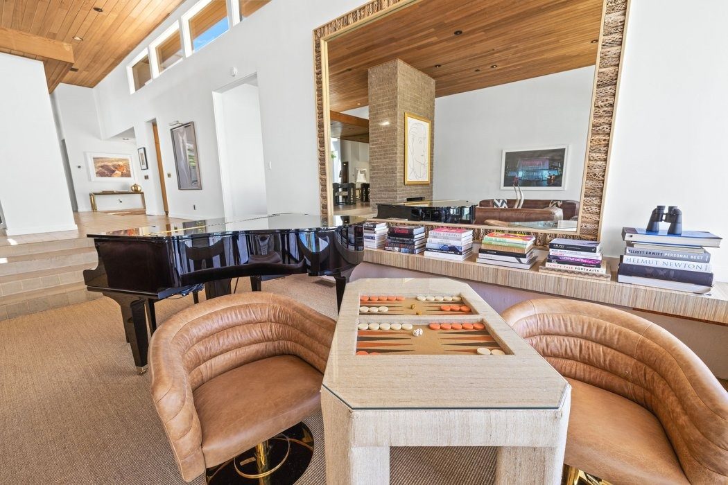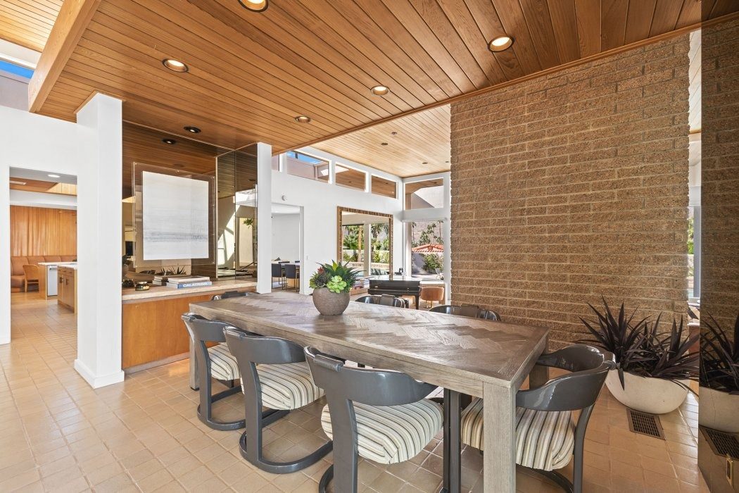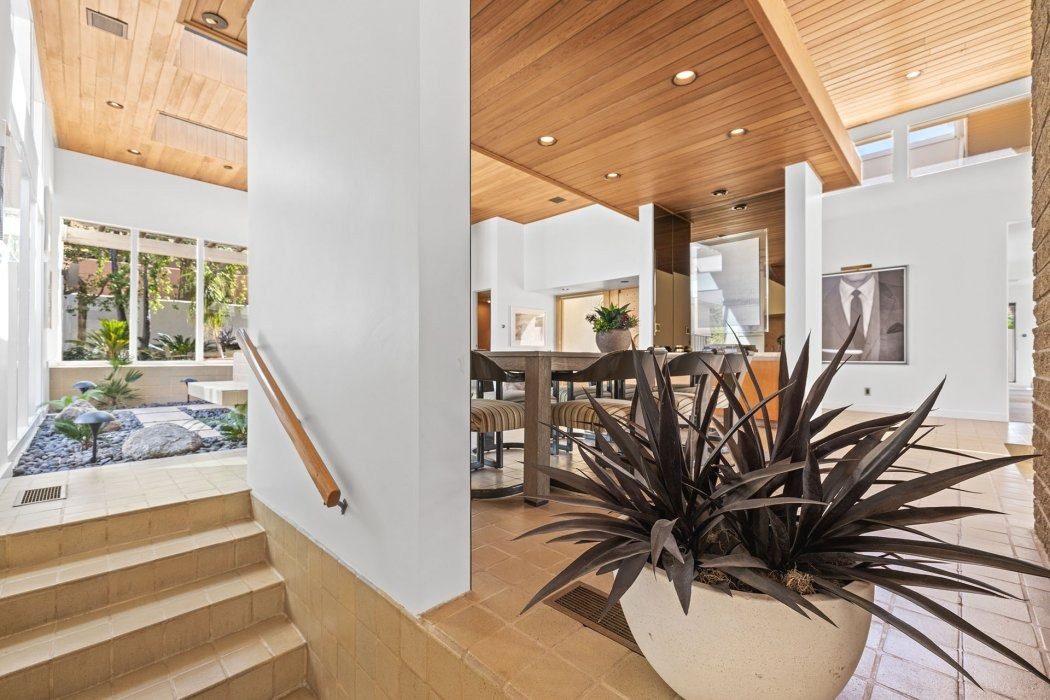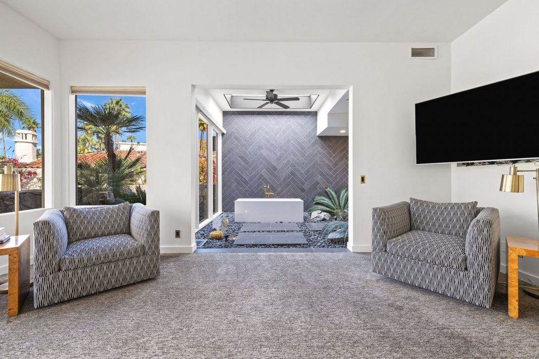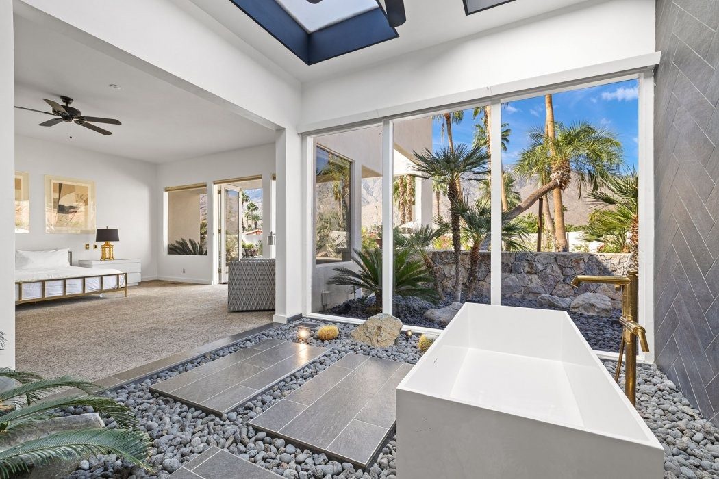 Walls of glass, vaulted ceilings, skylights, and even indoor planters bring the desert’s natural beauty inside. The spacious living areas include a posh sunken lounge with grand piano and statement fireplace, an elevated formal dining room for 8, a media room with large-screen TV and wet bar, and a chef’s kitchen with granite countertops, high-end appliances, and casual dining space.