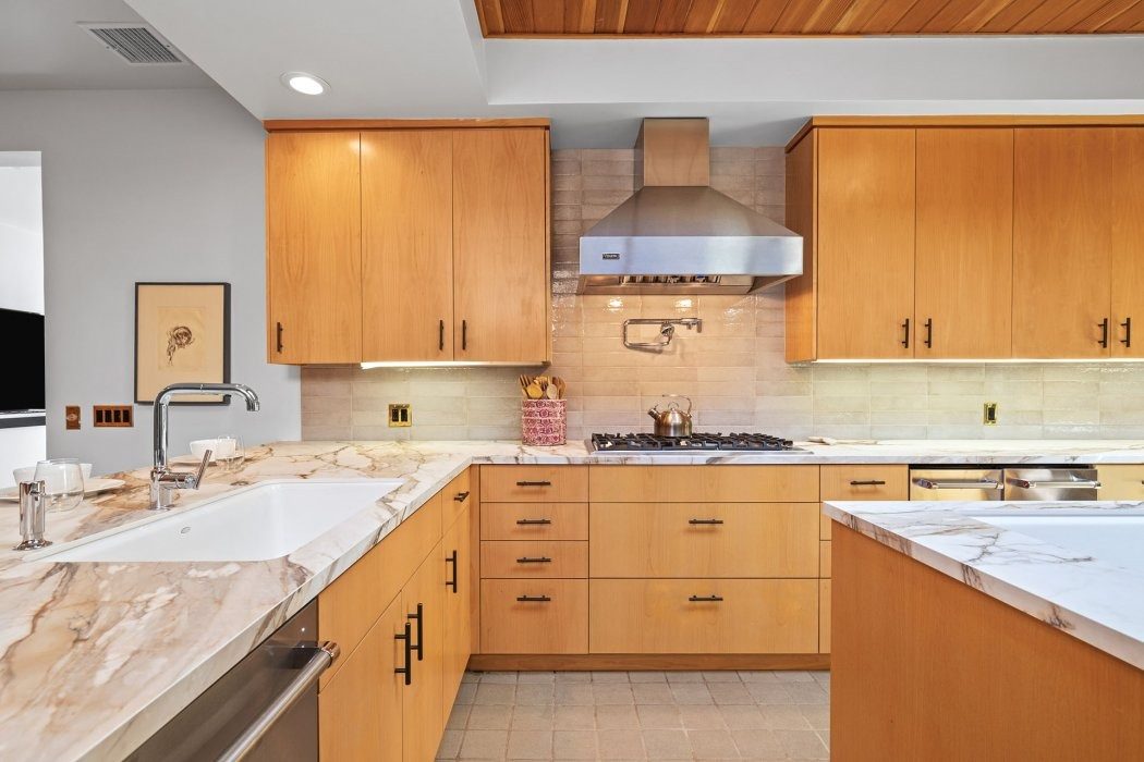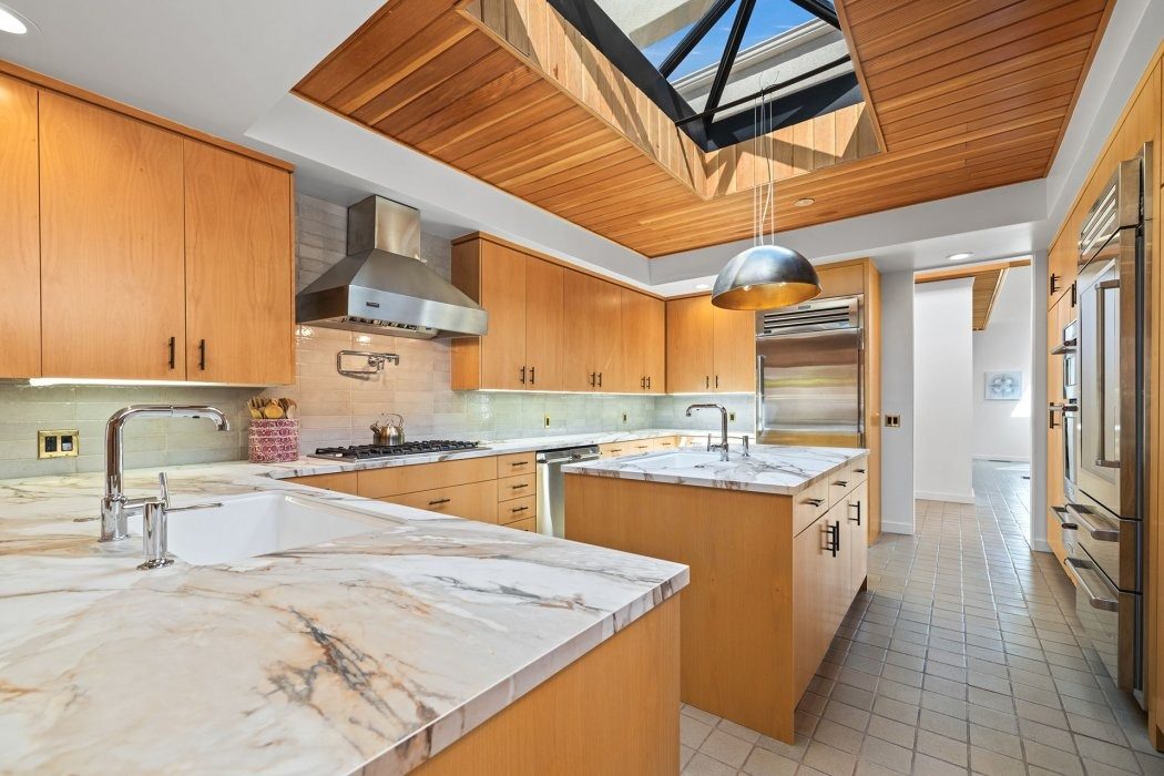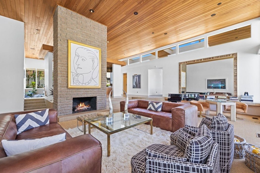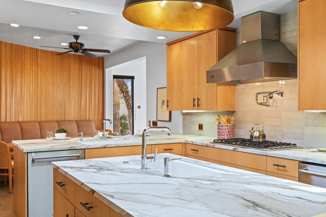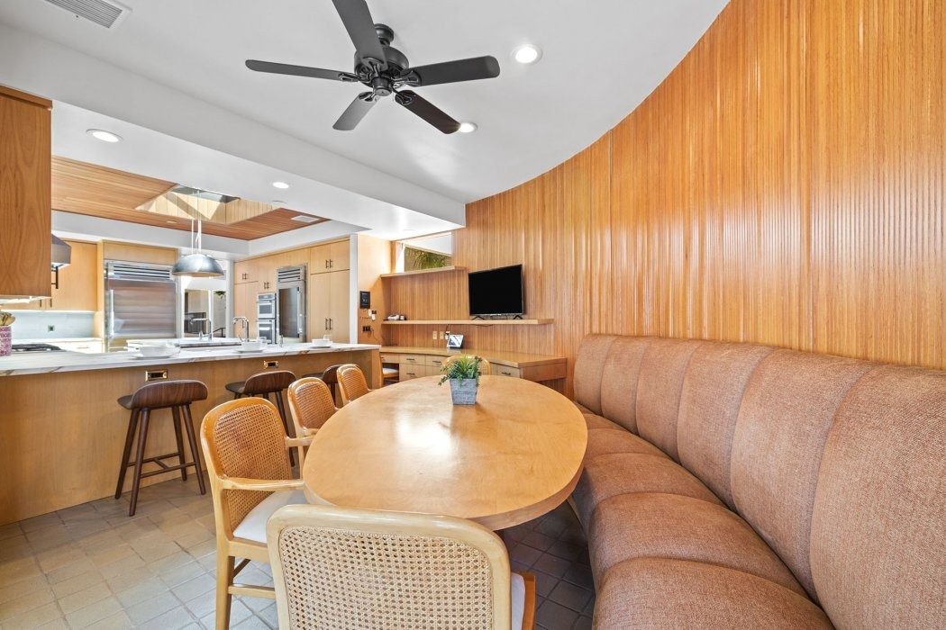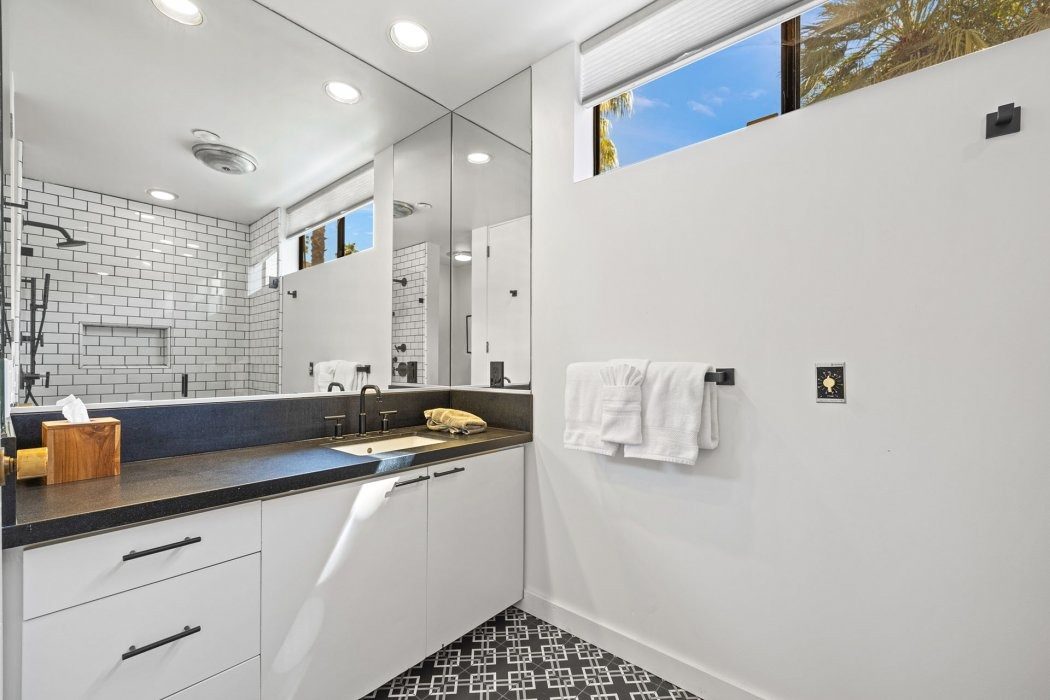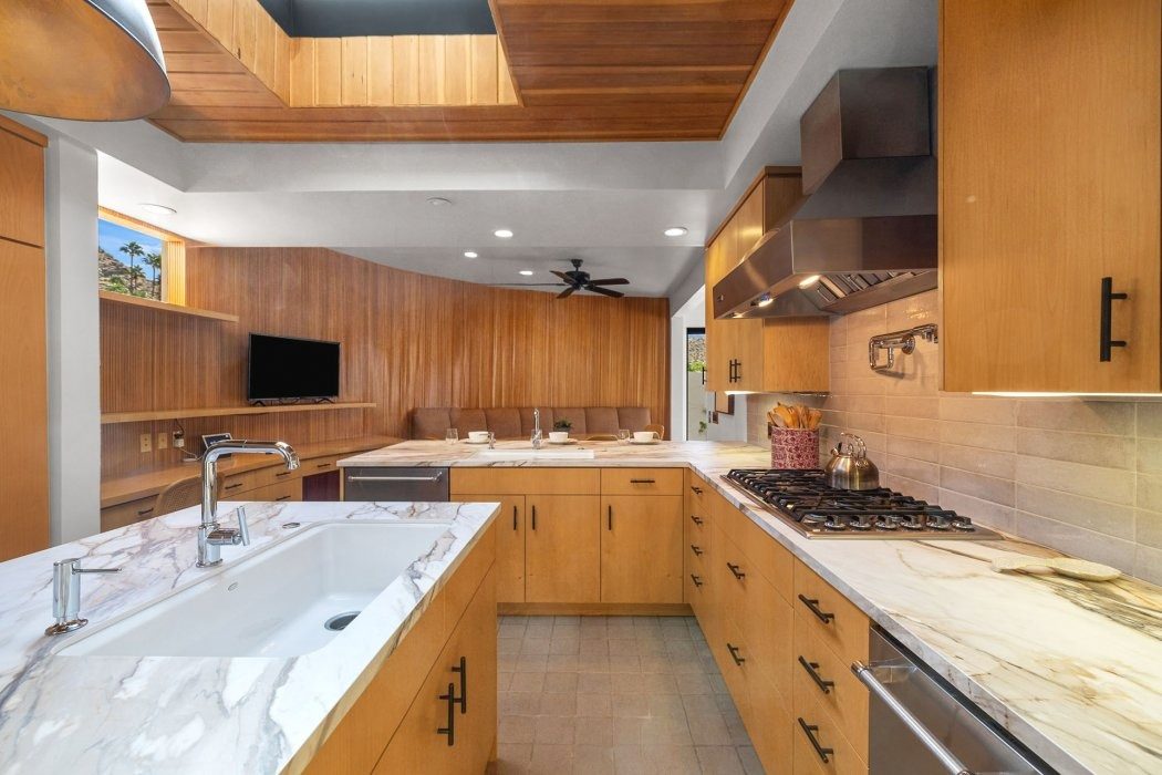 Walls of glass, vaulted ceilings, skylights, and even indoor planters bring the desert’s natural beauty inside. The spacious living areas include a posh sunken lounge with grand piano and statement fireplace, an elevated formal dining room for 8, a media room with large-screen TV and wet bar, and a chef’s kitchen with granite countertops, high-end appliances, and casual dining space.