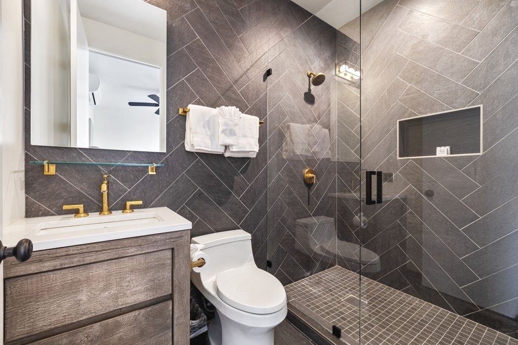 Bedroom 2: King bed, sliding doors to outdoors, en suite bath with shower.