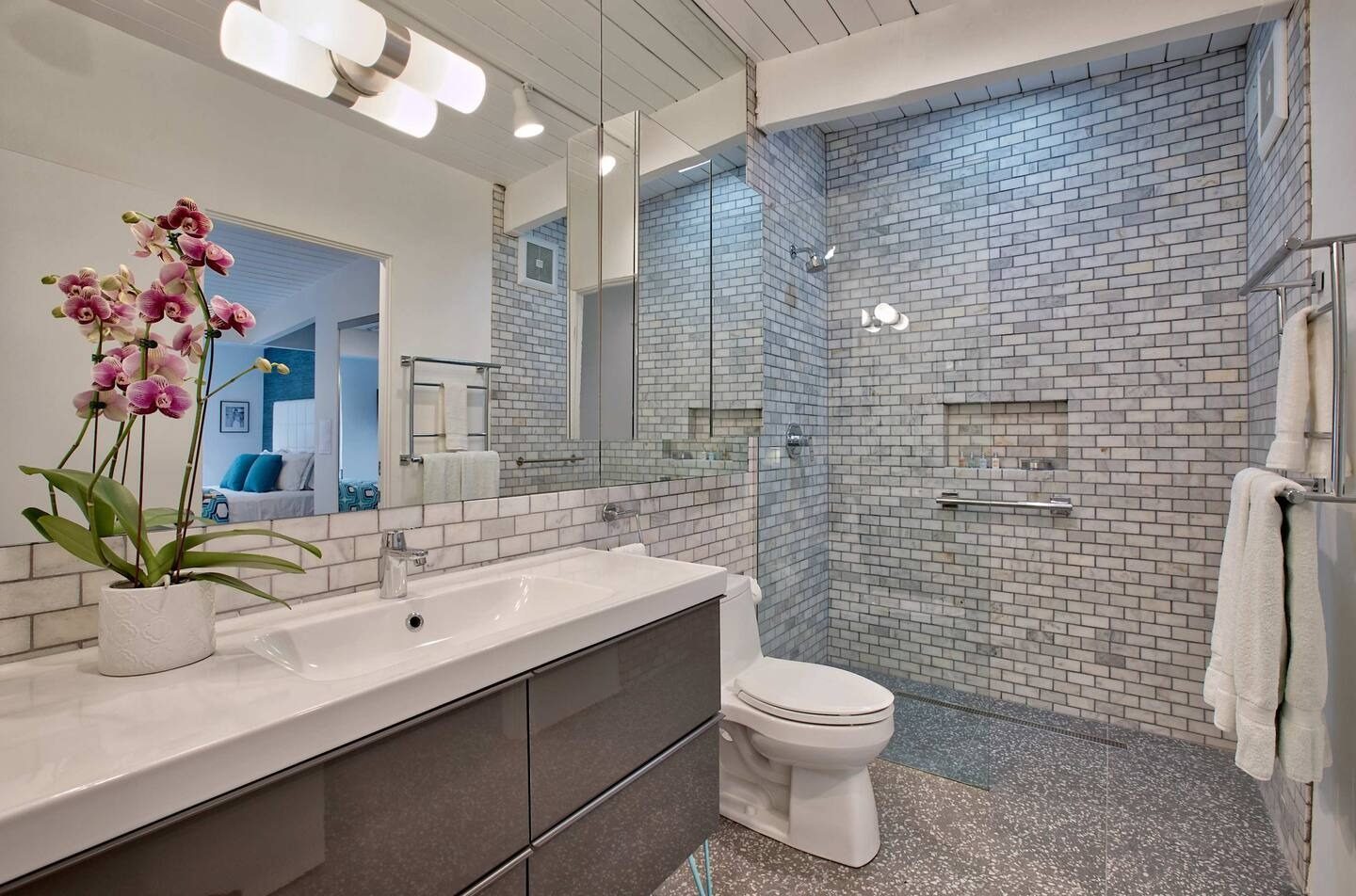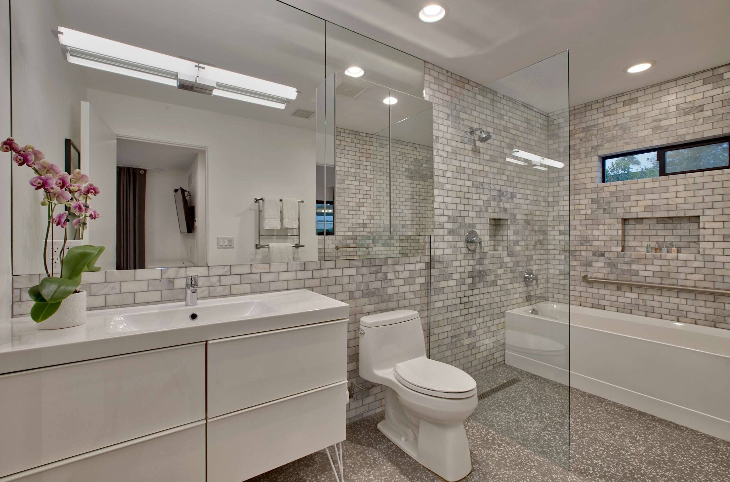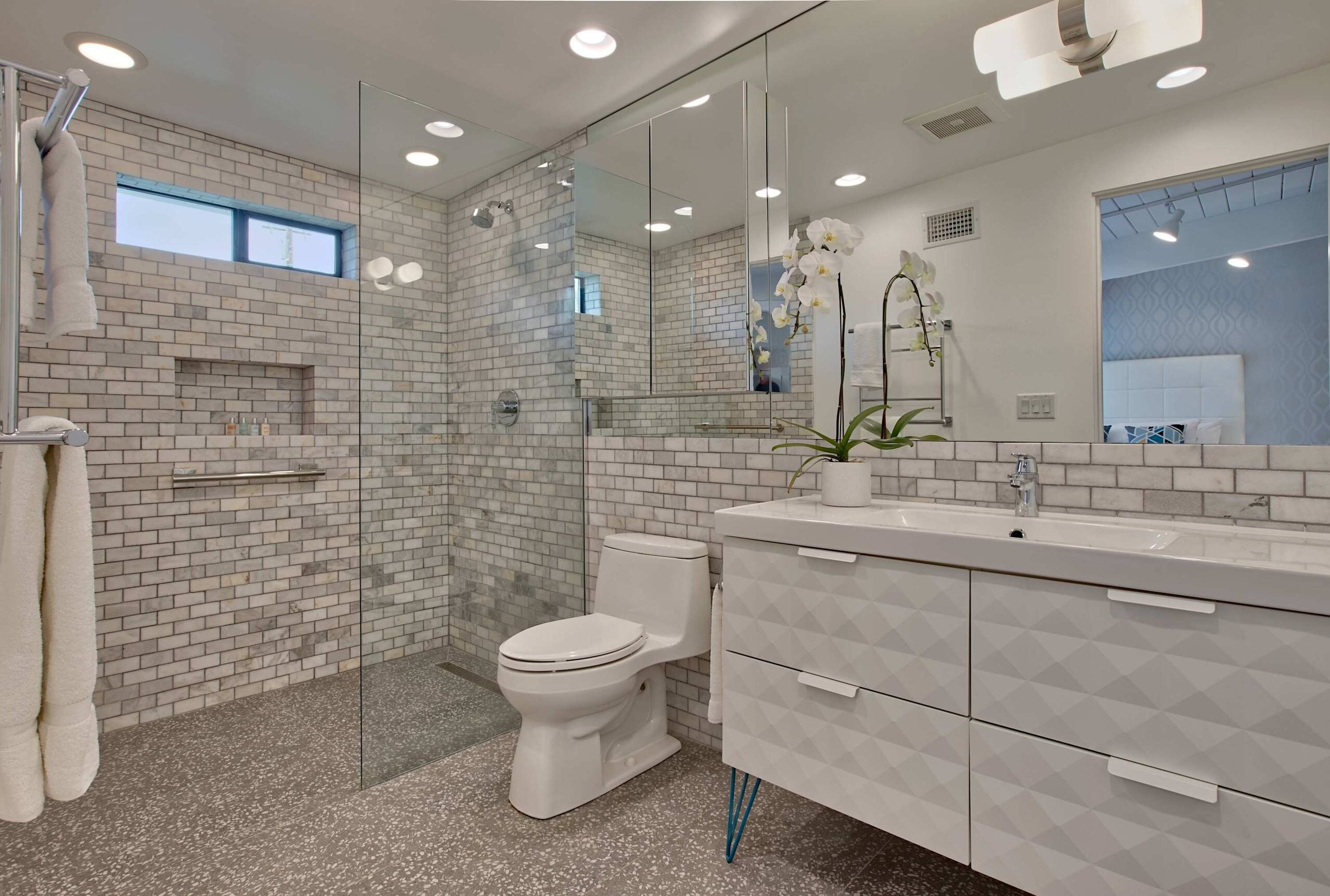 Six modern bathrooms featuring clean lines, updated fixtures, and hotel-style finishes.