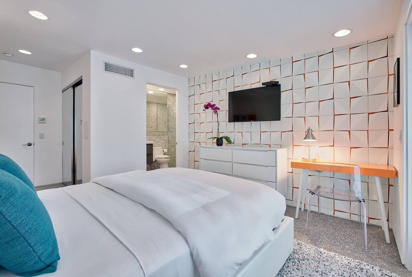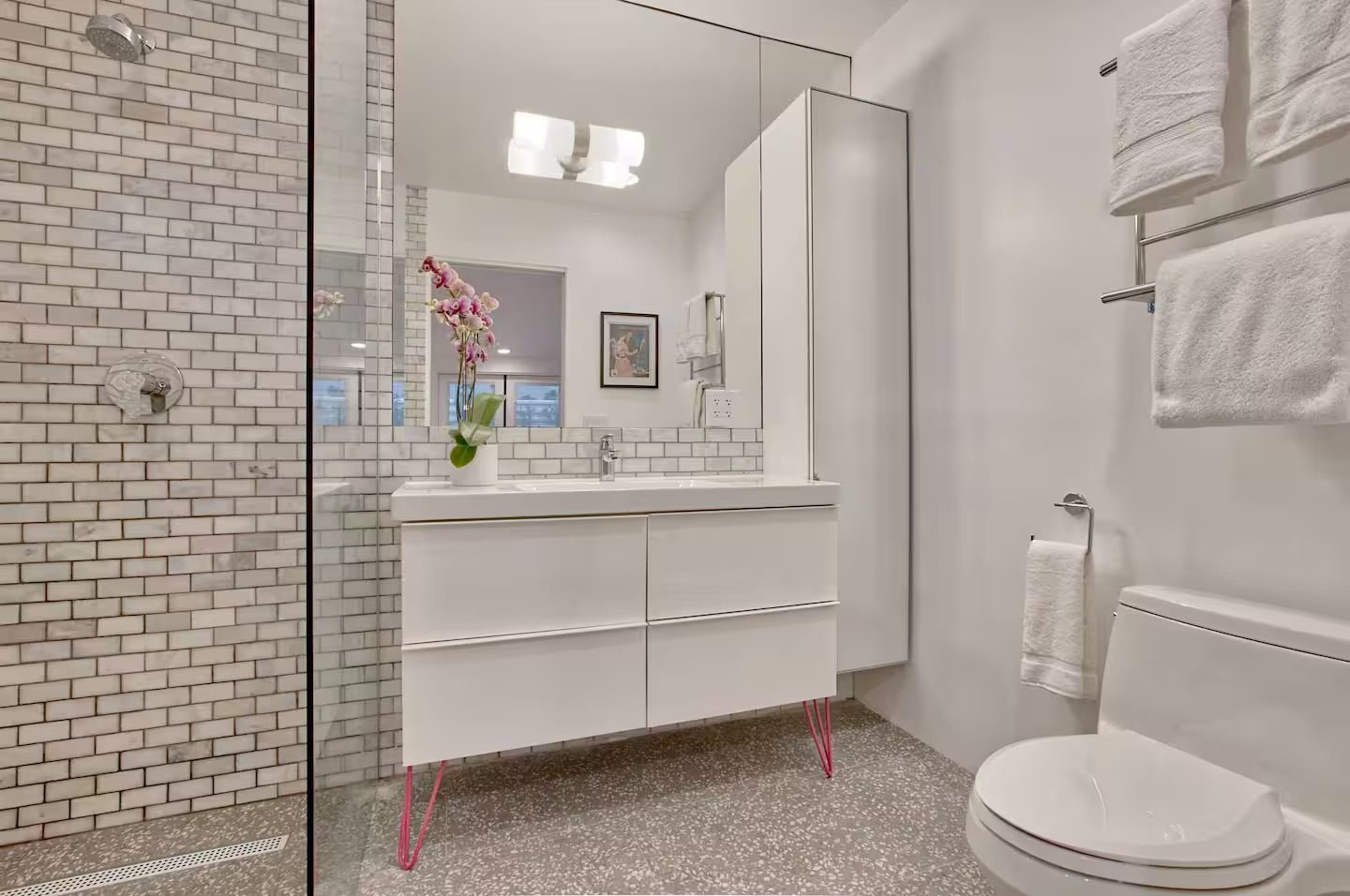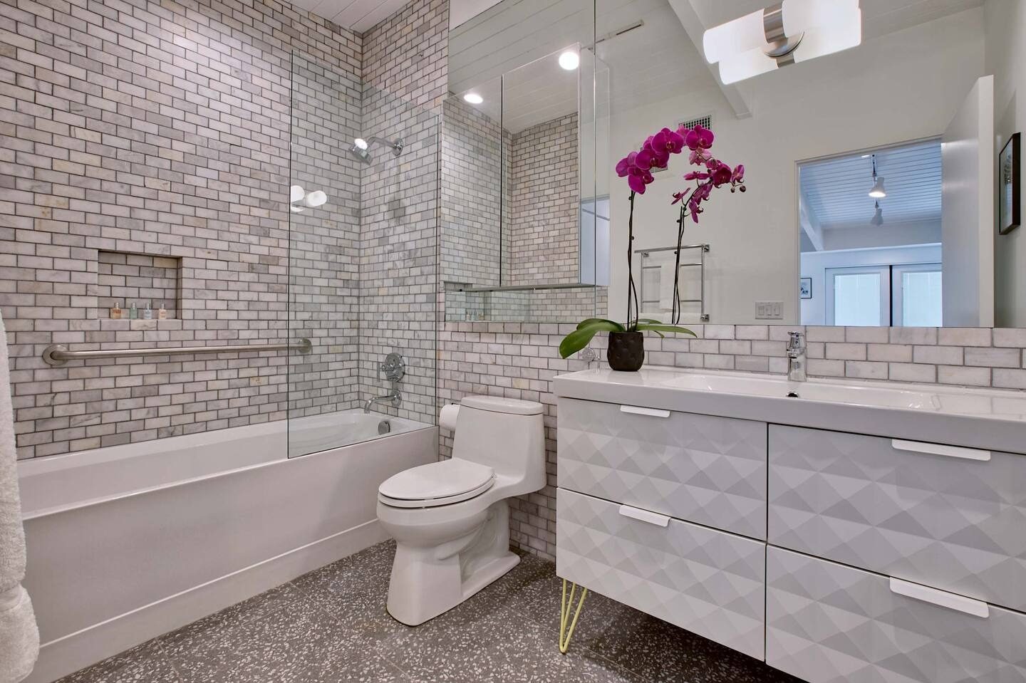Six modern bathrooms featuring clean lines, updated fixtures, and hotel-style finishes.