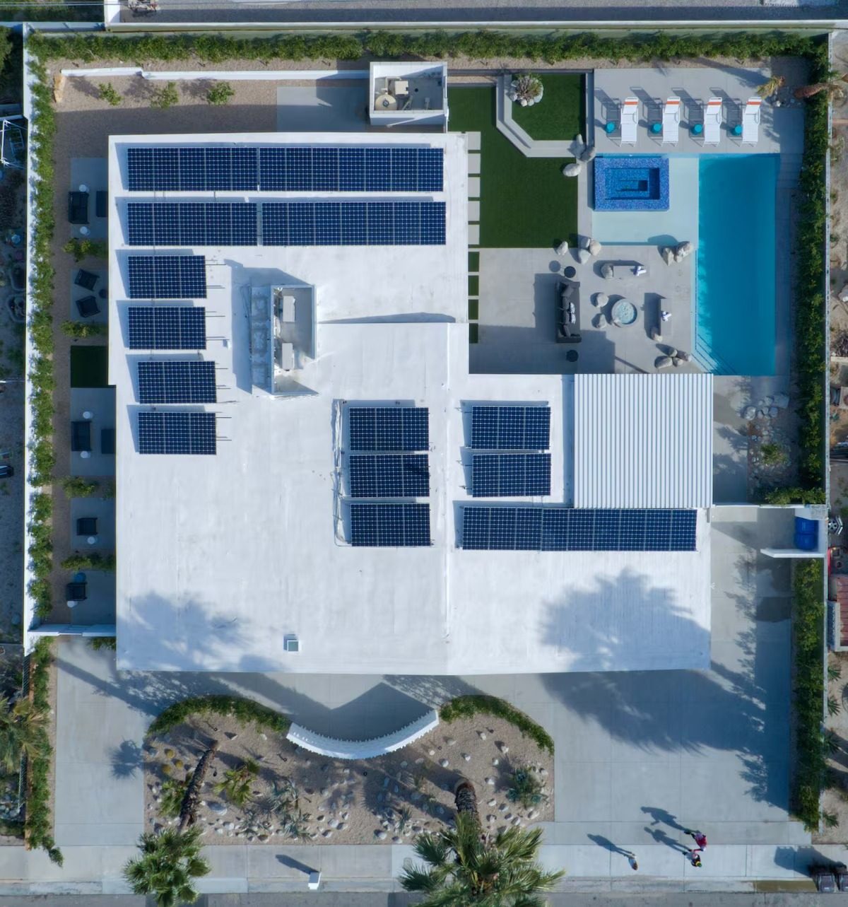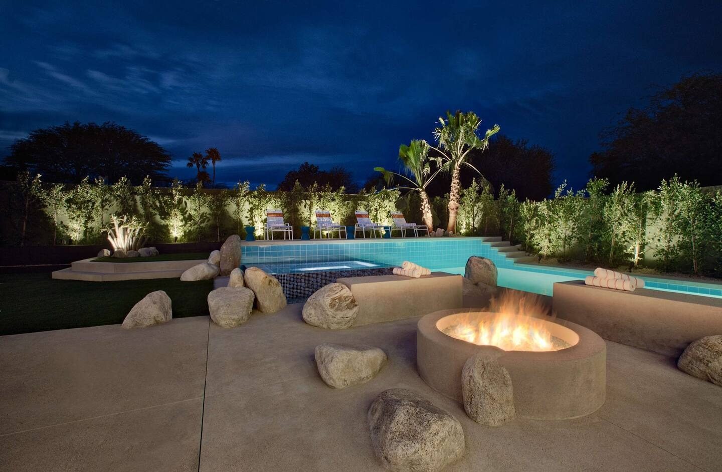 Private pool framed by palm-lined outdoor lounges, ideal for sunbathing, relaxing, or evening conversations under desert skies.