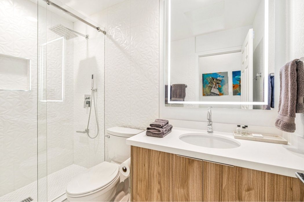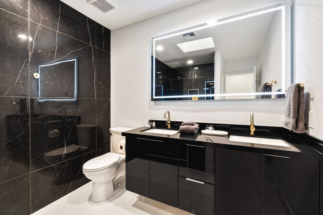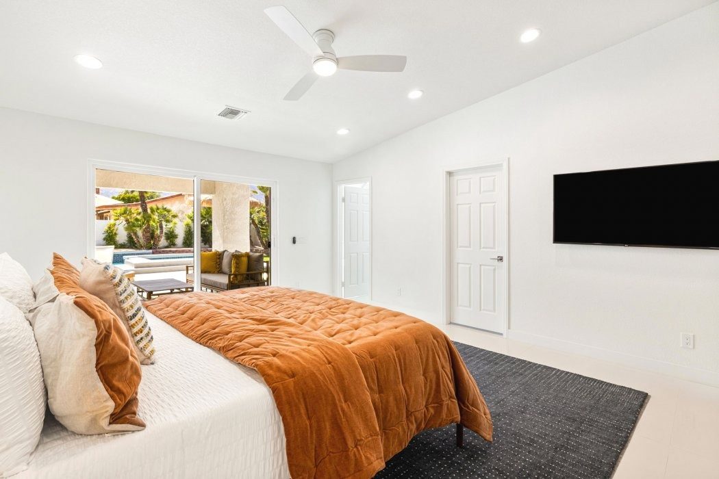 Master Suite: King bed, flatscreen TV, pool access, and spa-style en suite with soaking tub, dual vanities, and LED mirror.