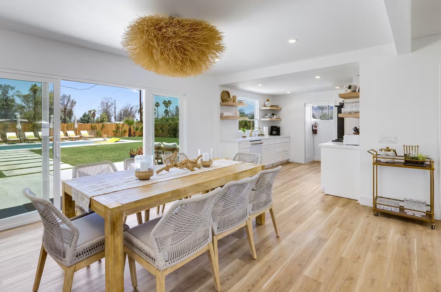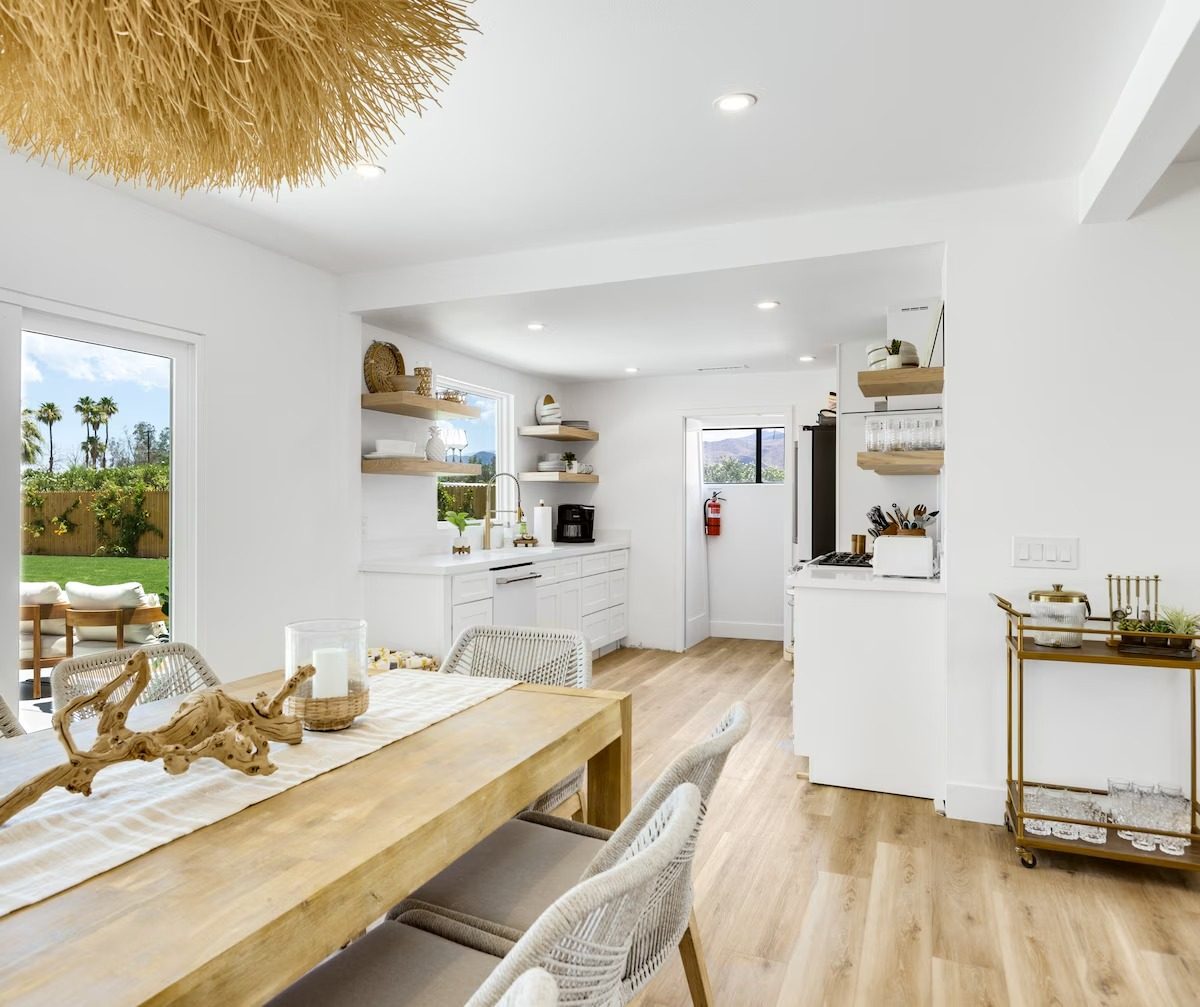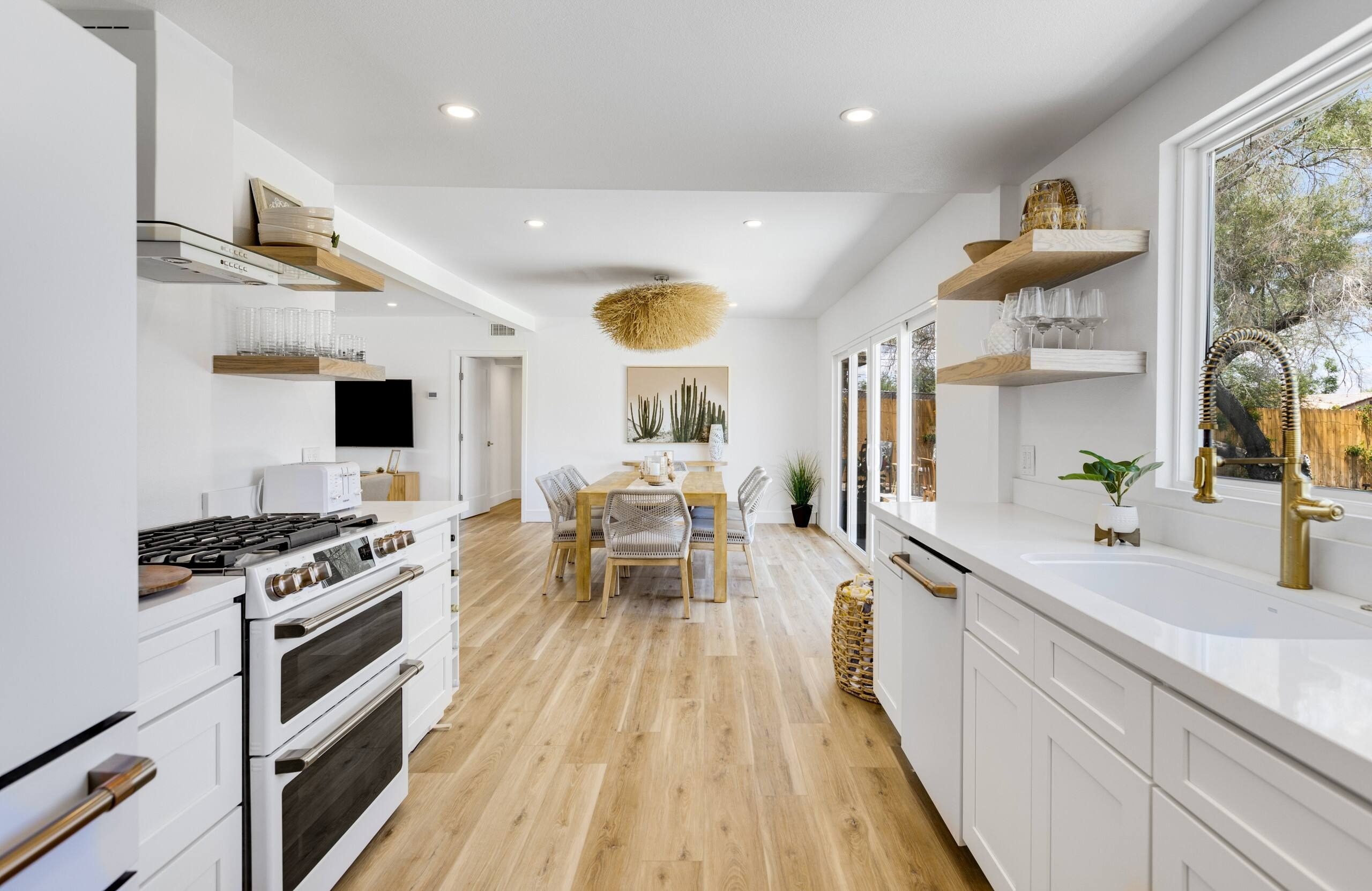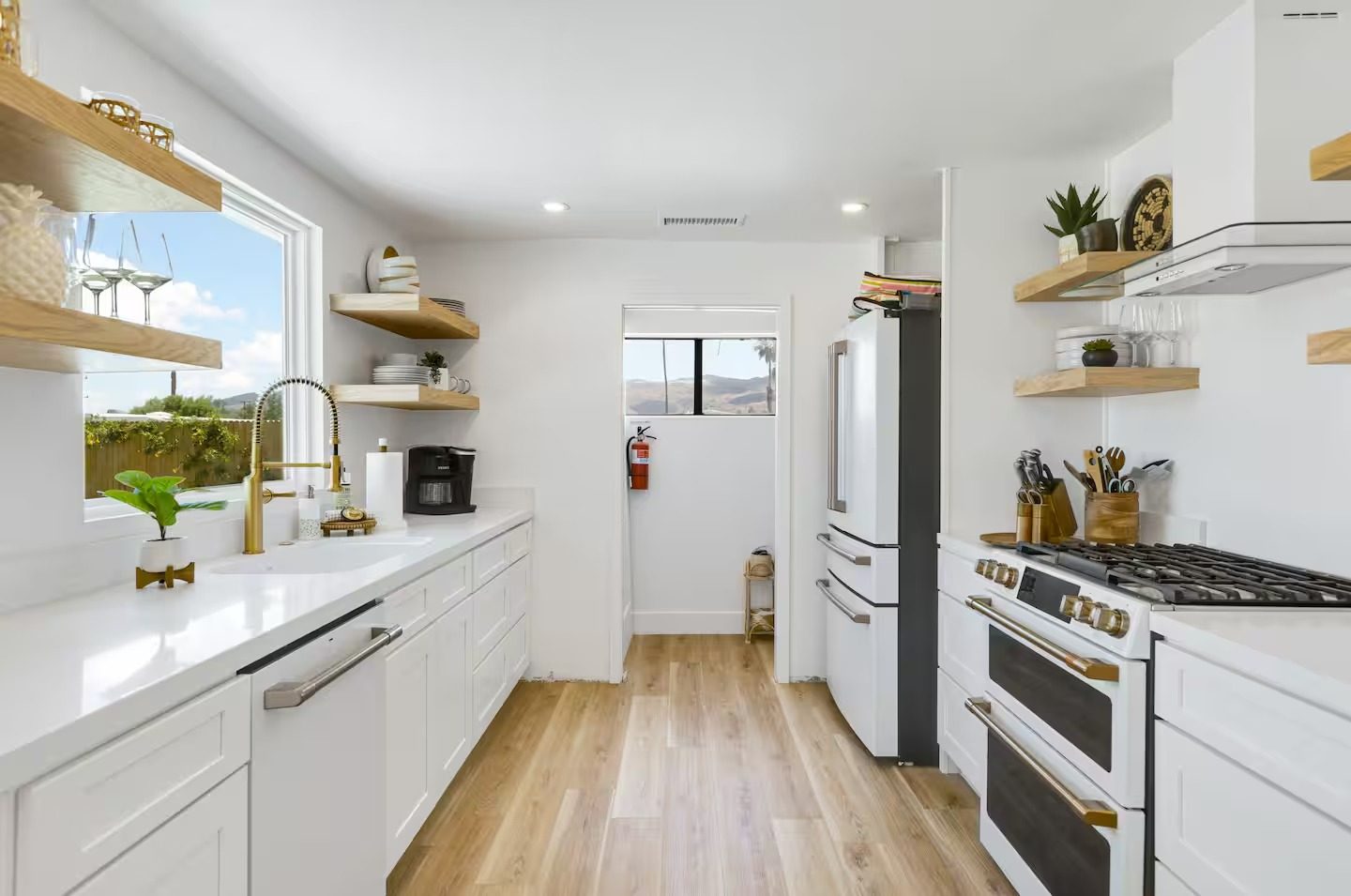 Fully equipped kitchen: A kitchen outfitted with quality appliances, cookware, and dinnerware — suitable for home-cooked meals or group dining.