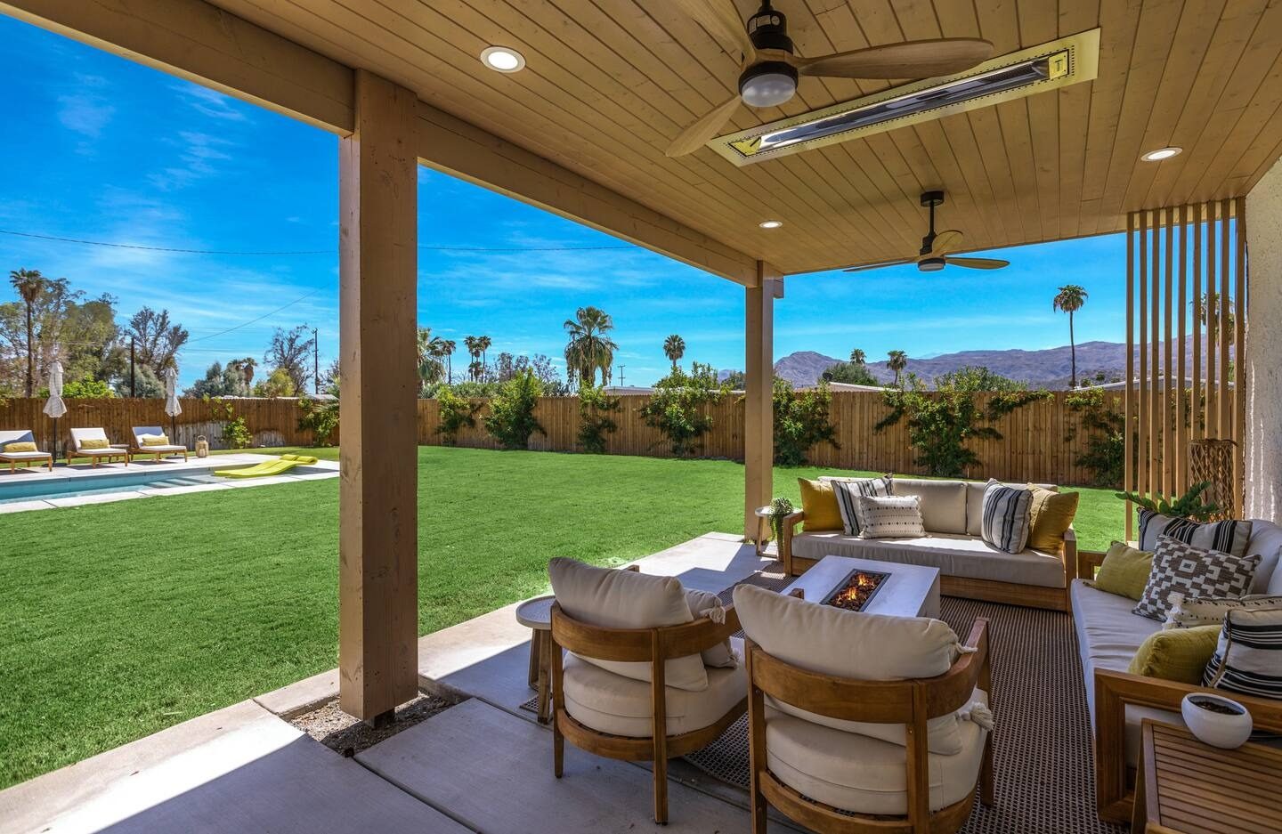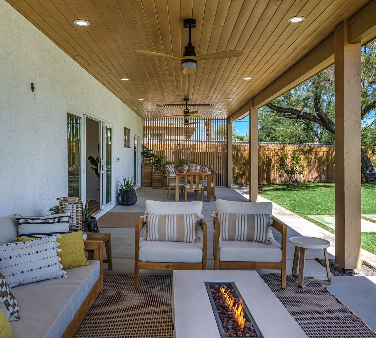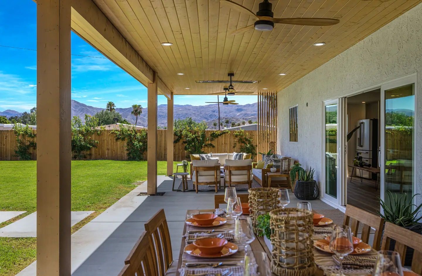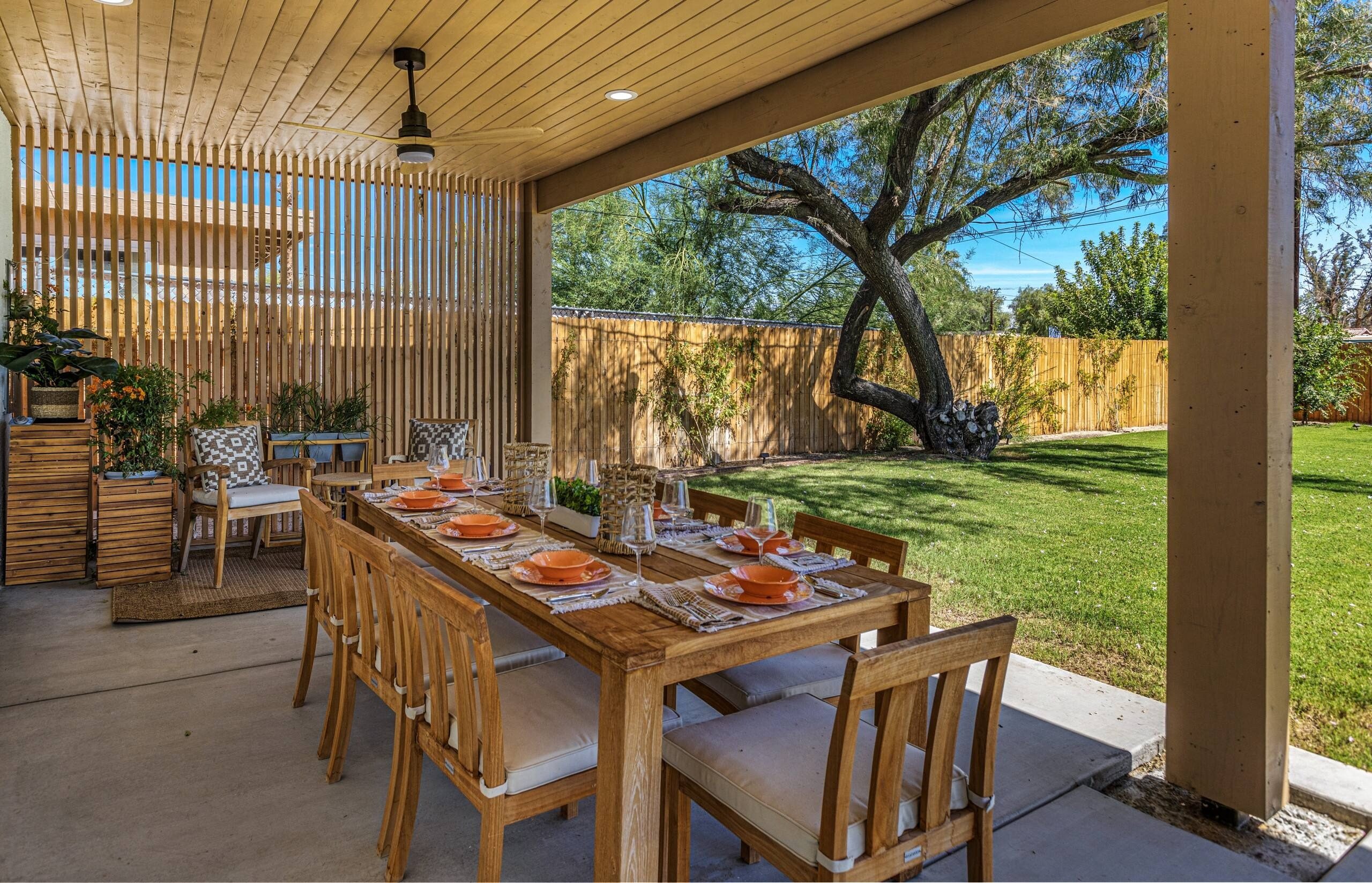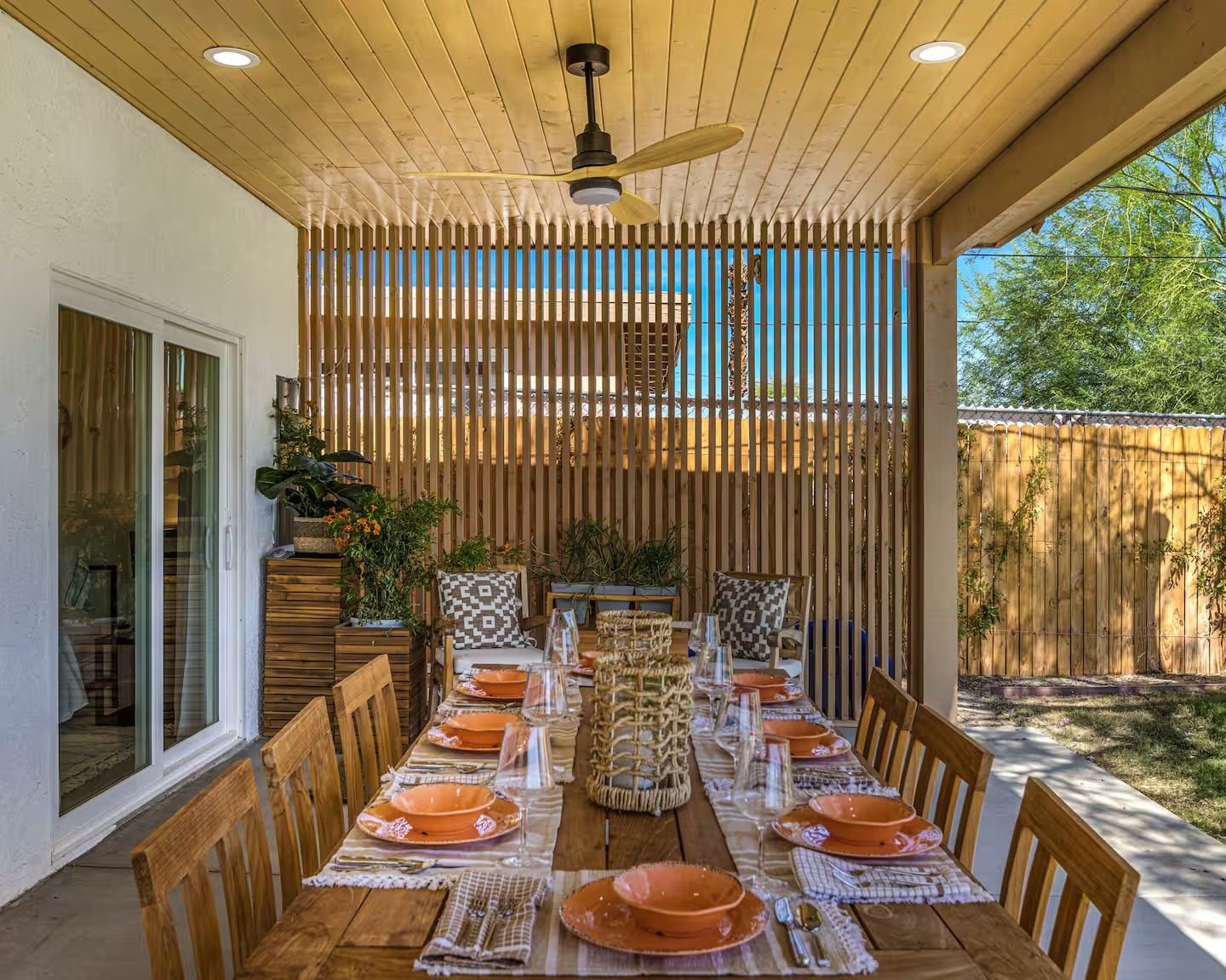 Outdoor living zones: Patio, terrace or garden spaces arranged for outdoor dining, morning coffee, evening drinks, or casual socializing under the open sky.