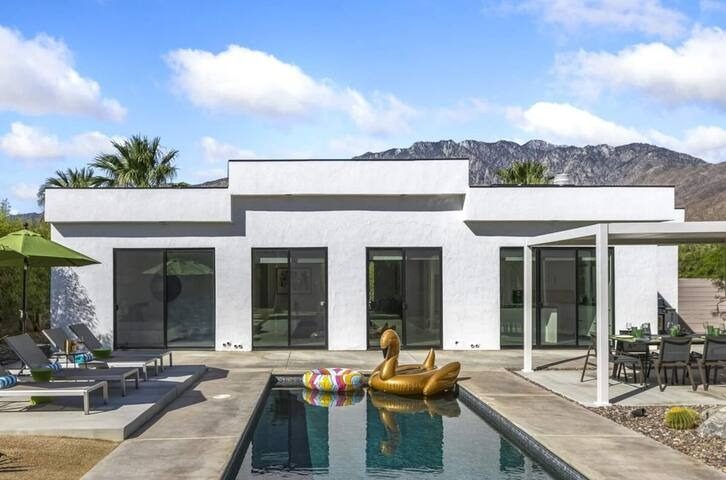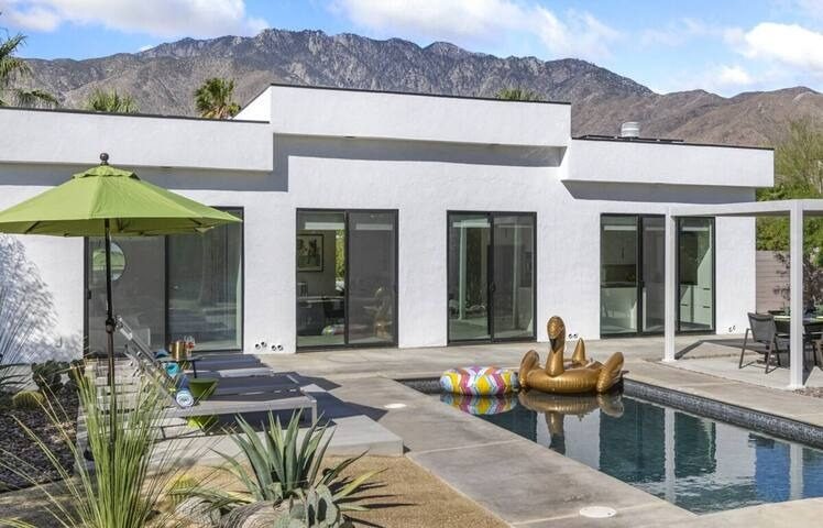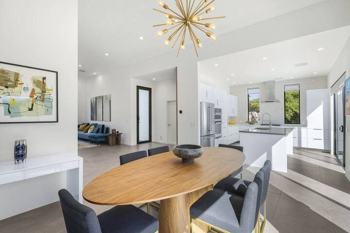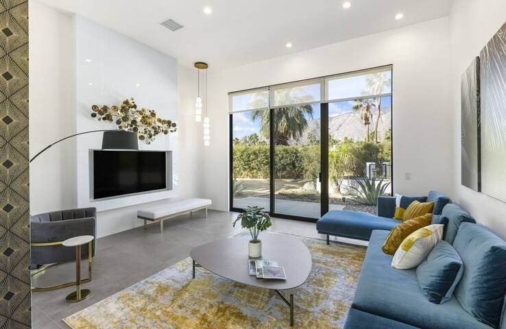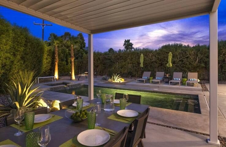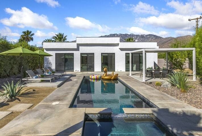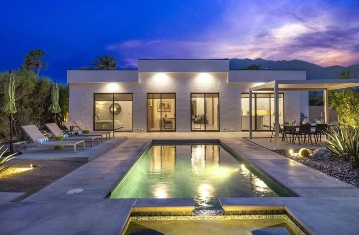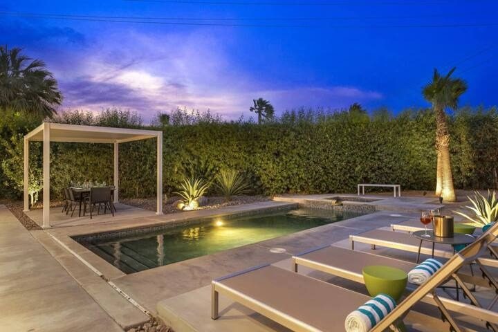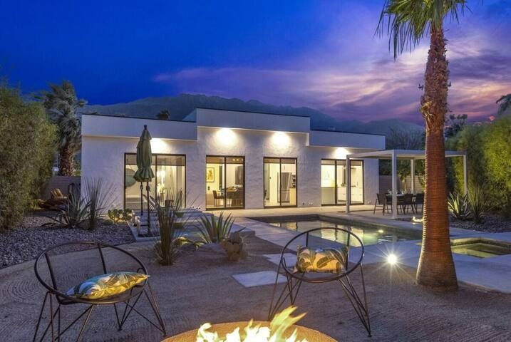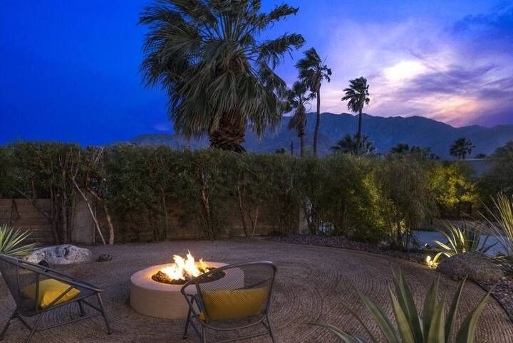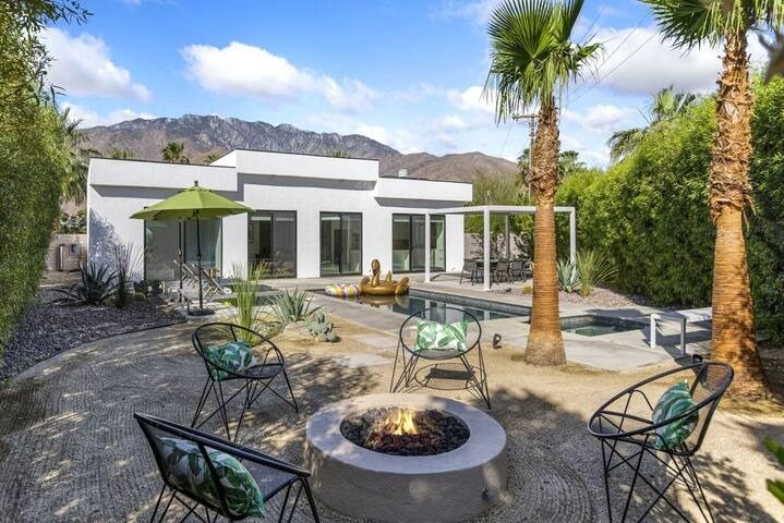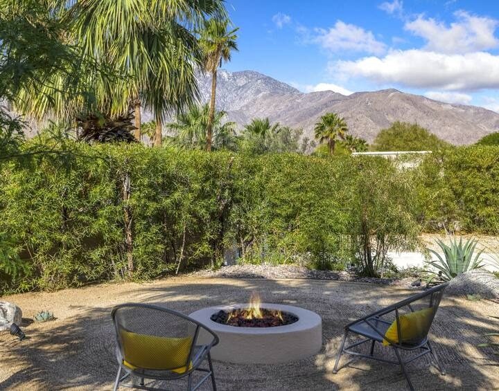 Completely remodeled in 2021, Villa Veridian blends sleek modern design with high-end comfort. Soaring ceilings, brand-new finishes, and curated furnishings set the tone for a luxury stay. Relax in the spacious living room with stunning mountain views, or step into your private backyard oasis with a sparkling pool, spa, firepits, and outdoor dining under the palms.