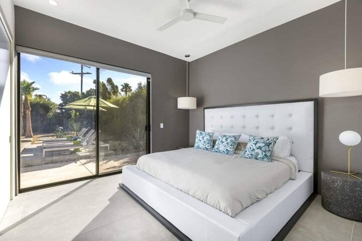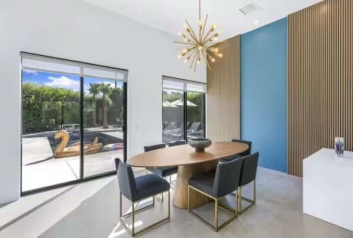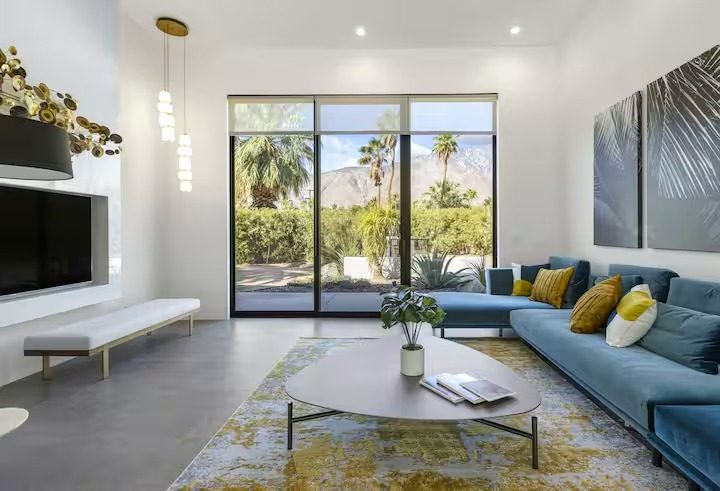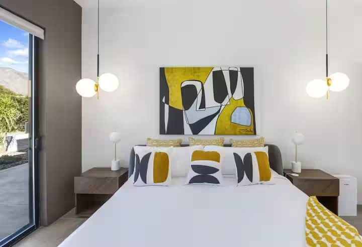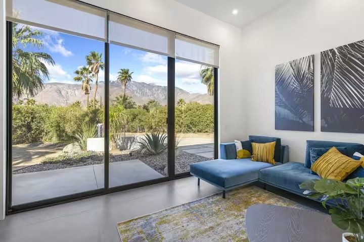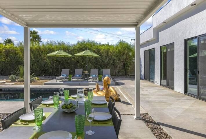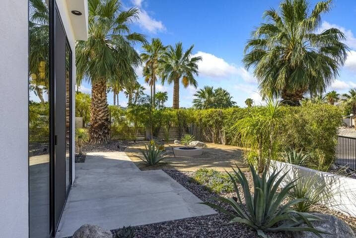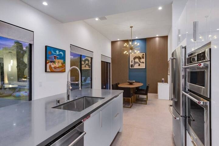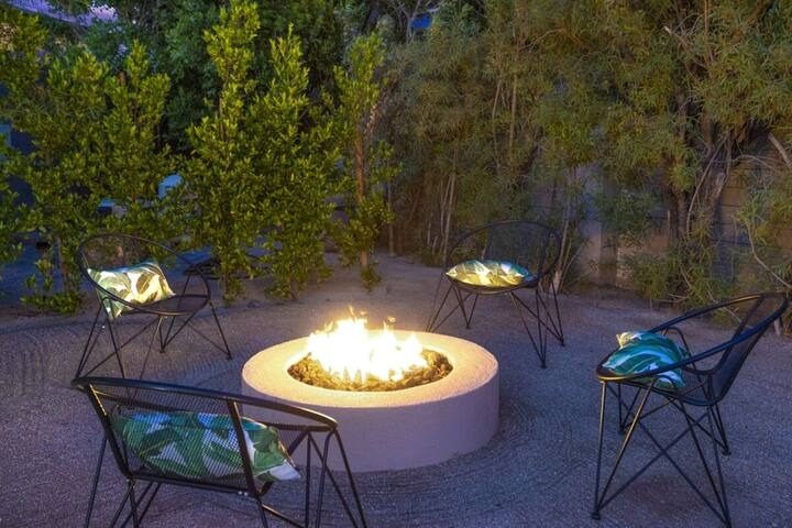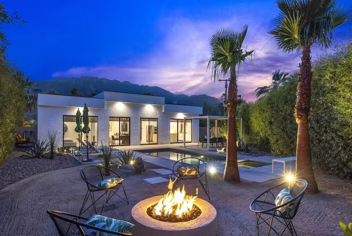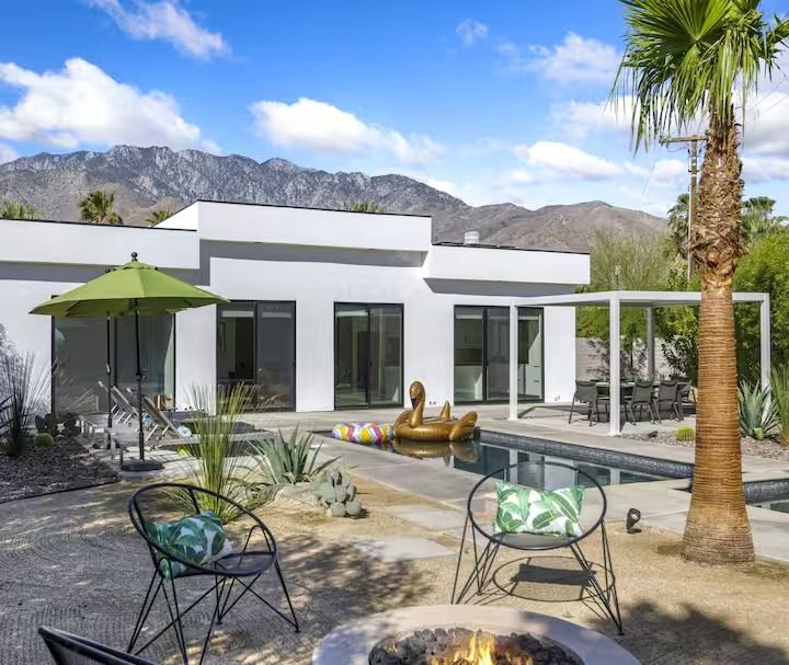 Completely remodeled in 2021, Villa Veridian blends sleek modern design with high-end comfort. Soaring ceilings, brand-new finishes, and curated furnishings set the tone for a luxury stay. Relax in the spacious living room with stunning mountain views, or step into your private backyard oasis with a sparkling pool, spa, firepits, and outdoor dining under the palms.