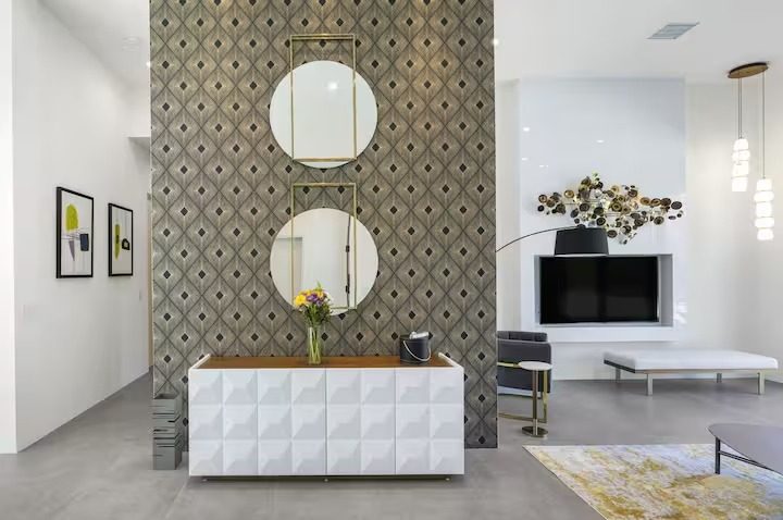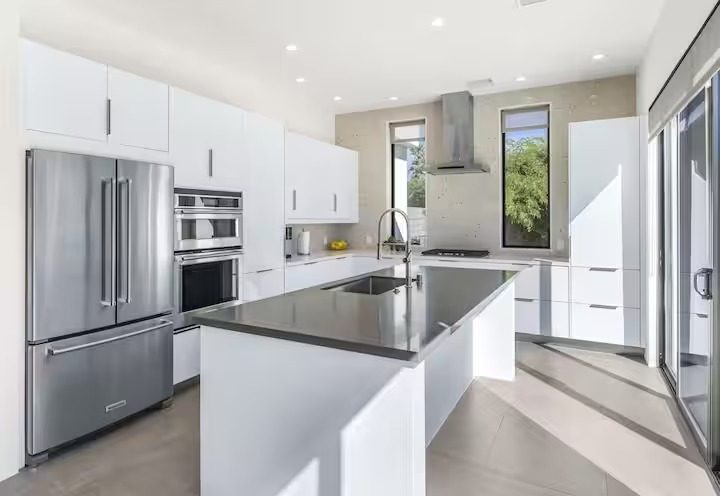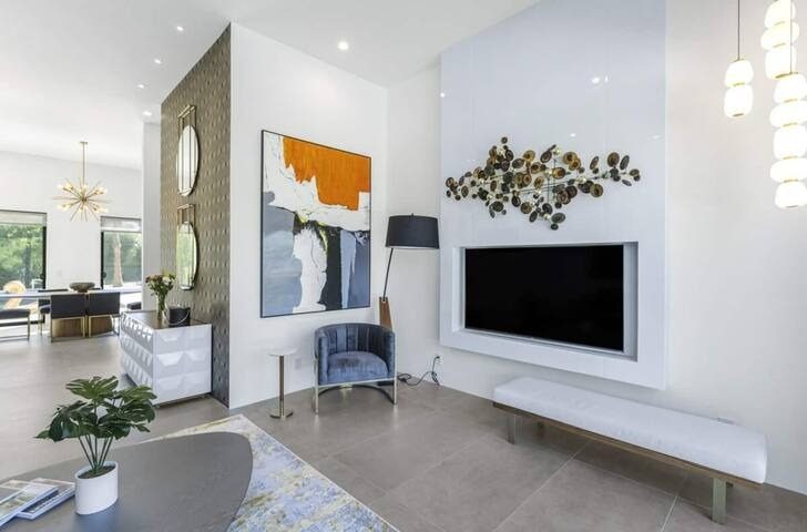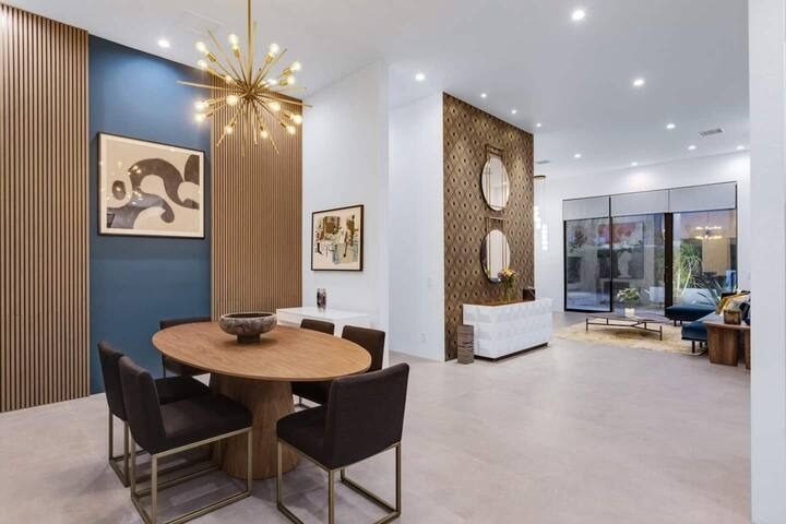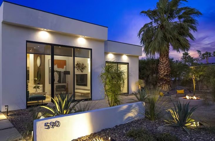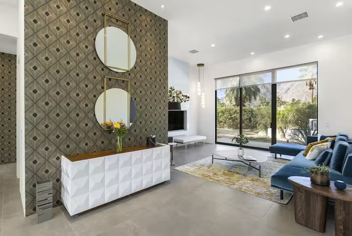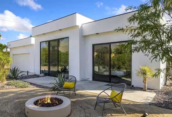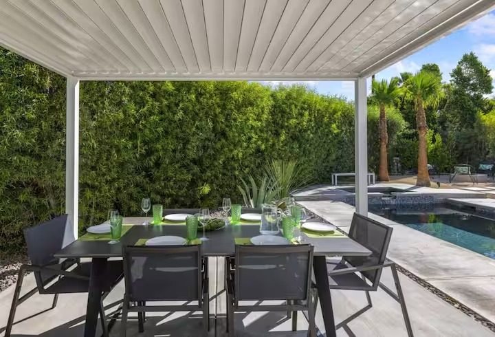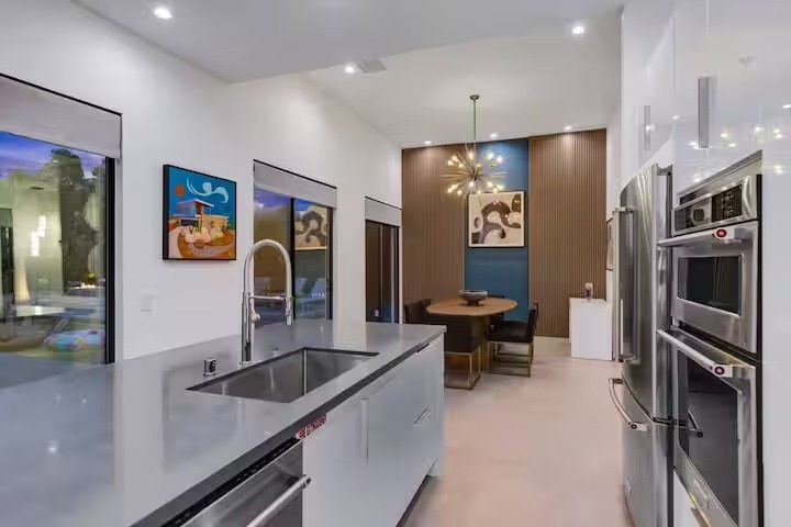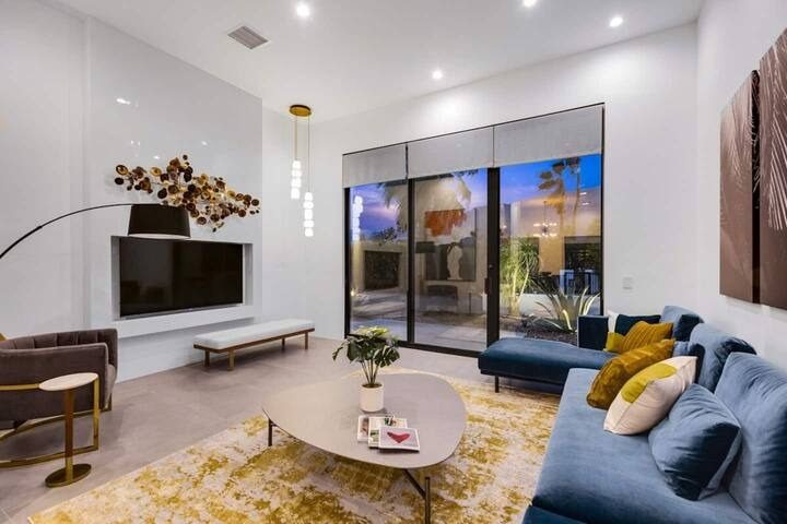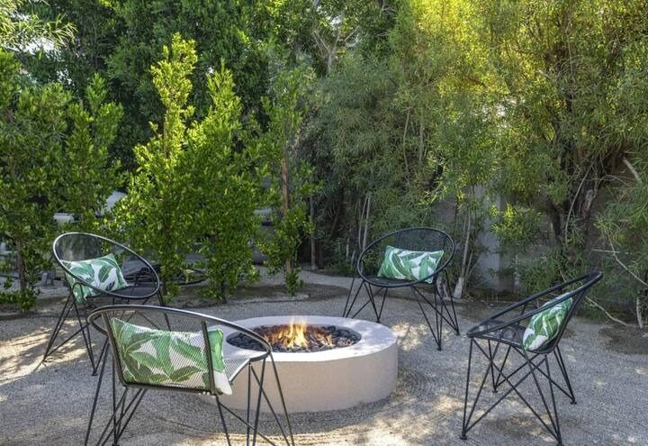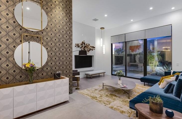 Completely remodeled in 2021, Villa Veridian blends sleek modern design with high-end comfort. Soaring ceilings, brand-new finishes, and curated furnishings set the tone for a luxury stay. Relax in the spacious living room with stunning mountain views, or step into your private backyard oasis with a sparkling pool, spa, firepits, and outdoor dining under the palms.